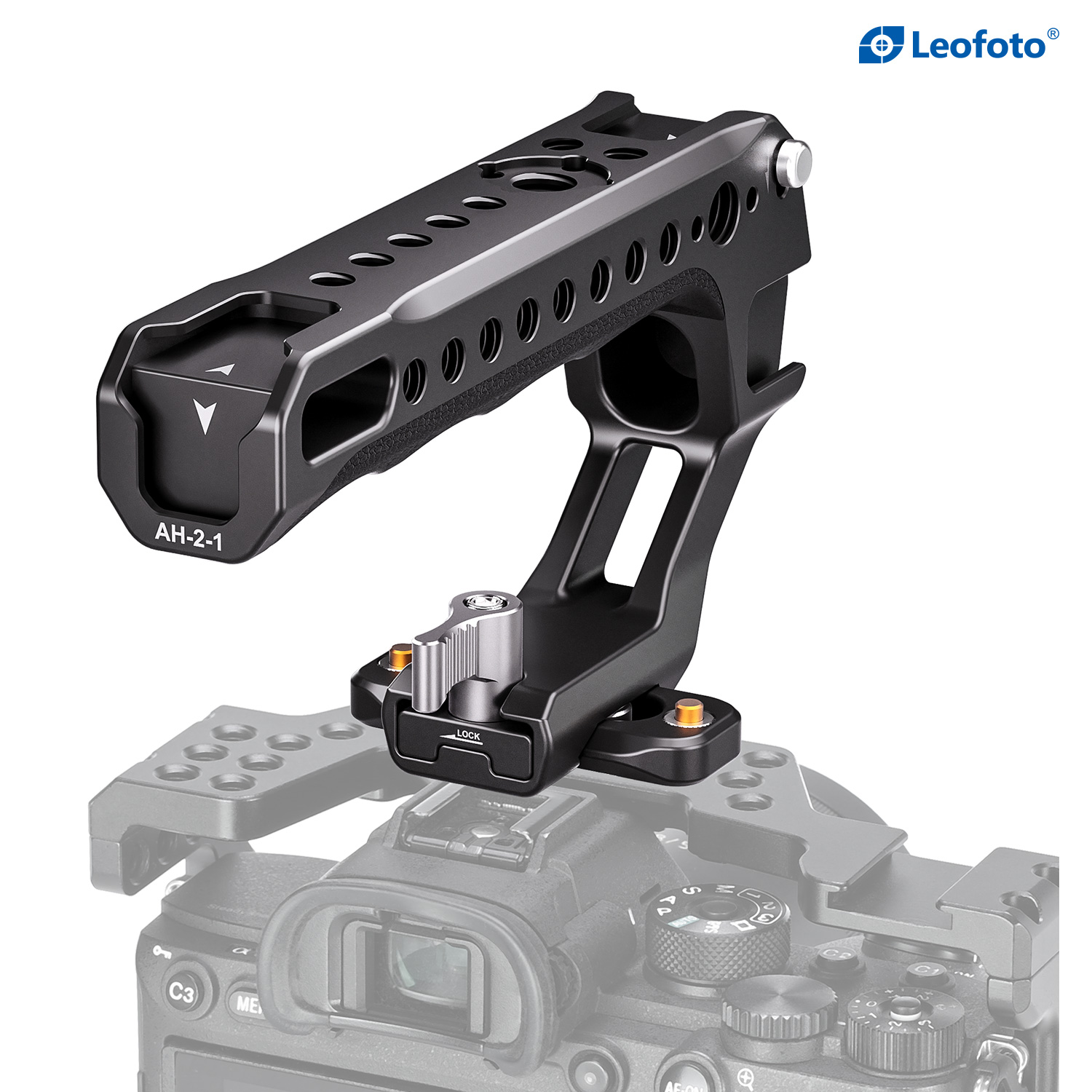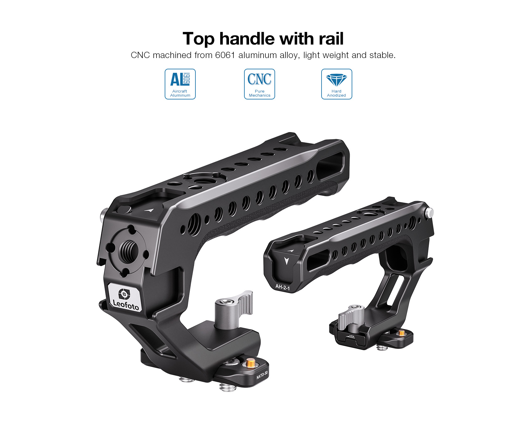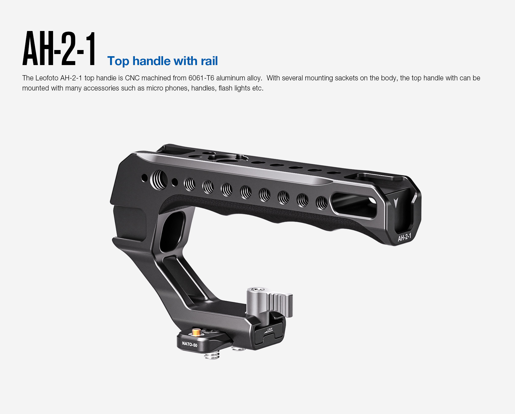 The Leofoto AH-2-1 Top Handle with NATO/Picatinny Rail is designed to facilitate low-angle shot and reduce burdens on arms. The handle is CNC machined from 6061-T6 aluminum and hard anodized making it light weight and durable and has an ergonomic silicone grip for added comfort. It features various mounting sockets along the handle that allow simultaneously mounting microphone, LED light, monitor, and other accessories. Overall, the lightweight and practical handle can provide a wide range of mounting points and an excellent shooting experience.