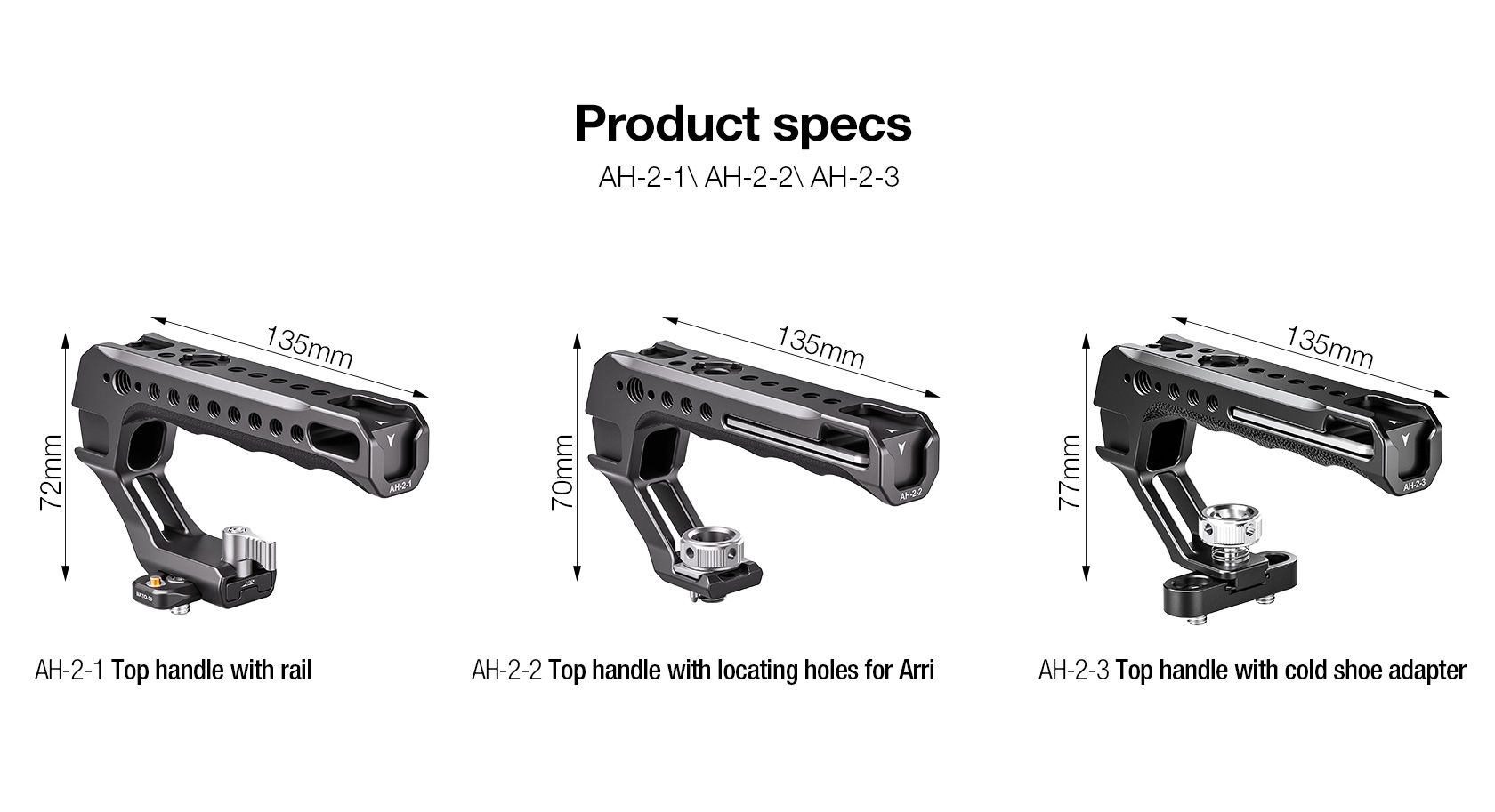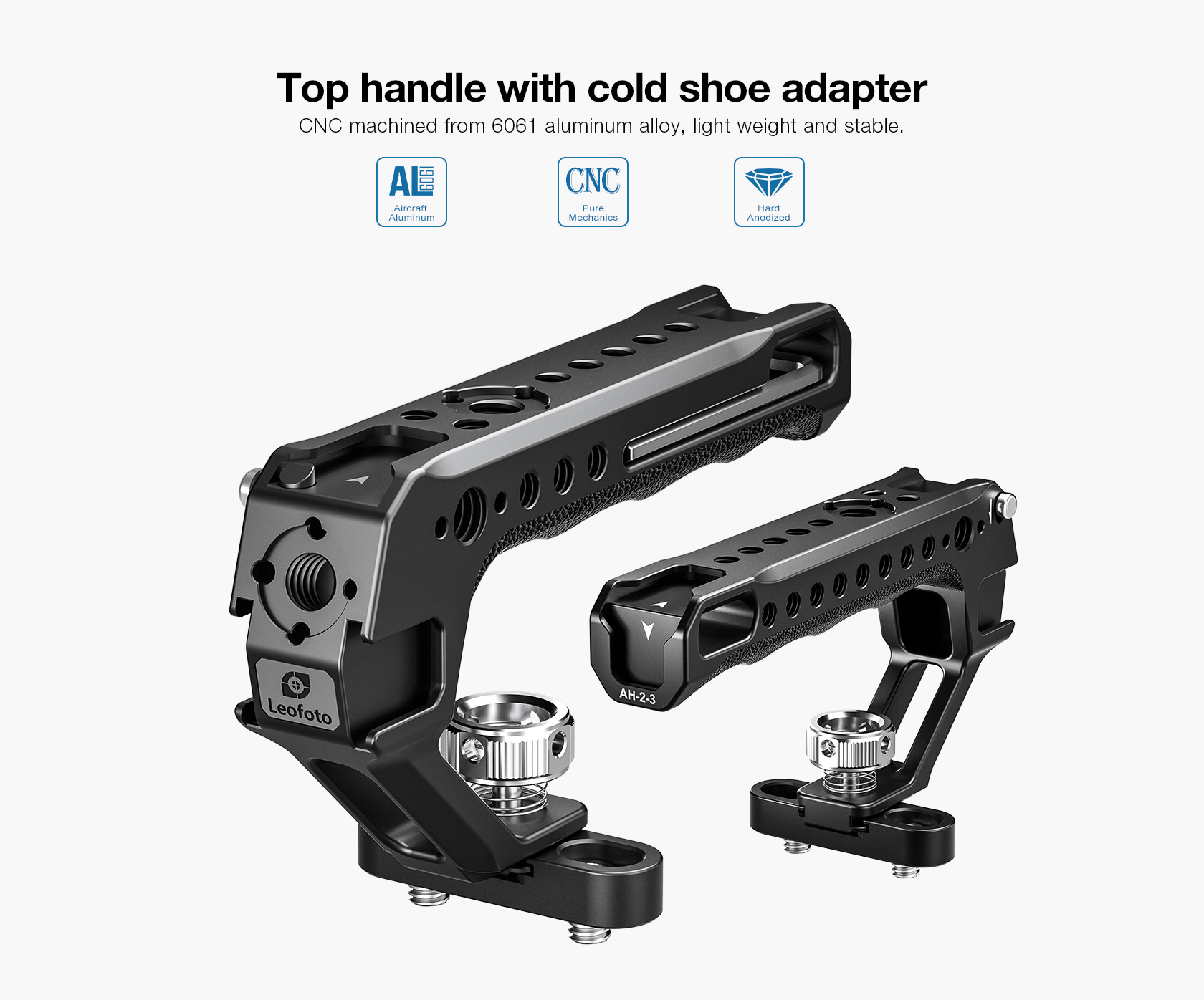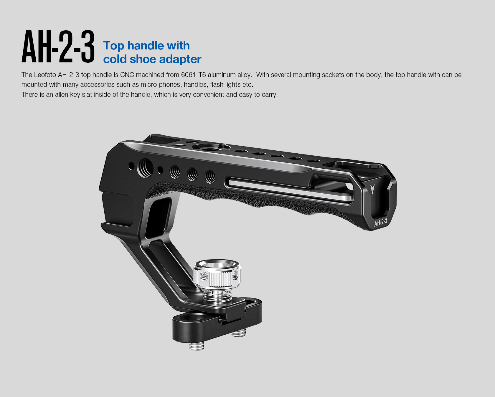 The Leofoto AH-2-3 Top Handle with Cold Shoe is a universal handle with cold shoe, simple and ergonomically designed to offer a comfortable handheld shooting experience. The handle is CNC machined from 6061-T6 aluminum and hard anodized making it light weight and durable and has an ergonomic silicone grip for added comfort. It features various mounting sockets along the handle that allow simultaneously mounting microphone, LED light, monitor, and other accessories. There is also a magnetized allen wrench integrated into the handle for convenient adjustments. Overall, the lightweight and practical handle can provide a wide range of mounting points and an excellent shooting experience.