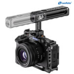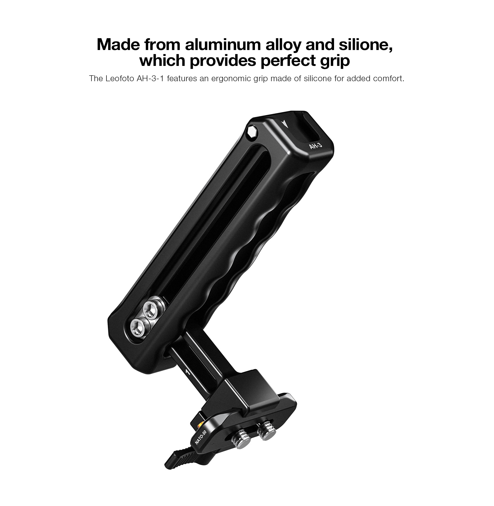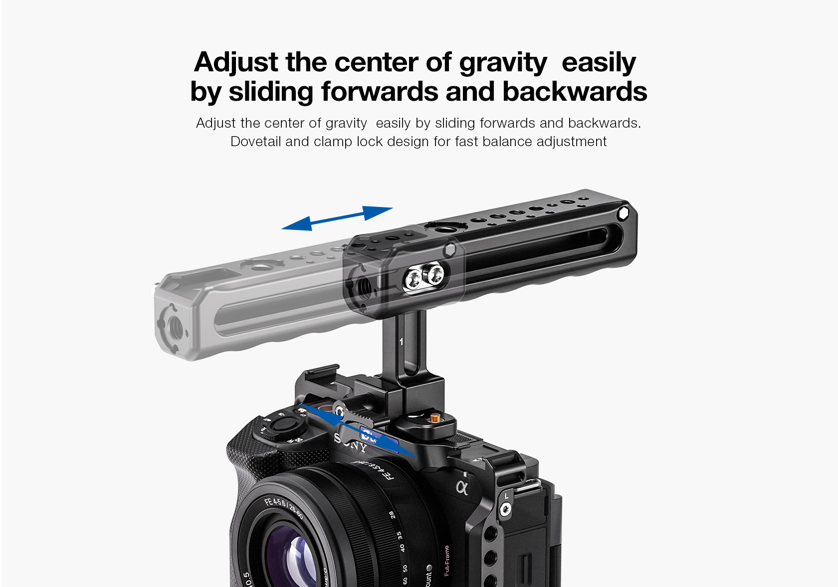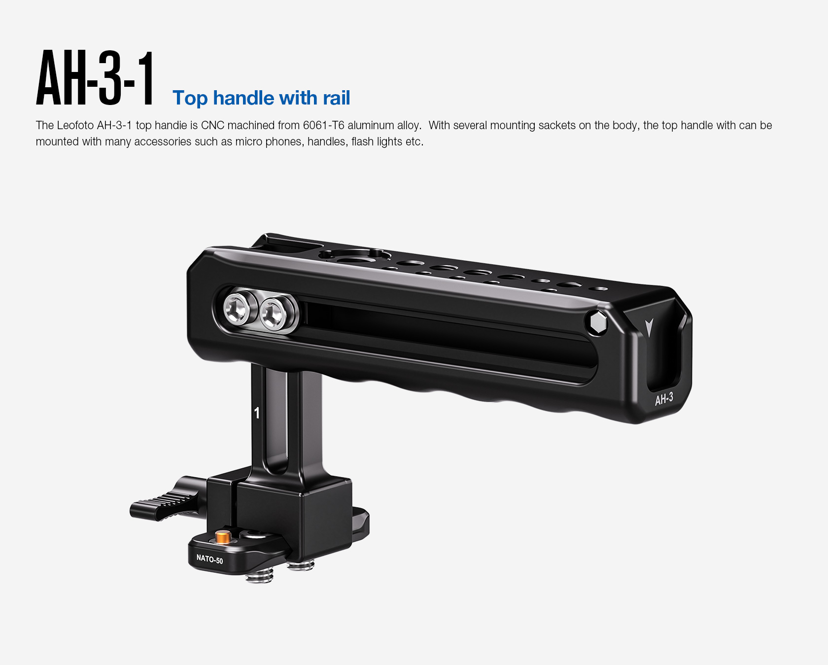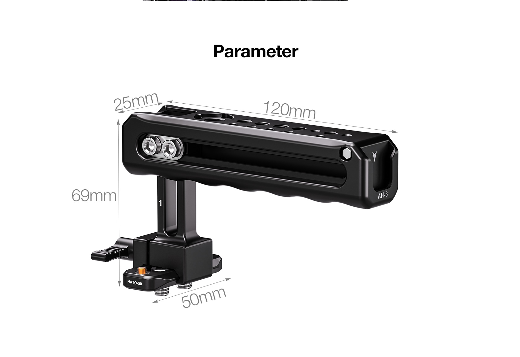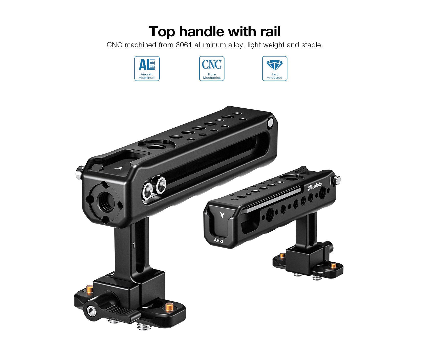 The handle is CNC machined from 6061-T6 aluminum and hard anodized making it light weight and durable. It features various mounting sockets along the handle that allow simultaneously mounting microphone, LED light, monitor, and other accessories. Overall, the lightweight and practical handle can provide a wide range of mounting points and an excellent shooting experience.