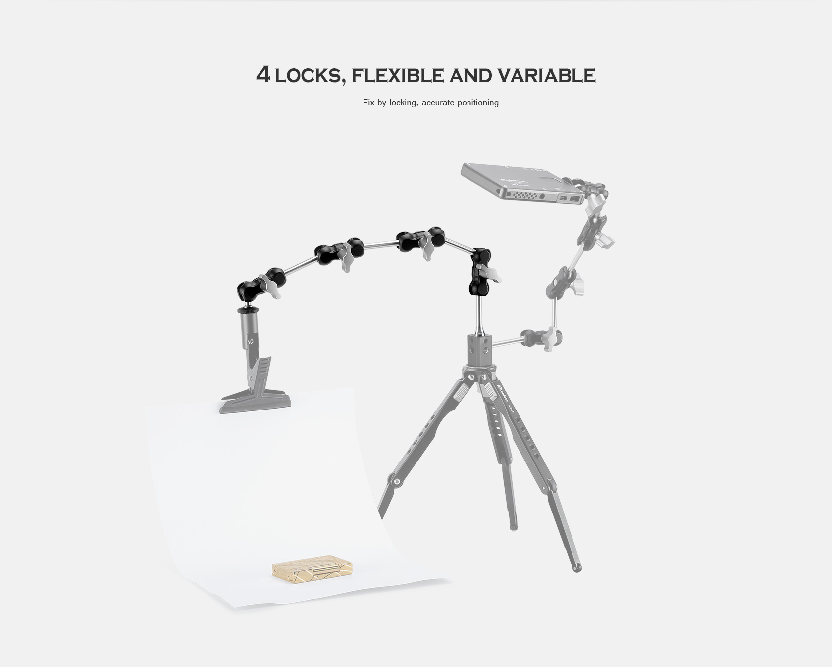 The Leofoto AM Series “Heavy-Duty” Versa Magic Arm is a multi-purpose tripod accessory that attaches to the leg of select Leofoto tripods, or other tripods and camera brackets with a 1/4″-20 accessory slot. Each end of the magic arm features a ball-and-socket joint that rotates 360°, and the center elbow joint locks in any position.