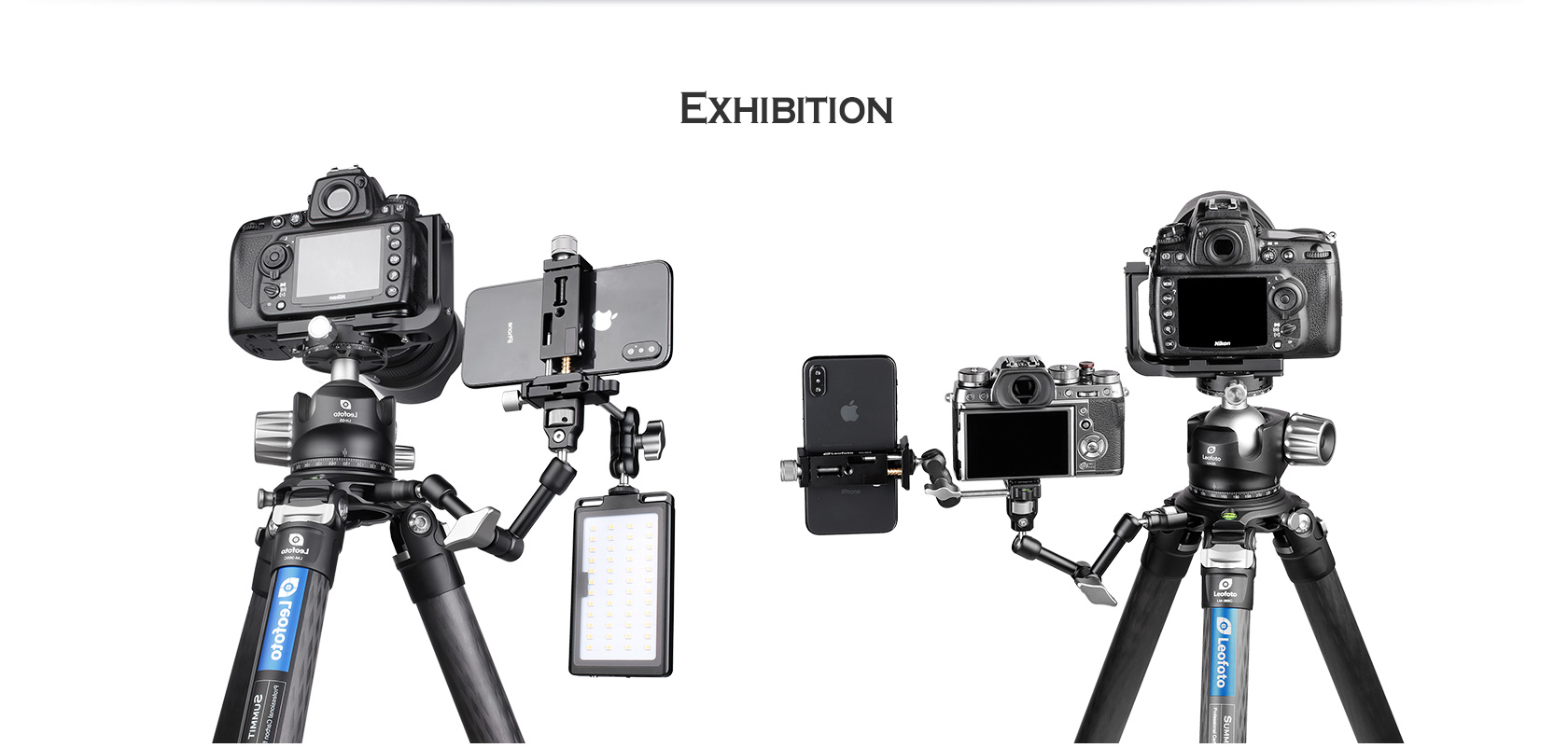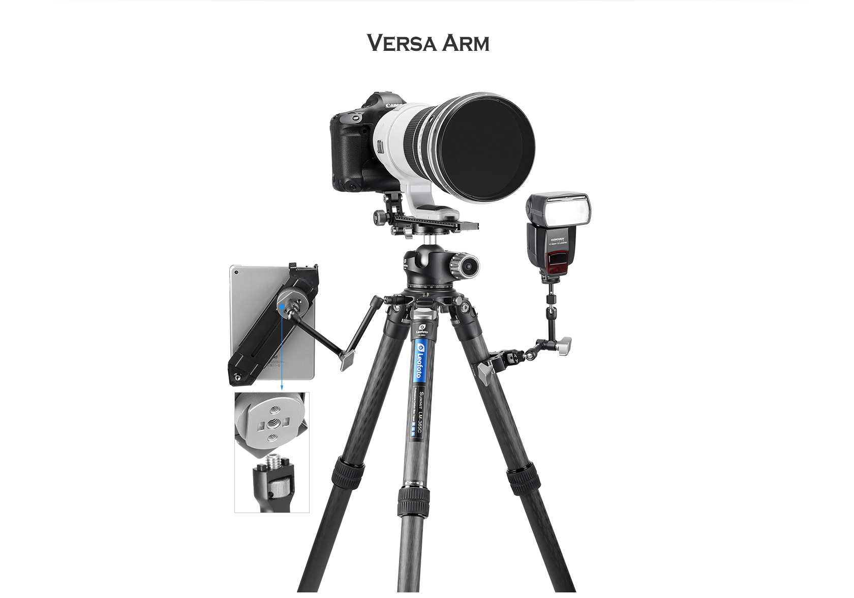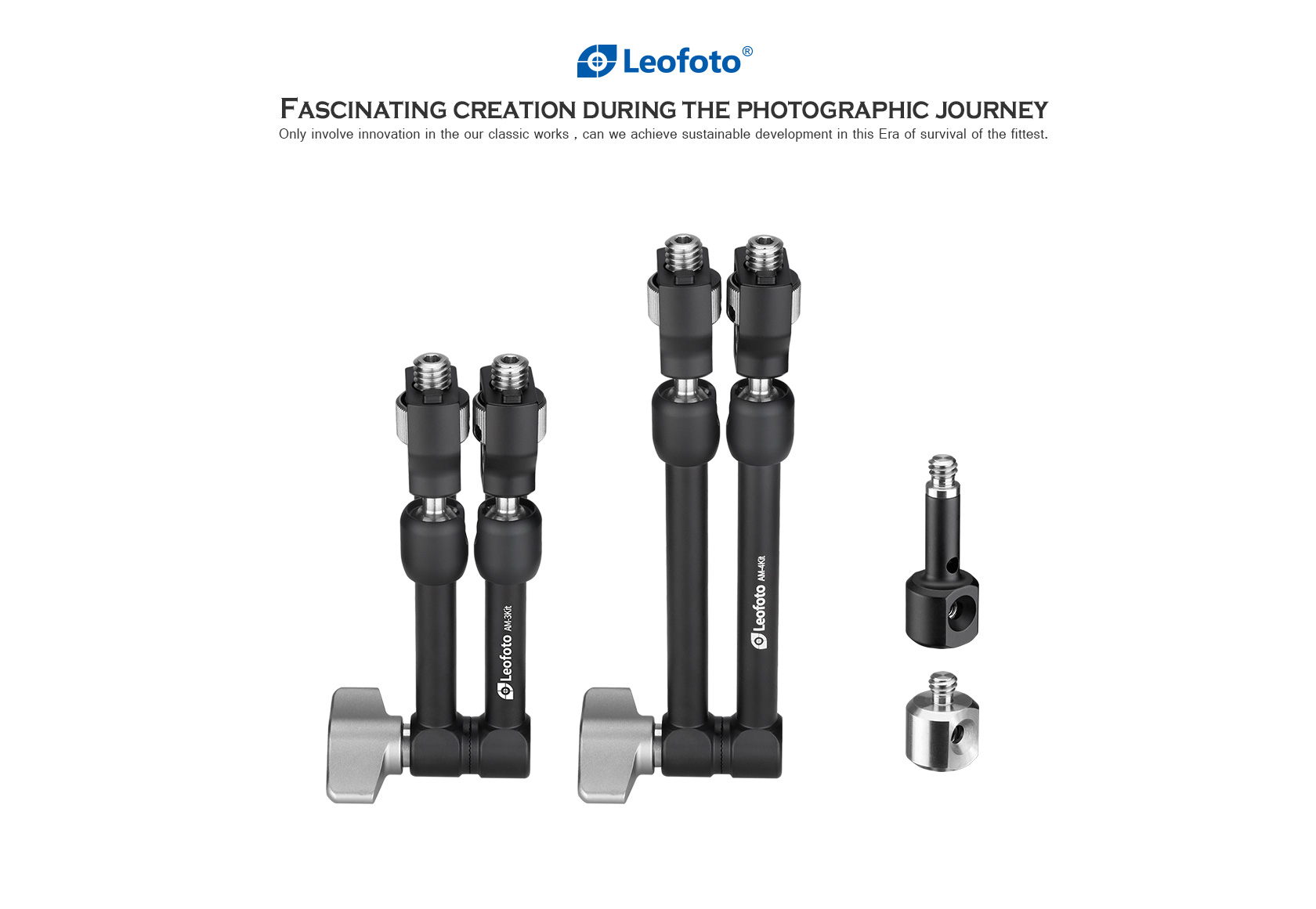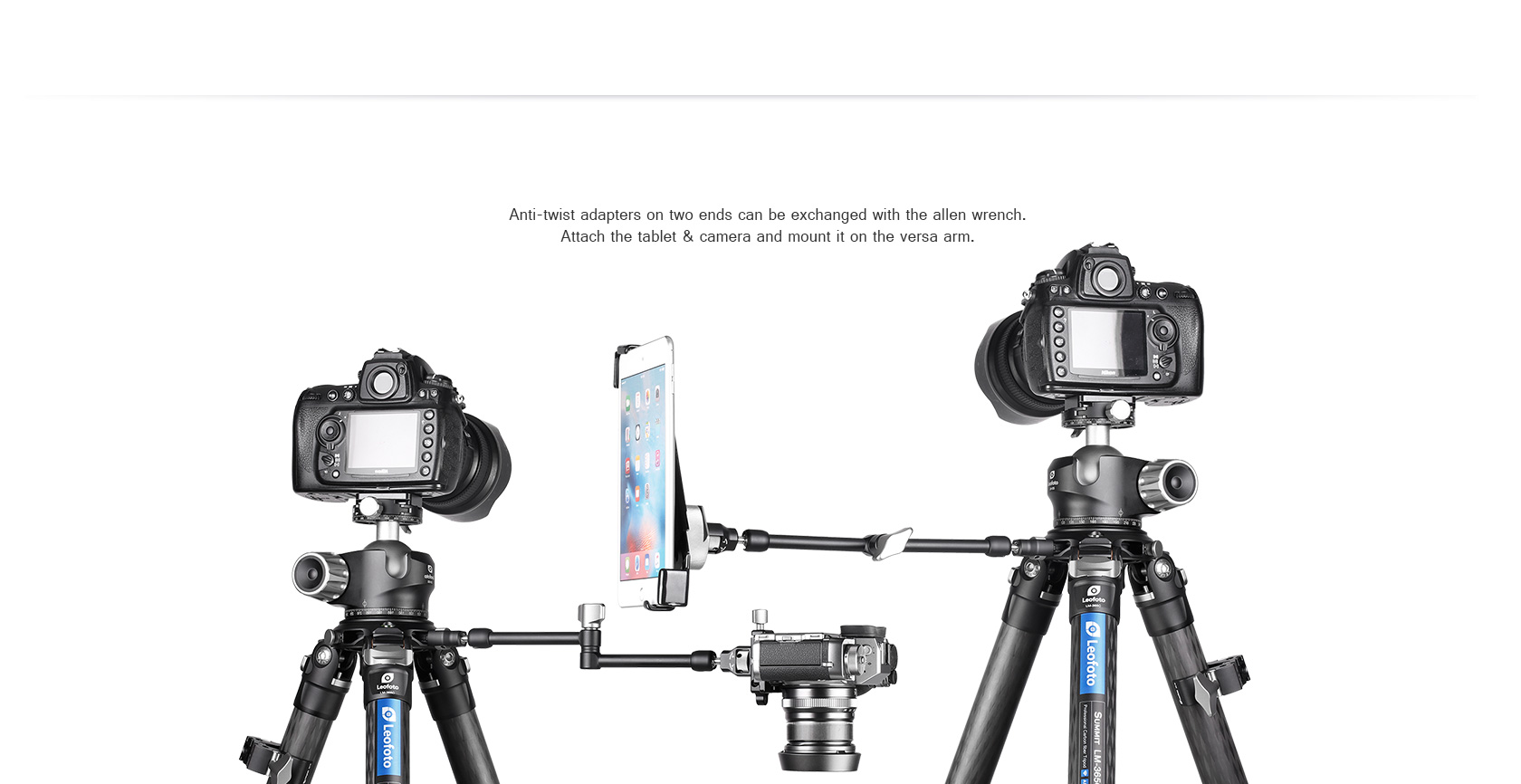 The Leofoto AM Series Versa Magic Arm Kit is a multi-purpose tripod accessory that attaches to the leg of select Leofoto tripods, or other tripods and camera brackets with a 3/8th threaded hole. The magic-arm allows a light, microphone, monitor, smartphone, tablet, or even an additional camera to be affixed to a camera rig without the added bulk of a clamp. Each end of the magic arm features a ball-and-socket joint that rotates 360°, and the center elbow joint locks in any position. The large, easy-to-grip center knob locks all three movements simultaneously for quick and easy setup and repositioning. The “kit” version features anti-twist lock adapters on either end as well as 3/8th mounting studs.