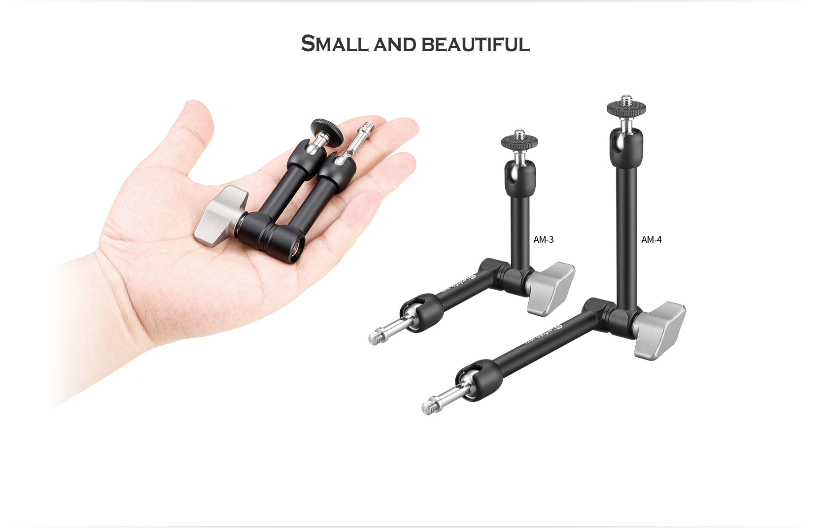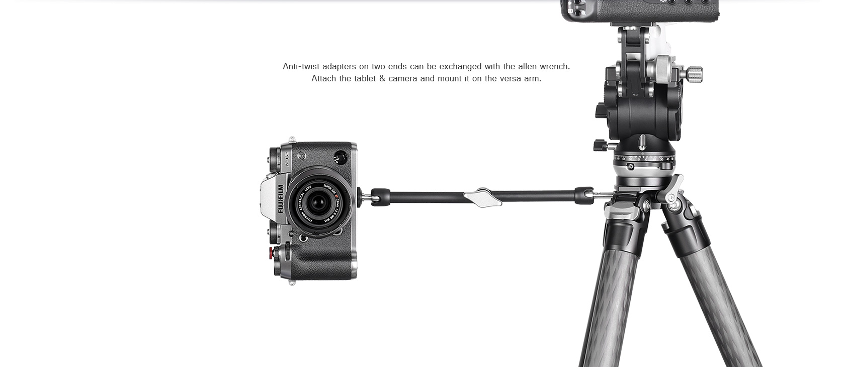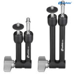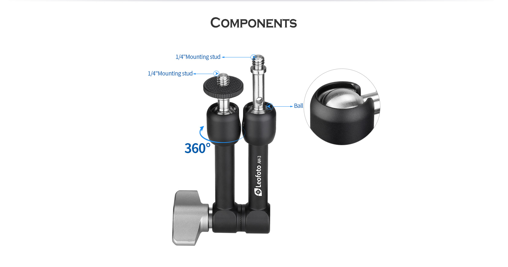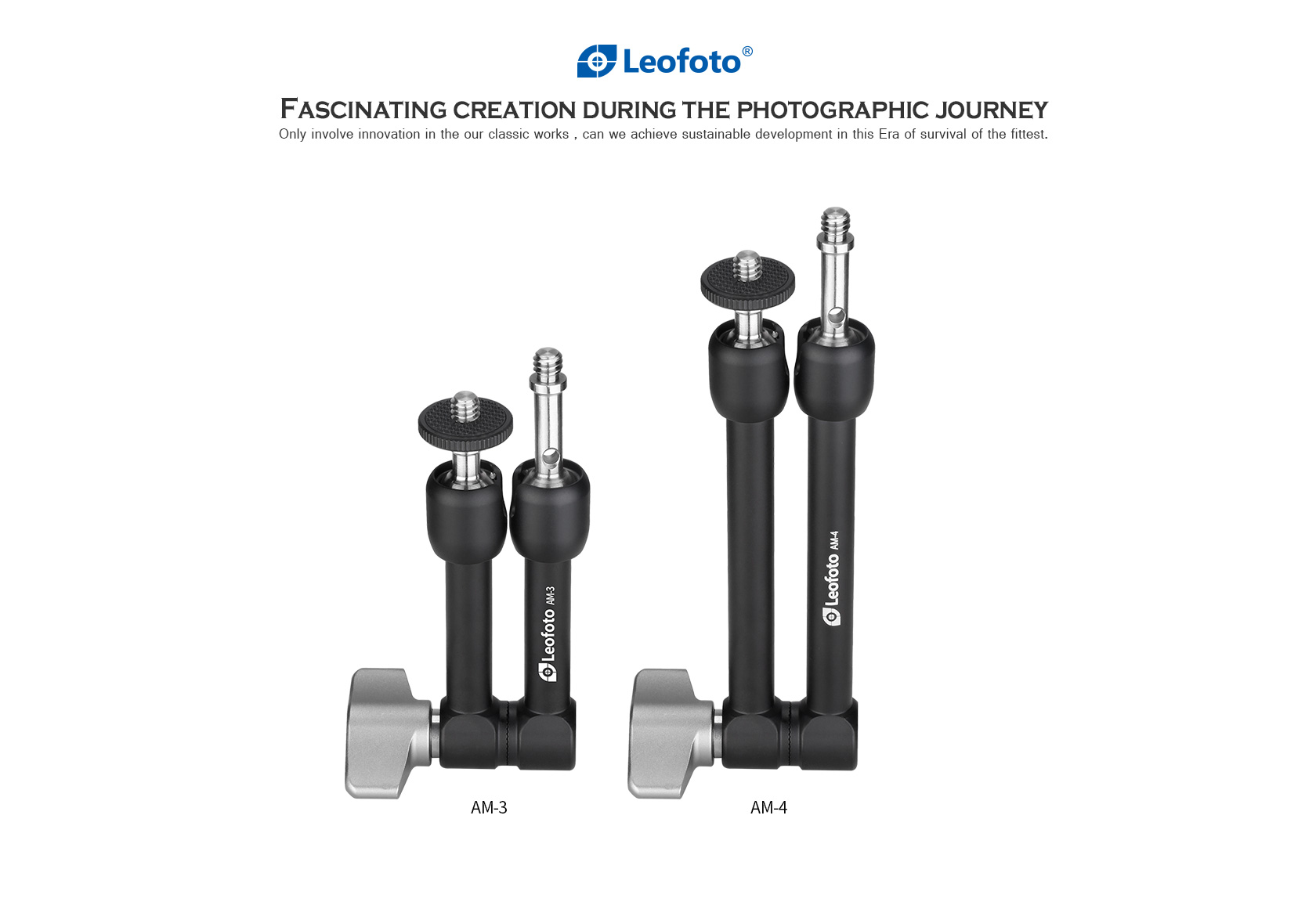 The Leofoto AM Series Versa Magic Arm is a multi-purpose tripod accessory that attaches to the leg of select Leofoto tripods, or other tripods and camera brackets with a 1/4″-20 accessory slot. The magic-arm allows a light, microphone, monitor, smartphone, tablet, or even an additional camera to be affixed to a camera rig without the added bulk of a clamp. Each end of the magic arm features a ball-and-socket joint that rotates 360°, and the center elbow joint locks in any position. The large, easy-to-grip center knob locks all three movements simultaneously for quick and easy setup and repositioning.