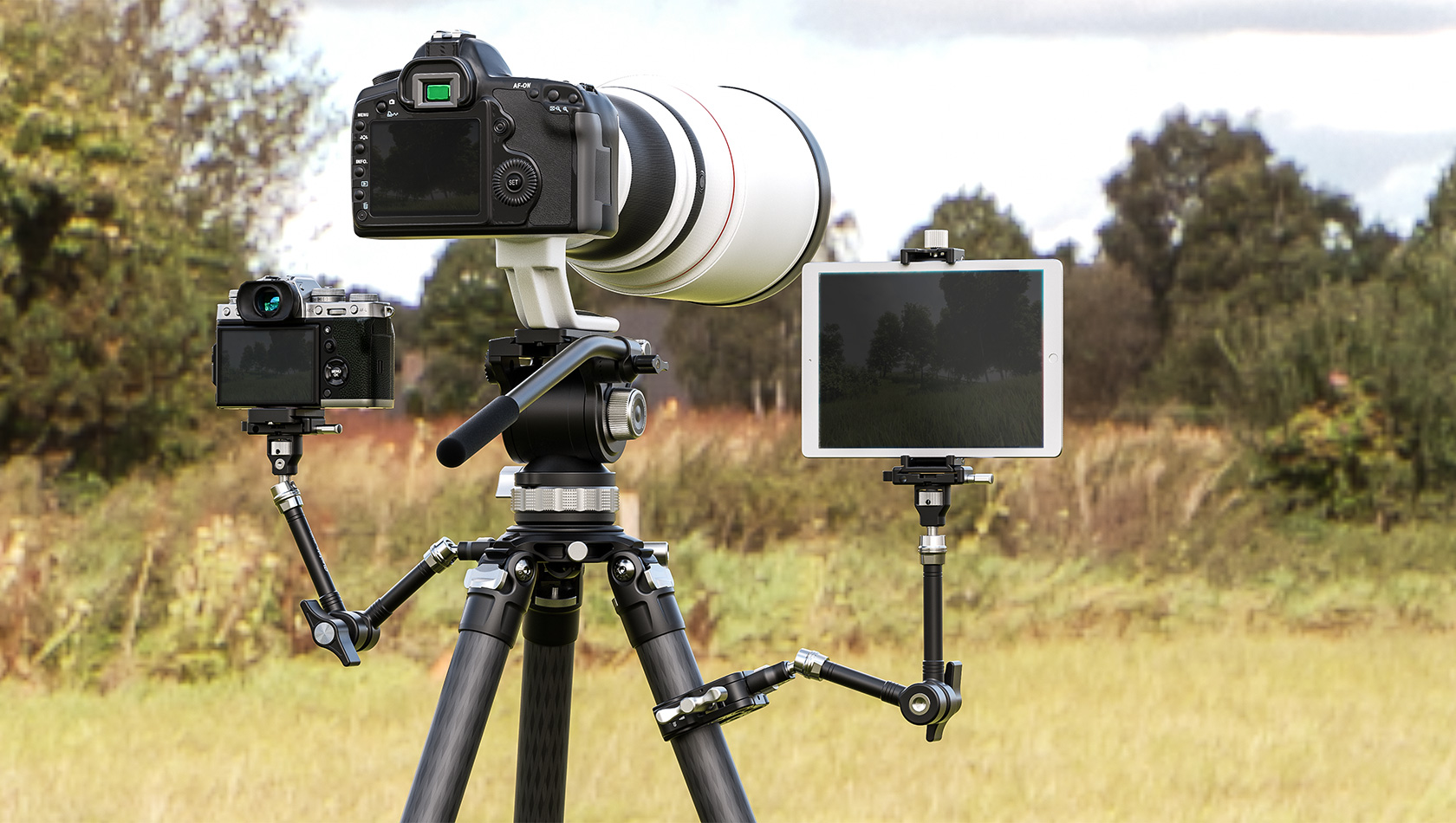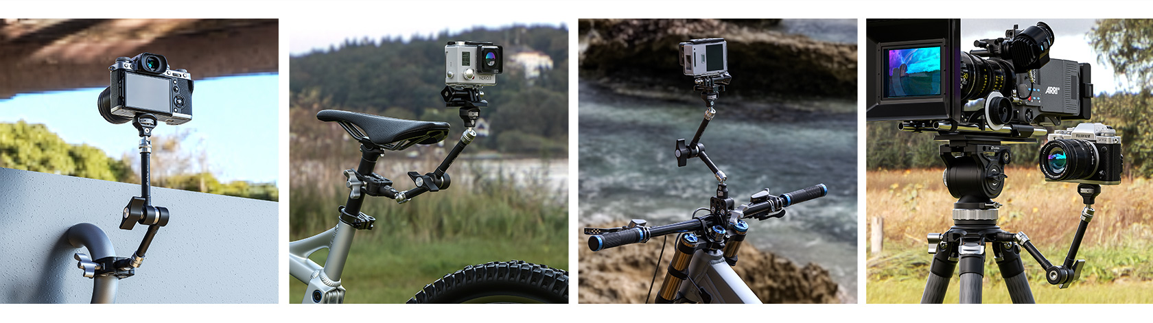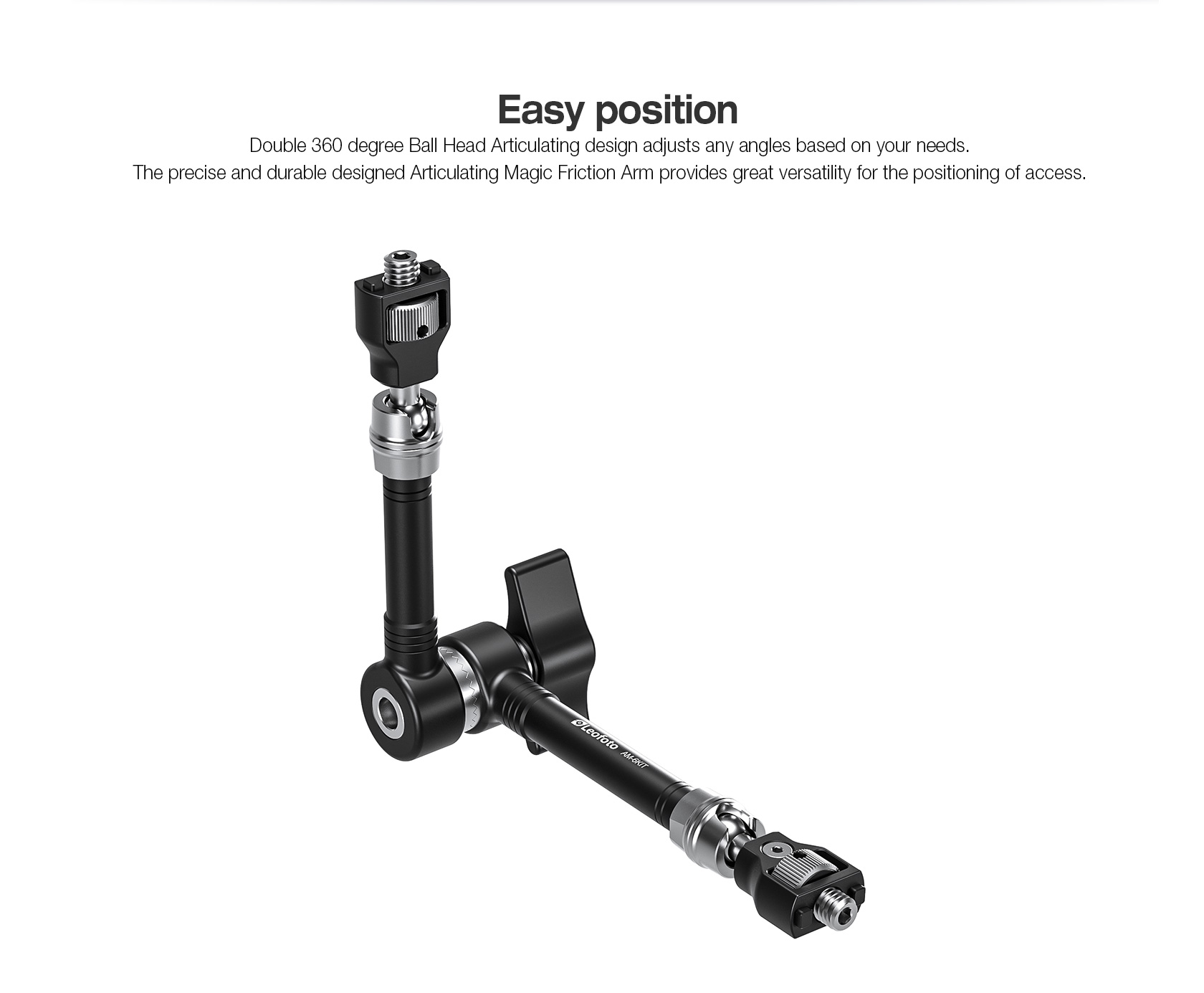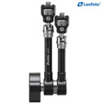 The Leofoto AM Series “Heavy-Duty” Versa Magic Arm Kit is a multi-purpose tripod accessory that attaches to the leg of select Leofoto tripods, or other tripods and camera brackets with a 3/8th mounting hole. The magic arm allows a light, microphone, monitor, smartphone, tablet, or even an additional camera to be affixed to a camera rig without the added bulk of a clamp. Each end of the magic arm features a ball-and-socket joint that rotates 360°, and the center elbow joint locks in any position. The large, easy-to-grip center knob locks all three movements simultaneously for quick and easy setup and repositioning. The “kit” version features anti-twist lock adapters on either end as well as 1/4″ and 3/8″ mounting adapters.