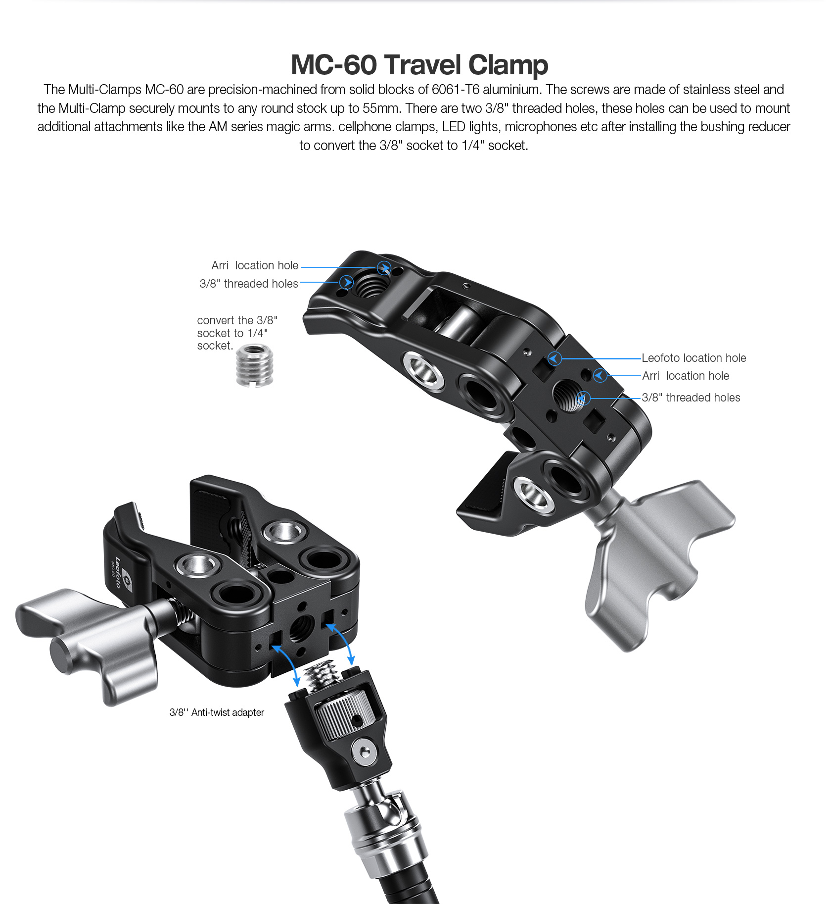 The MC-60 Multipurpose Clamp from Leofoto is precision-machined from solid blocks of 6061-T6 aluminum. The screws are made of stainless steel, and the clamp securely mounts onto any rod or pipe up to 2.2″. There are two 3/8″-16 threaded holes that can be used to mount additional attachments, such as the AM-series magic arms, smartphone clamps, LED lights, and microphones, after installing the bushing reducer to convert the 3/8″-16 hole to a 1/4″-20 screw.