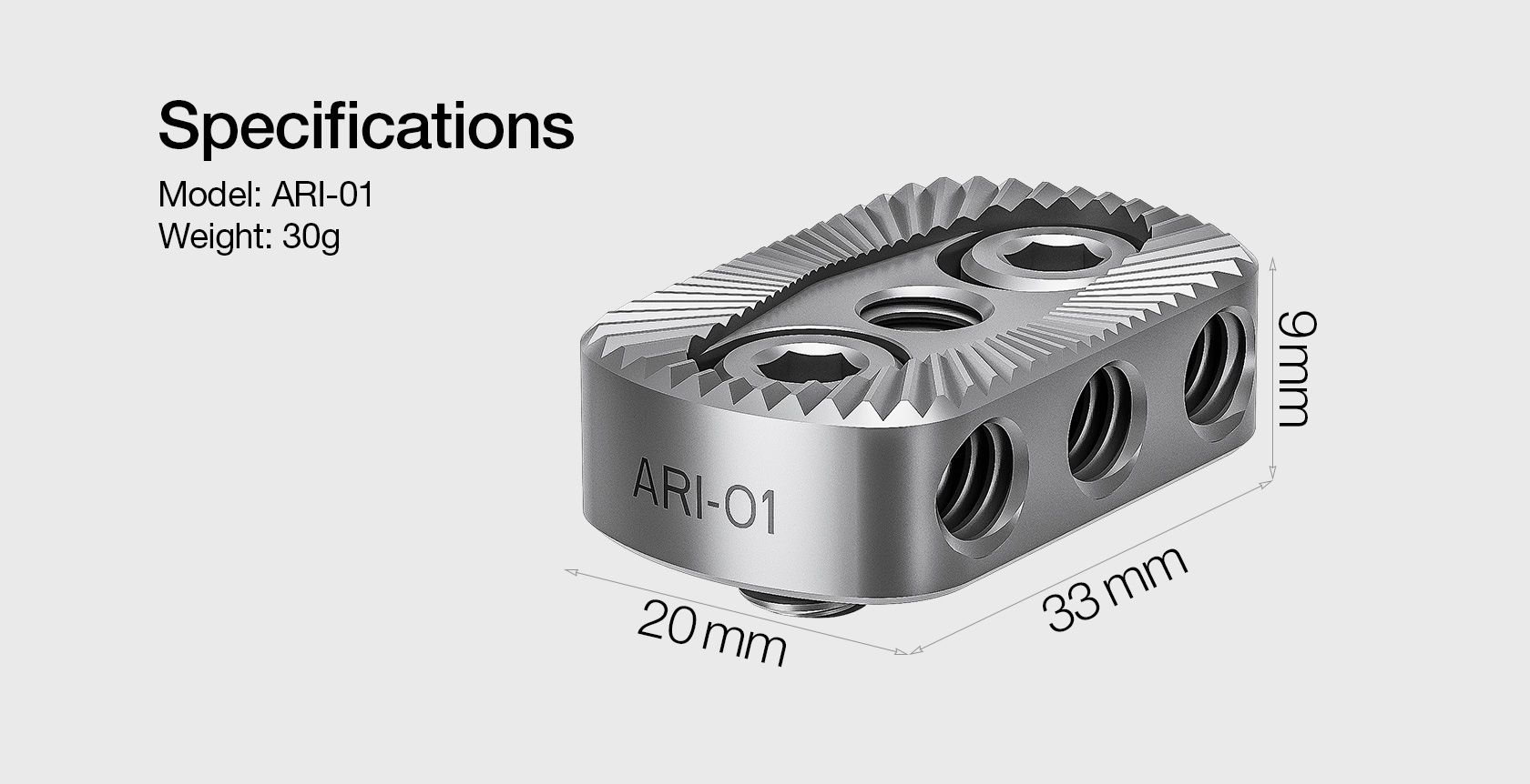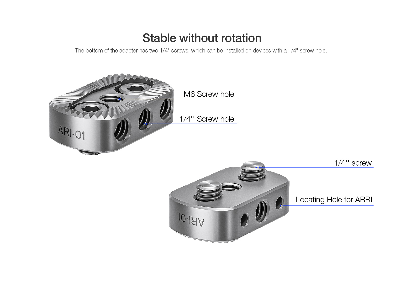 The Leofoto ARI-01 1/4″ to ARRI Accessory Mount Adaptor offers a stable and secure mounting point for camera cages, monitors, and various accessories that lack such provision. It attaches using two 1/4″ screws.