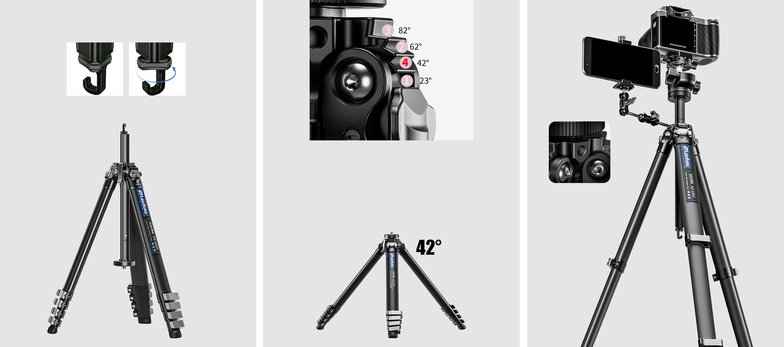 Most of the tripods in the market are with only angles including low, middle and high angles. To help photographers who go windy outdoors for shooting, we add a 42° setting to the tripod to make sure that even in windy outdoors, the shooting can still be stable.
