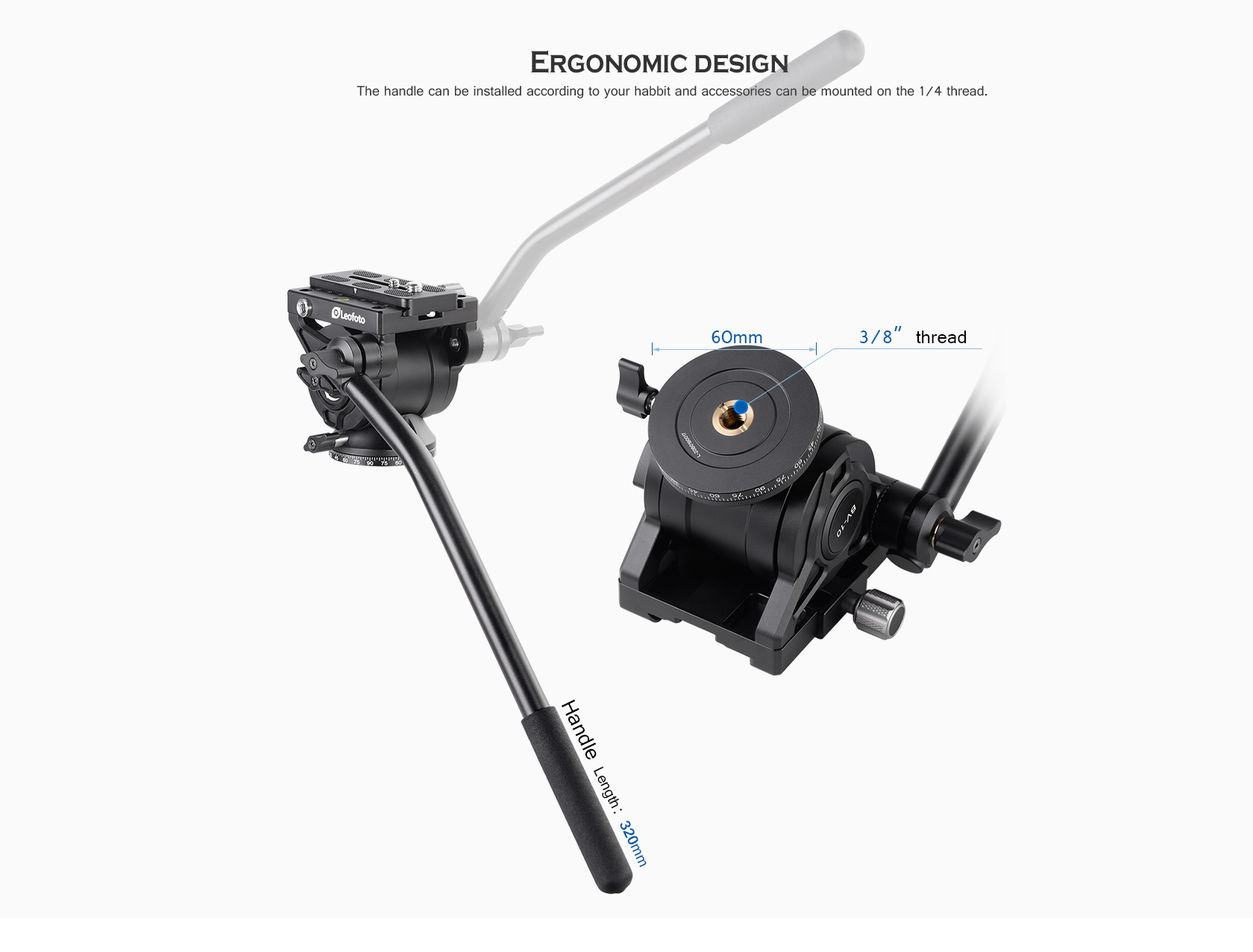 The head pans 360°, is indexed for repeatability, and has a tilt range of 90 to 75°. Likewise, the camera platform is indexed, making it fast and easy to rebalance your setup on the head. Two bubble levels (on the pan base and one on the camera platform) allow you to confirm your head is level. Pan handle mounting rosettes allow you to mount the included pan handle to either side of the head for operator comfort, and individual pan and tilt locks provide security when you need to either only tilt or pan.