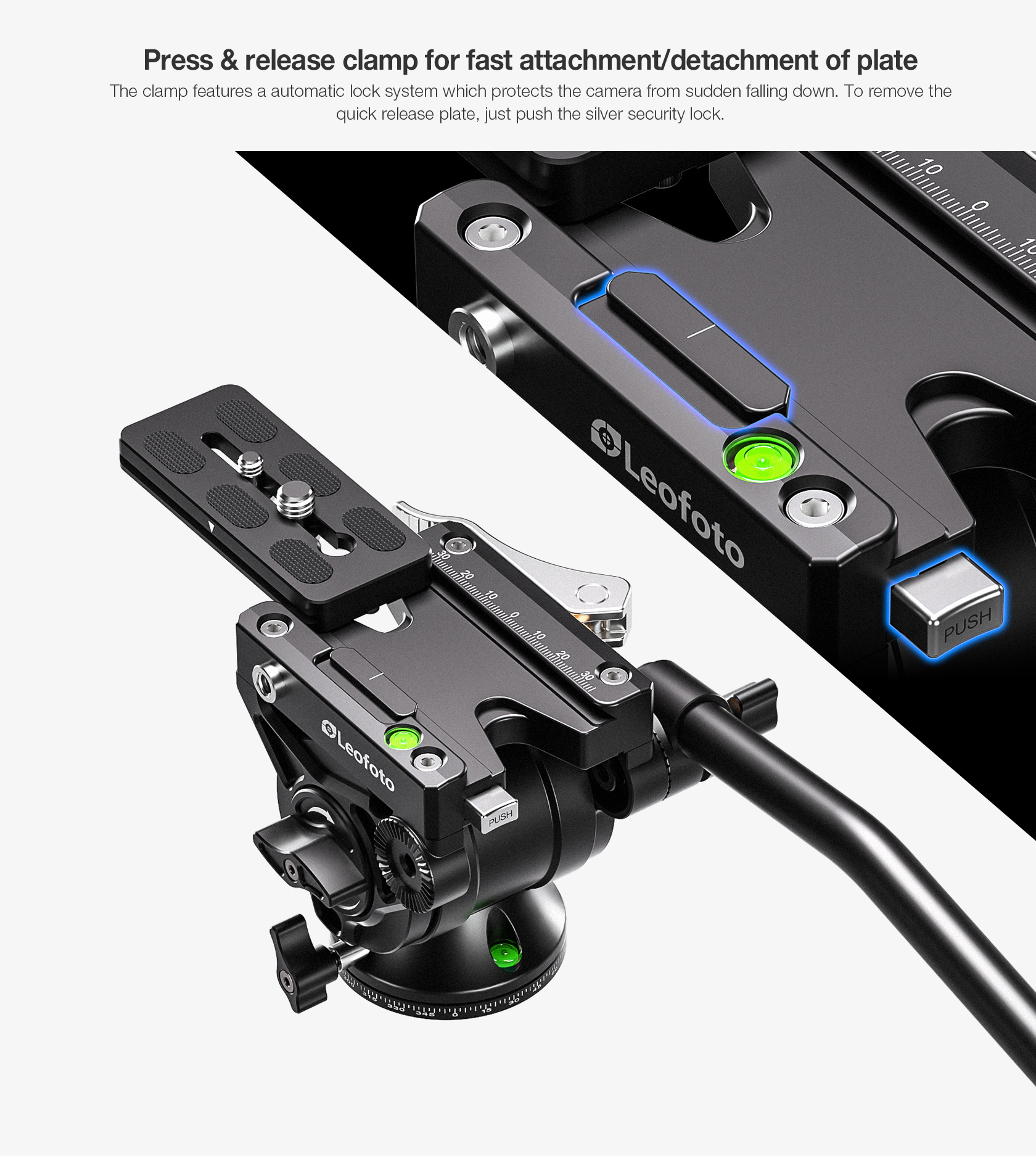 Lightweight and compact, this Leofoto BV-10L (Lever-Release Clamp) Fluid Video Head is suitable for DSLRs, mirrorless cameras, and compact camcorders weighing up to 11 lb. Featuring both a 1/4″-20 and 38″-16 mounting screw, the head accepts a wide variety of cameras. The head features a 60mm flat base that can mount on compatible tripod legs, a slider carriage, or other platforms with a 3/8″-16 mounting screw.