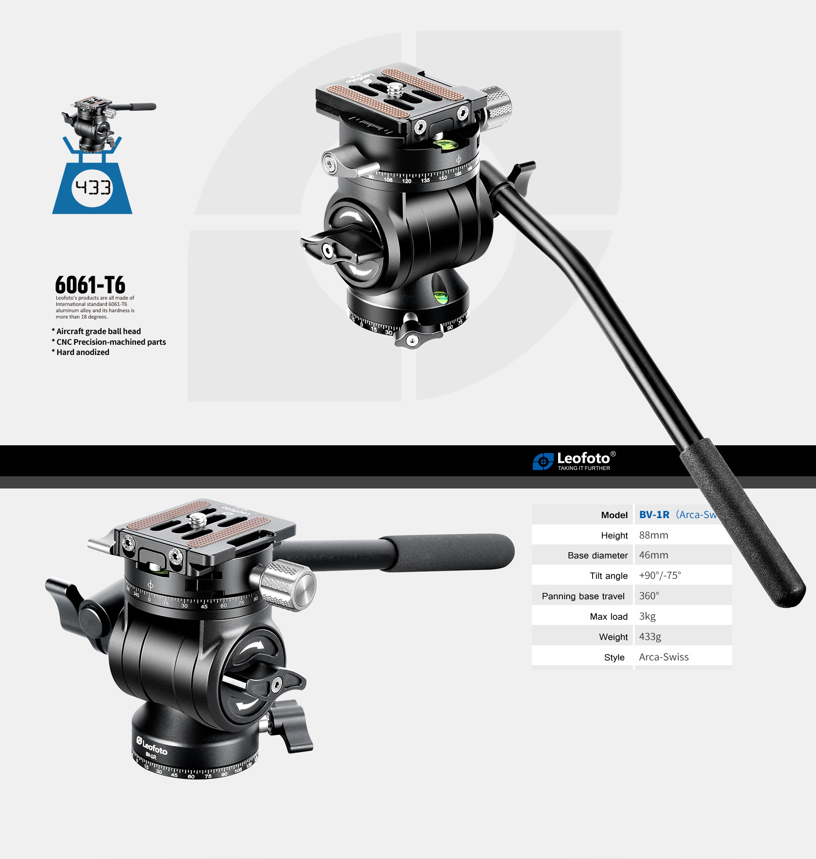 The  Leofoto BV-1R  Fluid Video Head is a compact fluid video head with a flat base. Constructed of durable lightweight 6061-T6 aluminum, the head weighs just under 1 lb but can support a payload of up to 6.6 lb. The BV-1 uses an Arca-type quick release plate and features measurement markings on its base. The tilt and pan lock design allows locking one axis while adjusting the other, and the 360° panning and -75 to 90° tilting flexibility provide a wide range of movement to get the perfect shot. Supports Ccopes, Binoculars, and Cameras that weigh up to 7 lbs.
