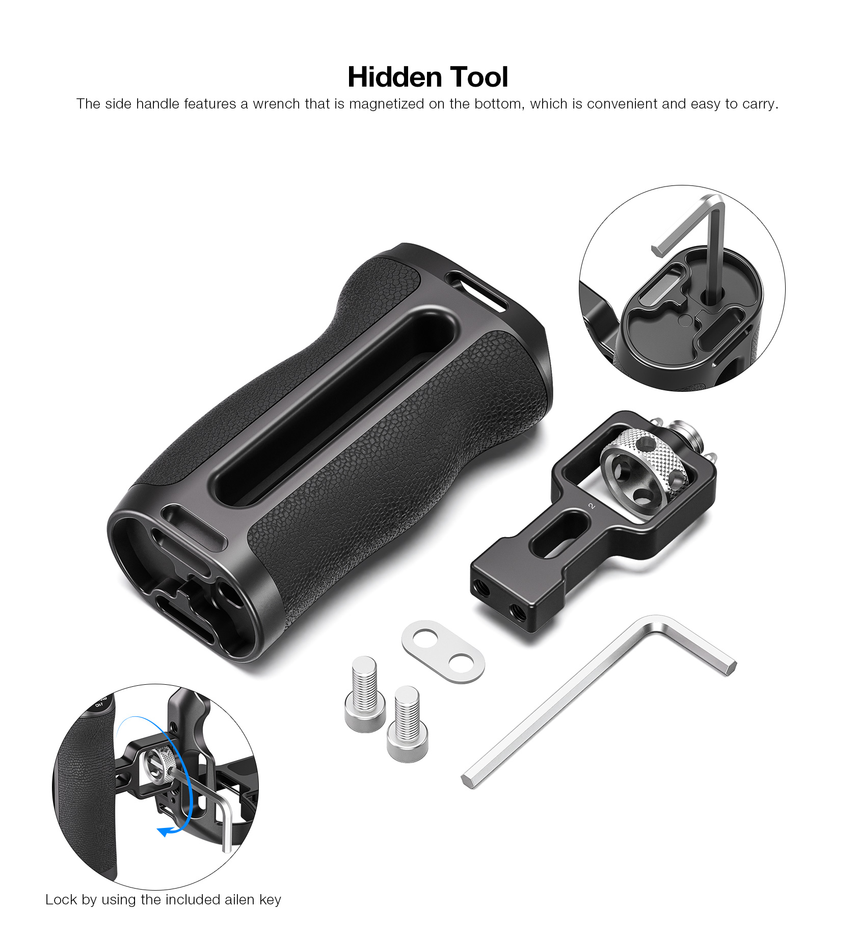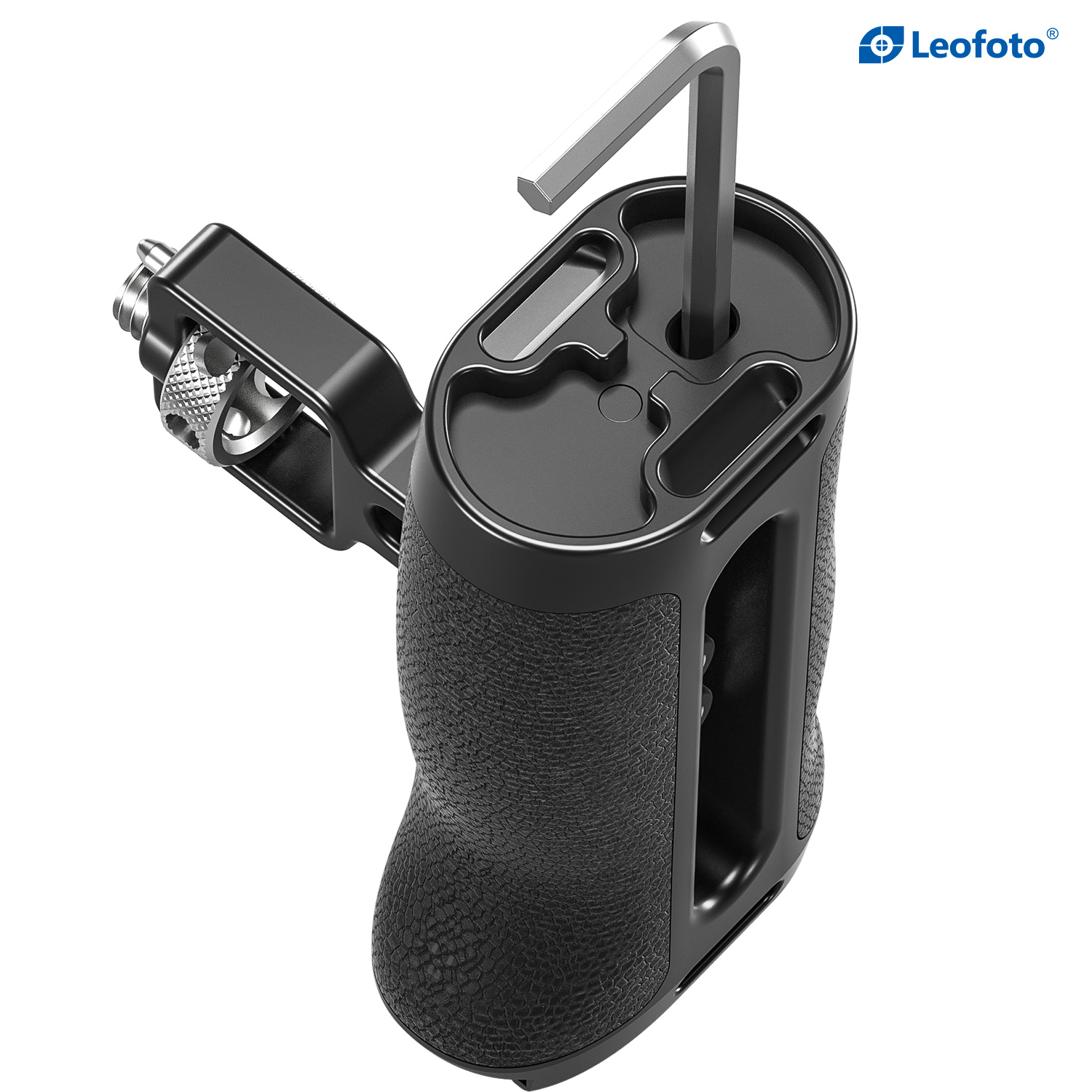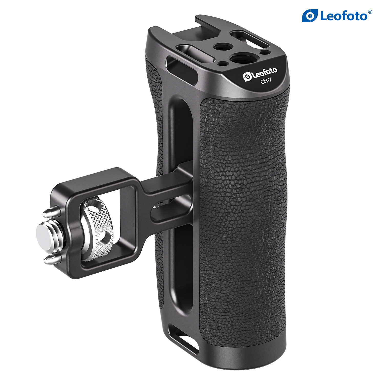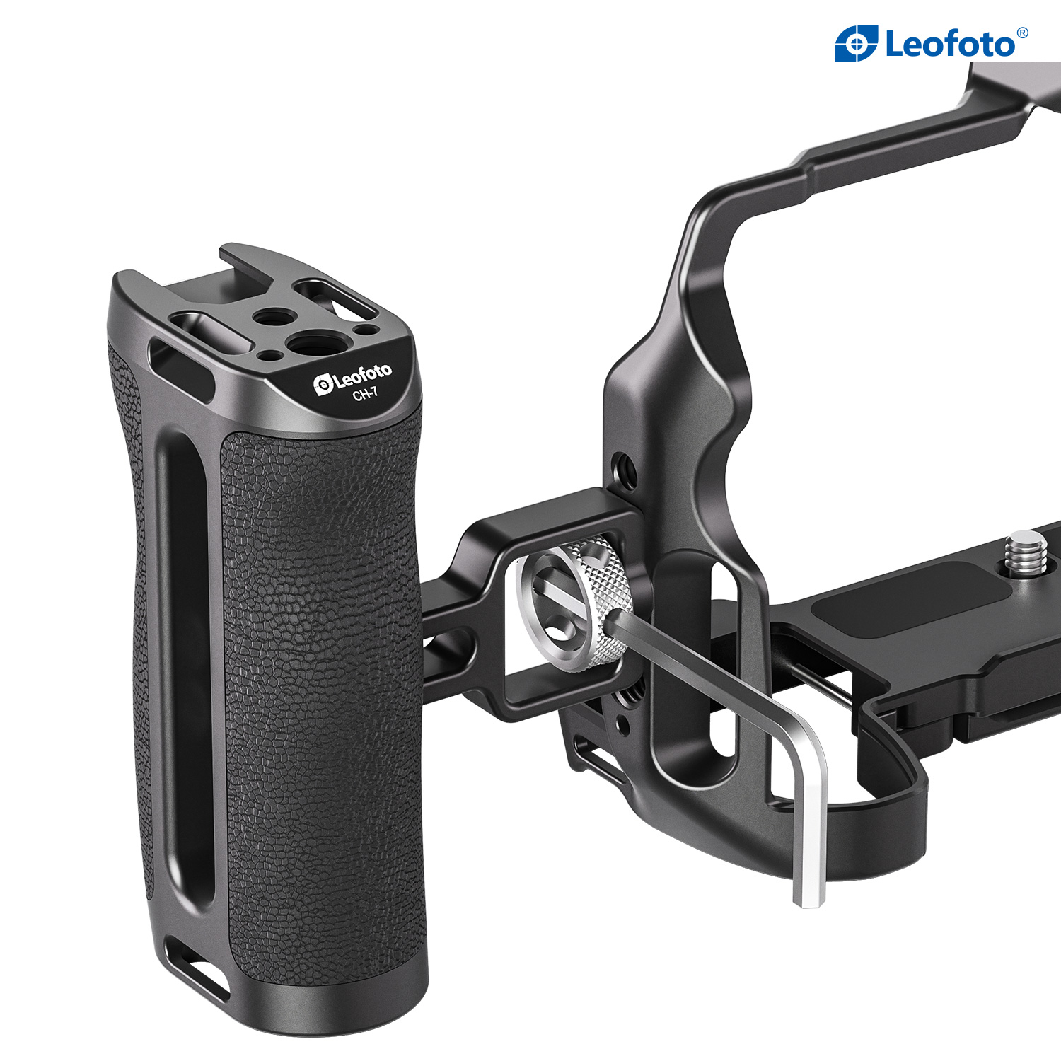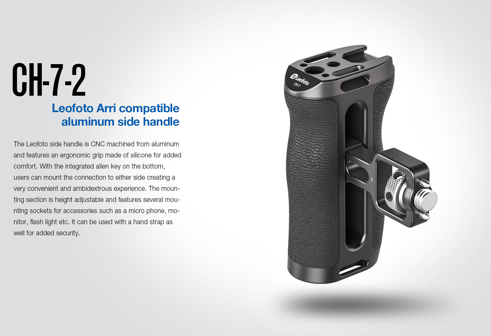 The Leofoto CH-7-2 ARRI Compatible Side Handle is designed to provide a comfortable grip for increased stability with access to accessory mounts for cameramen. The handle attaches to the cage or camera rig via an ARRI 3/8“-16 mounting screw with two locating pins. The CH-7-2 features 3/8”-16, 1/4“-20 and cold shoe accessory mounts on top to add a mounting arm, light, mic, or other accessories. This side handle is adjustable to fit different cage heights and can quickly switch between left-handed or right-handed orientation with the built-in allen wrench. Made of hard anodized aluminum, this handle features an ergonomic silicone grip to provide filmmakers with a smooth and comfortable shooting experience.