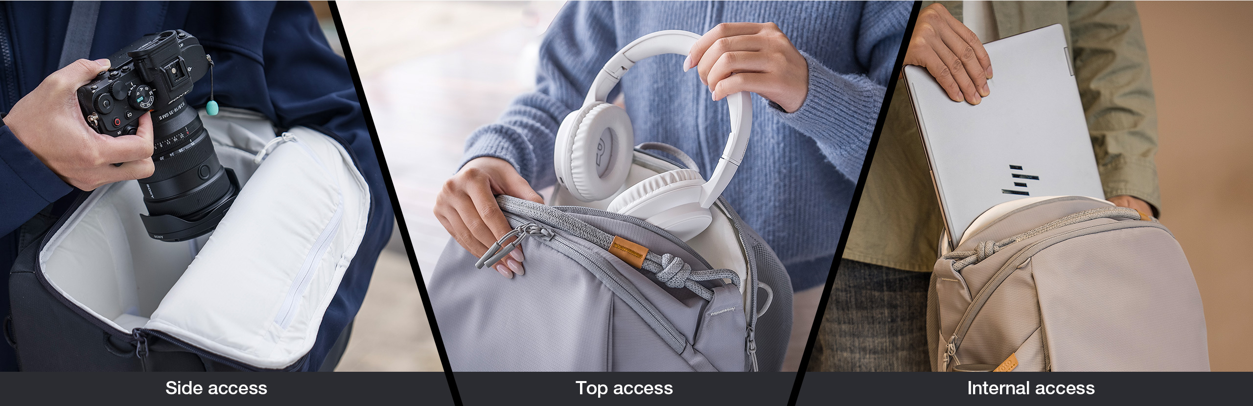 A left-side quick-access opening allows fast retrieval of camera equipment without removing the backpack.