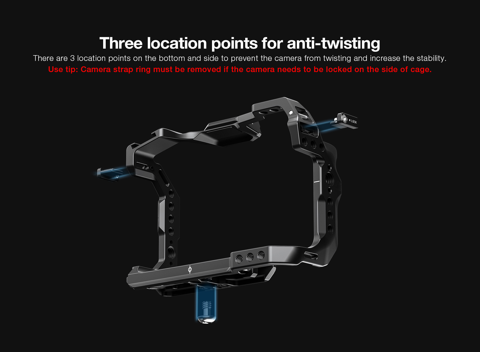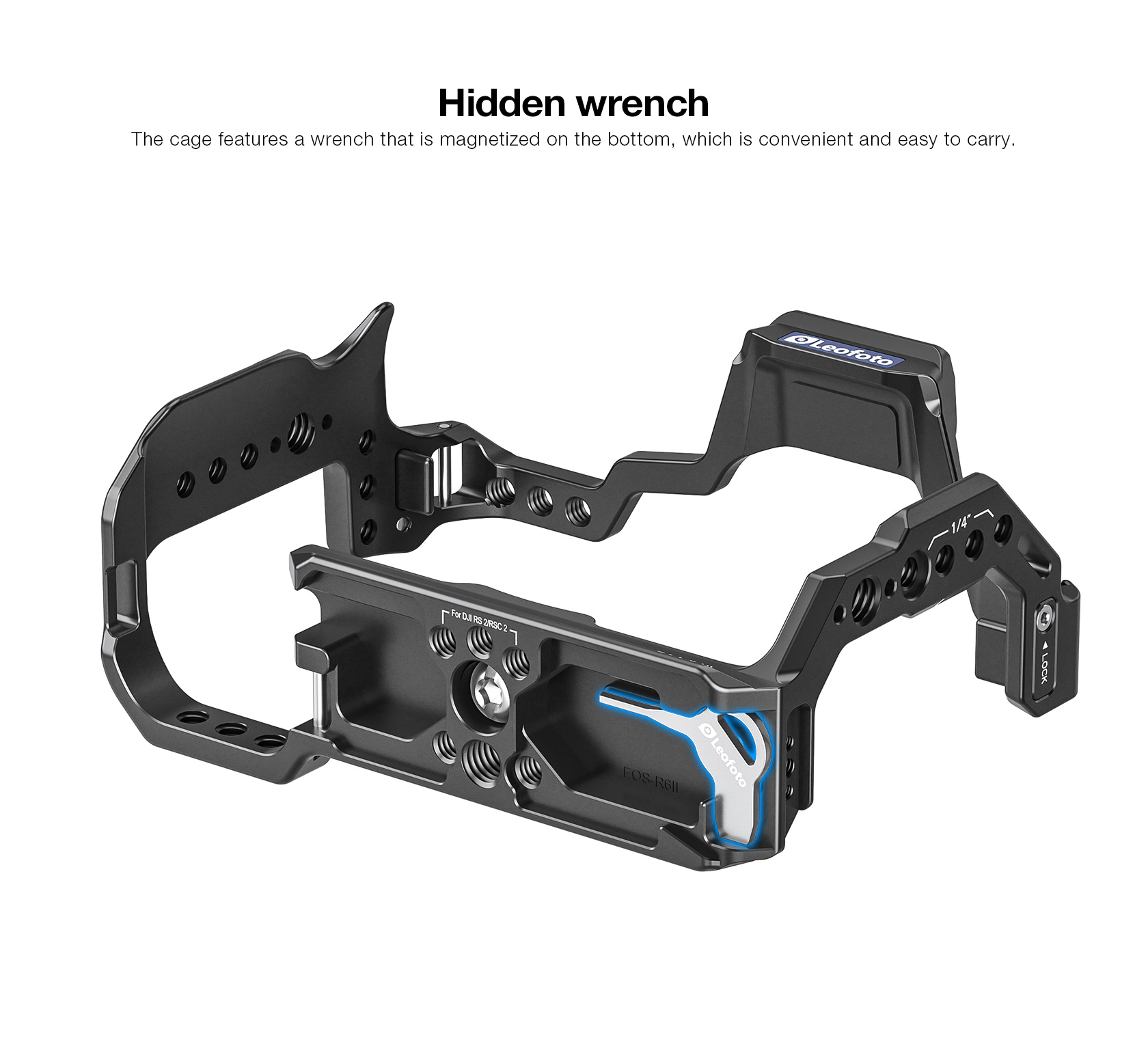 Access to the camera’s controls, compartments, and connectors is maintained when the cage is fitted to the camera. The cage incorporates a raised front piece that helps prevent your camera from twisting, as well as a rubber pad to help protect from metal-to-metal contact. The underside of the cage features both 1/4″-20 and 3/8″-16 threaded holes, as well as space to store the included magnetically attached allen key.