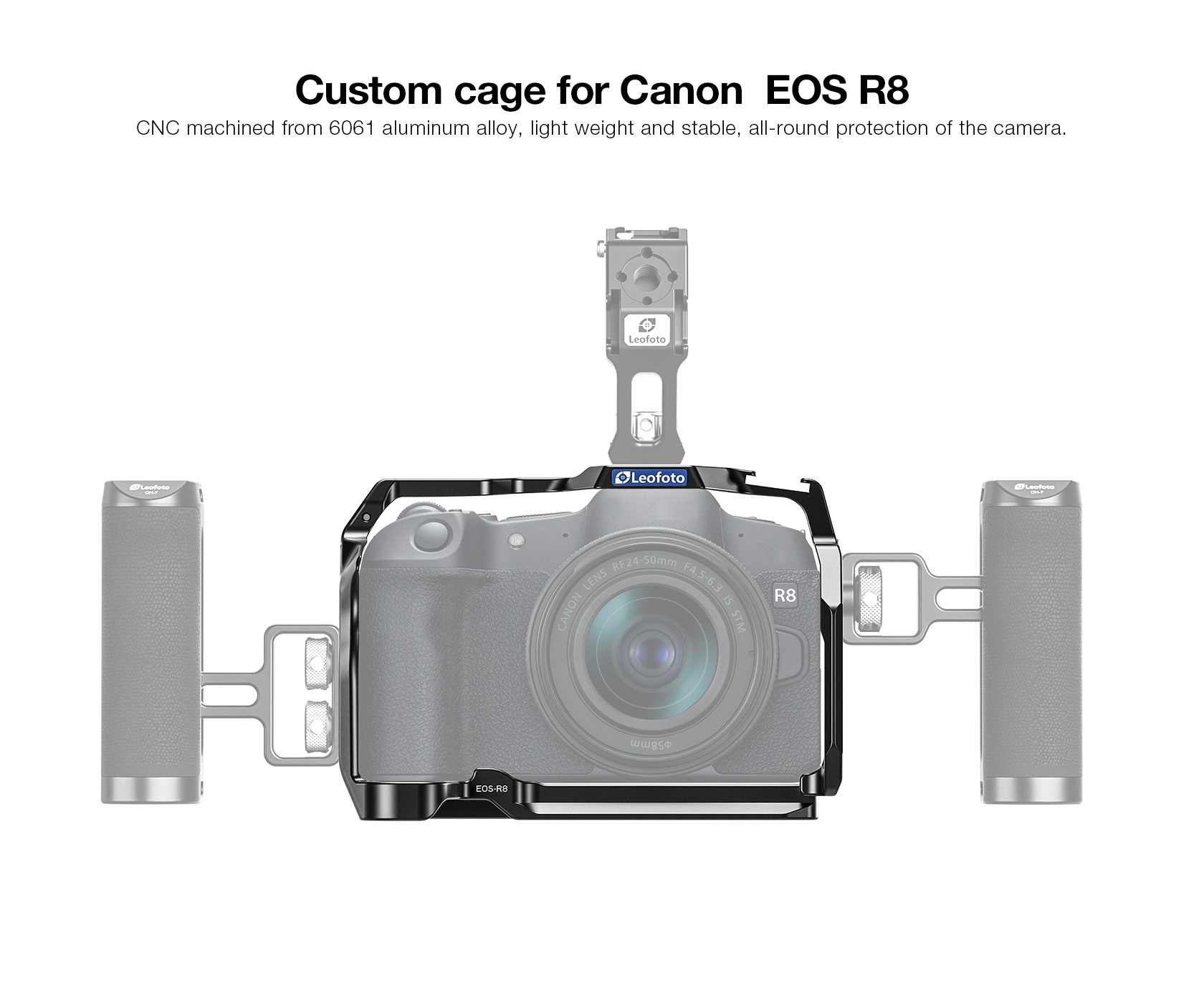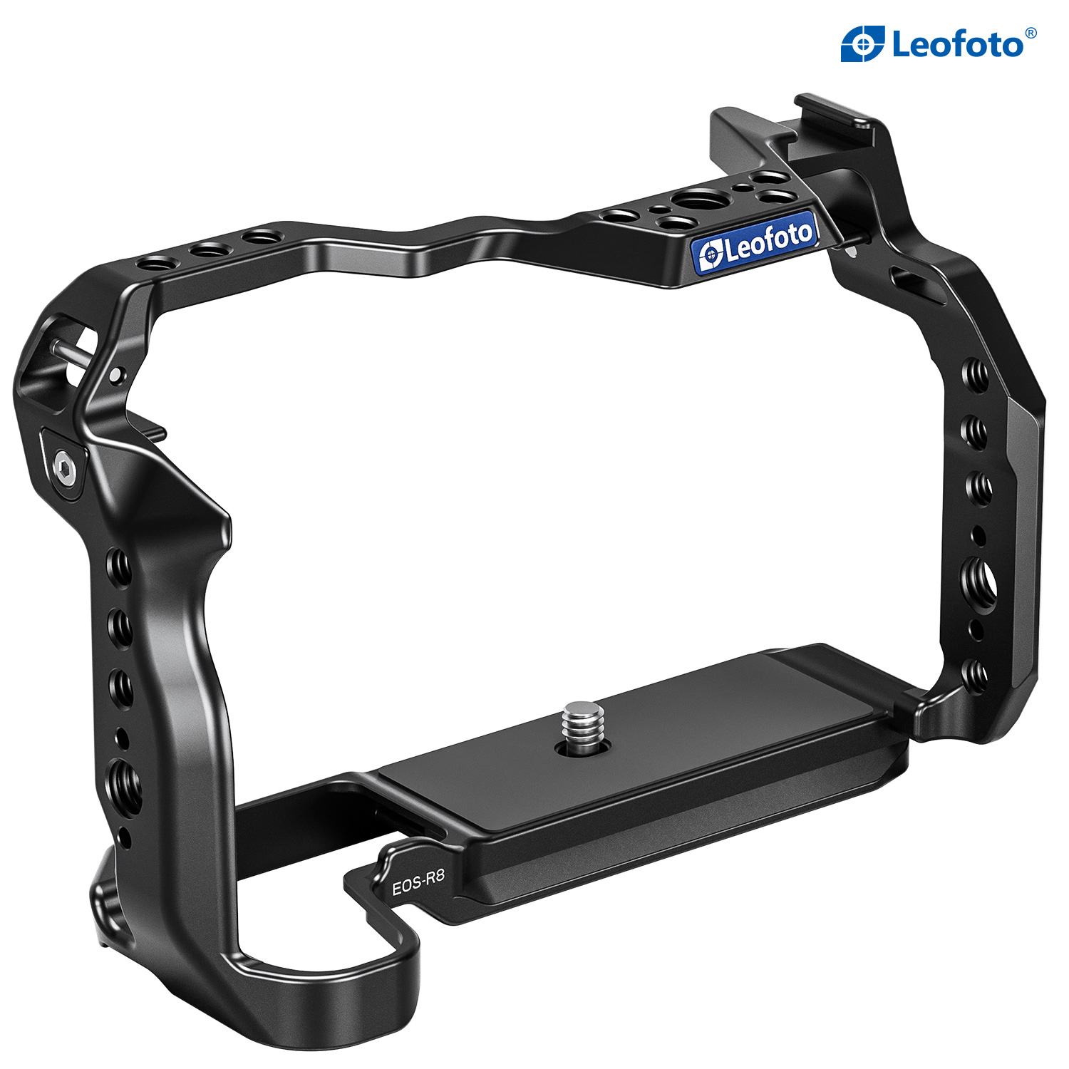 Protect your Canon EOS-R8 from the rigors of the production day while also providing multiple accessory mounting points that won’t stress your camera’s body with this form-fitting Leofoto EOS-R8 Custom Cage for Canon EOS-R8 Camera. The cage features one cold shoe mount on top of the cage and one on the side, as well as multiple 1/4″-20 and 3/8″-16 threaded accessory-mounting holes. The 3/8″-16 threaded holes feature anti-twist divots.
