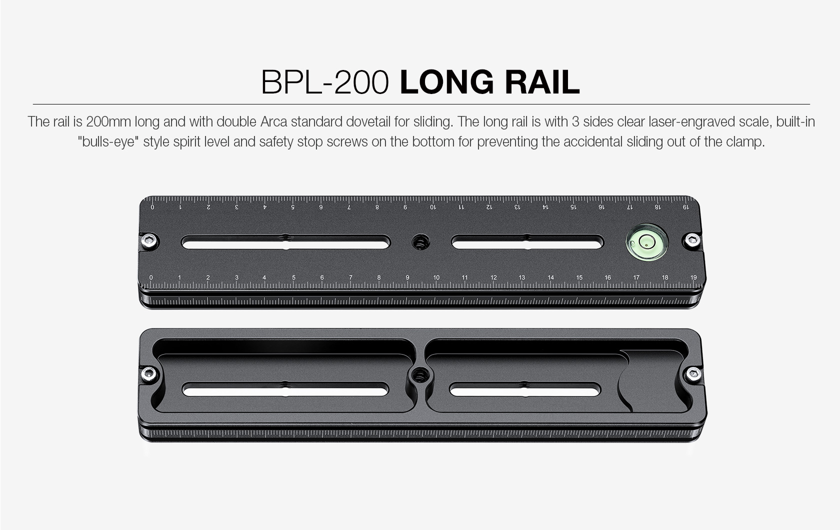 BPL-200 Double Arca Long Rail (200mm / 7.87in)This rail features an Arca profile on the bottom and top of the rail, which allows for multiple mounting options at any position. The bottom profile enables the rail to be moved to any position in an Arca clamp, accommodating a variety of installed equipment. A large top-mounted bubble level allows for quick and easy leveling of the rail for level panning and accurate measurements.