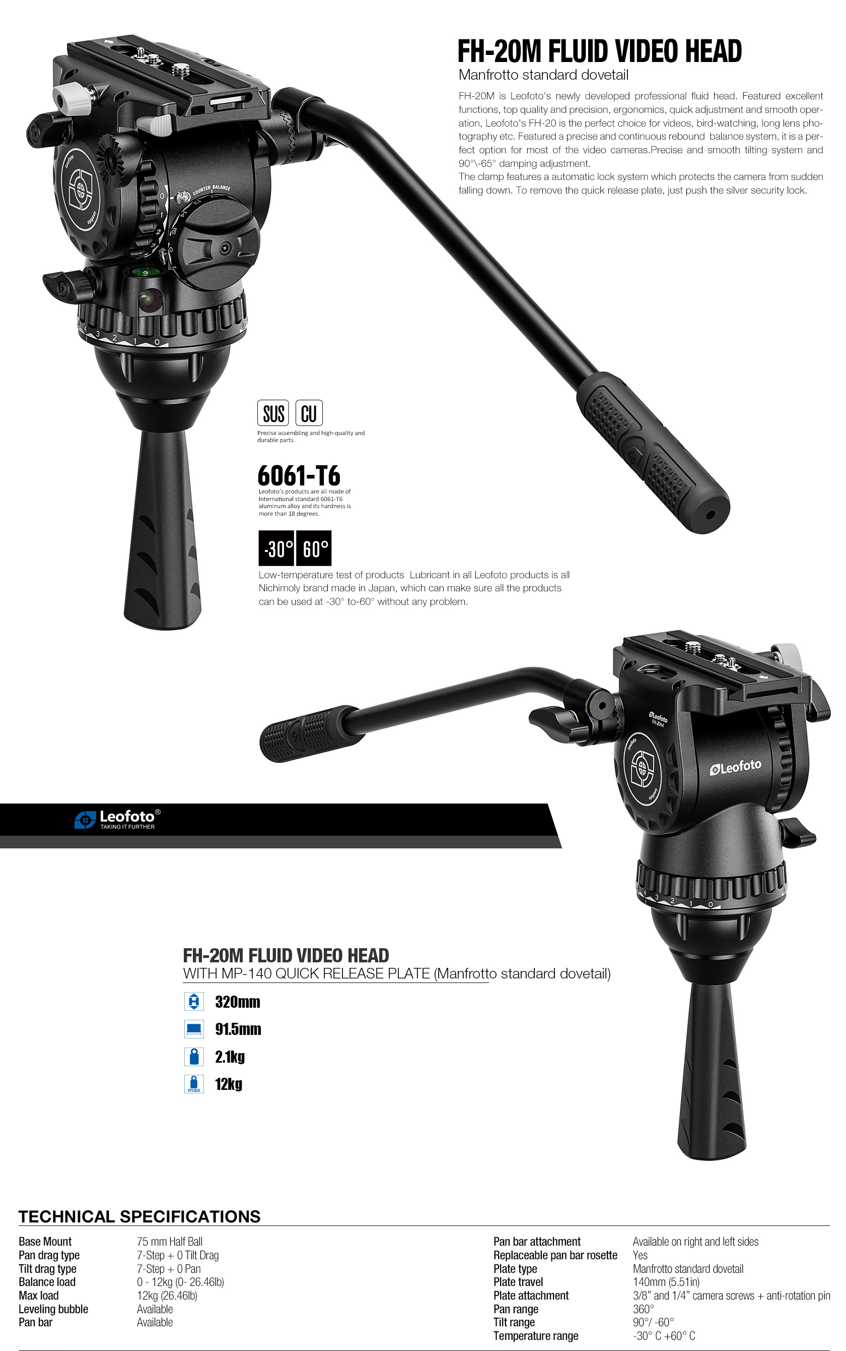 The FH-20M’s combination of precision engineering, flexible adjustment, and high-quality construction makes it an outstanding choice for cinematographers seeking professional fluid head performance. Its Arca-Swiss-compatible camera plate and extensive drag options allow for precise control over every pan and tilt movement, ensuring smooth, cinematic shots.