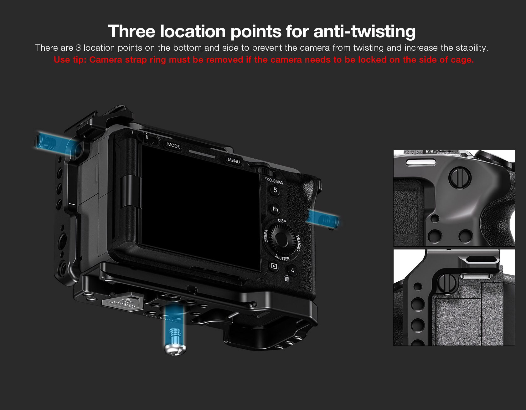 This formfitting anodized aircraft-grade aluminum cage maintains access to the camera’s controls and features a variety of mounting options. A raised front plate prevents your camera from twisting in the cage and has tapped holes for mounting optional accessories such as lens supports.