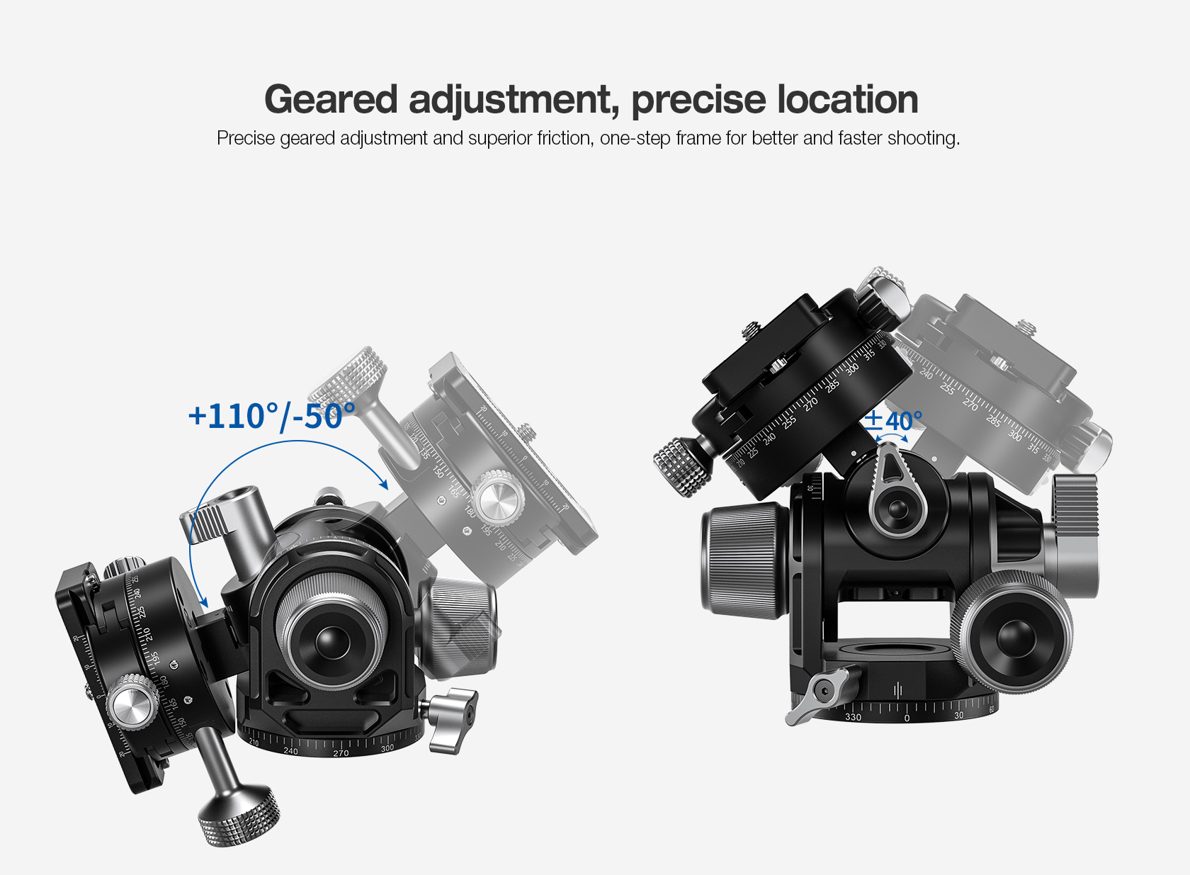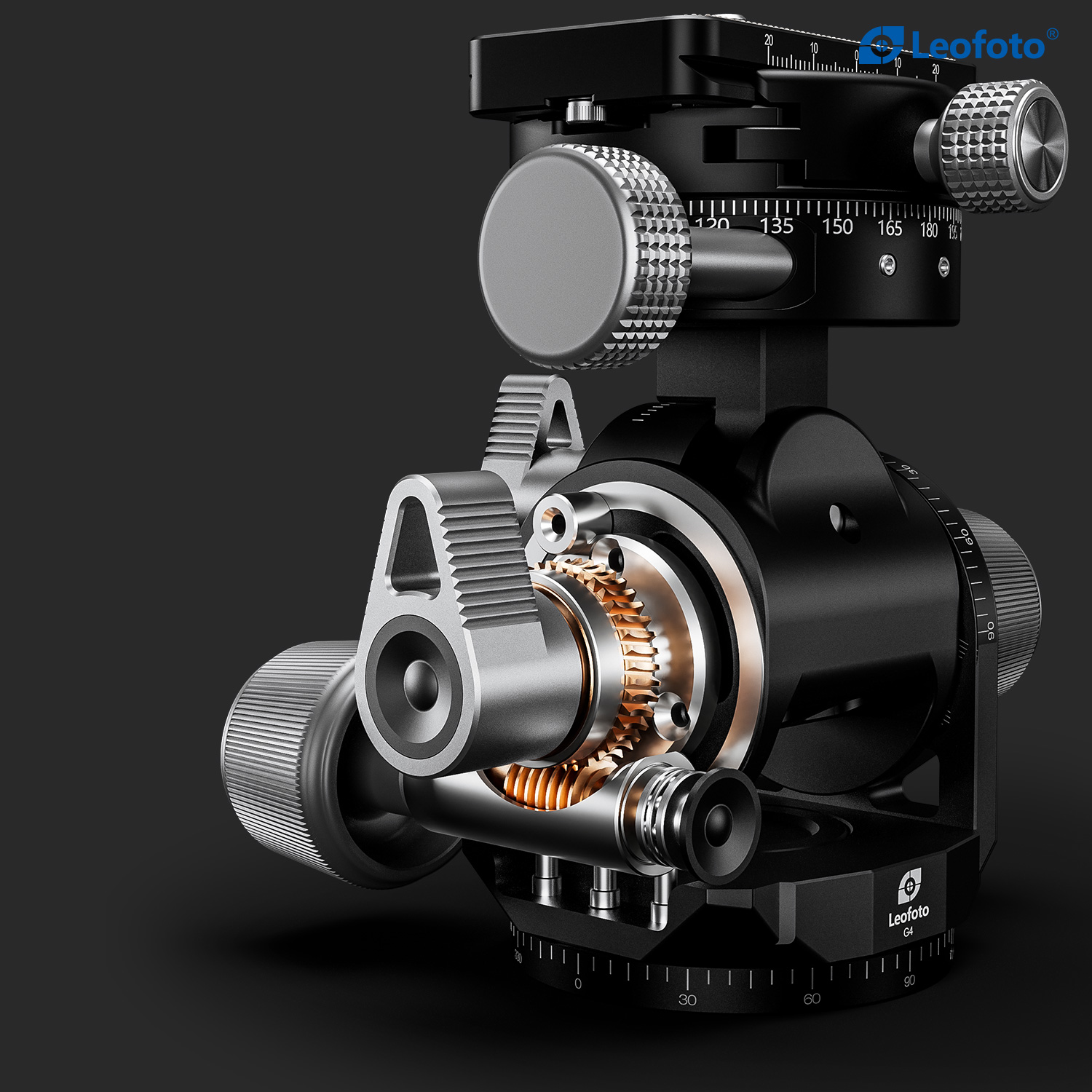Tilt and pivot your camera in three-dimensional space with the Leofoto G4ProM Geared Head, which combines the advantages of a ball head and a 3D tilt head in one compact system. When both X- and Y-axes are open, one can move the camera freely but, as opposed to a ball head, the X- and Y-axis movements can also be made individually. If one of these axes is fixed, movements can be performed with even more precision.