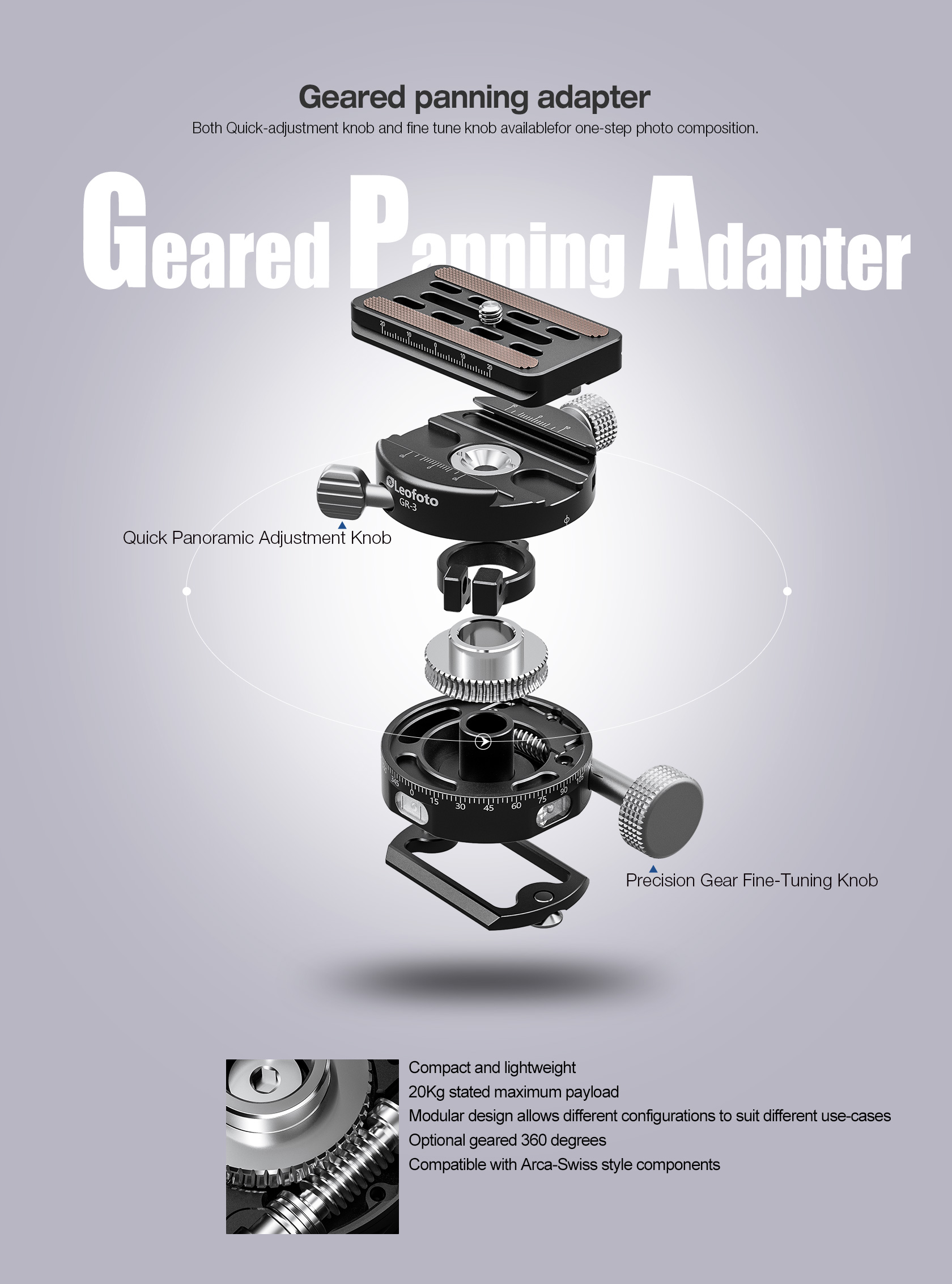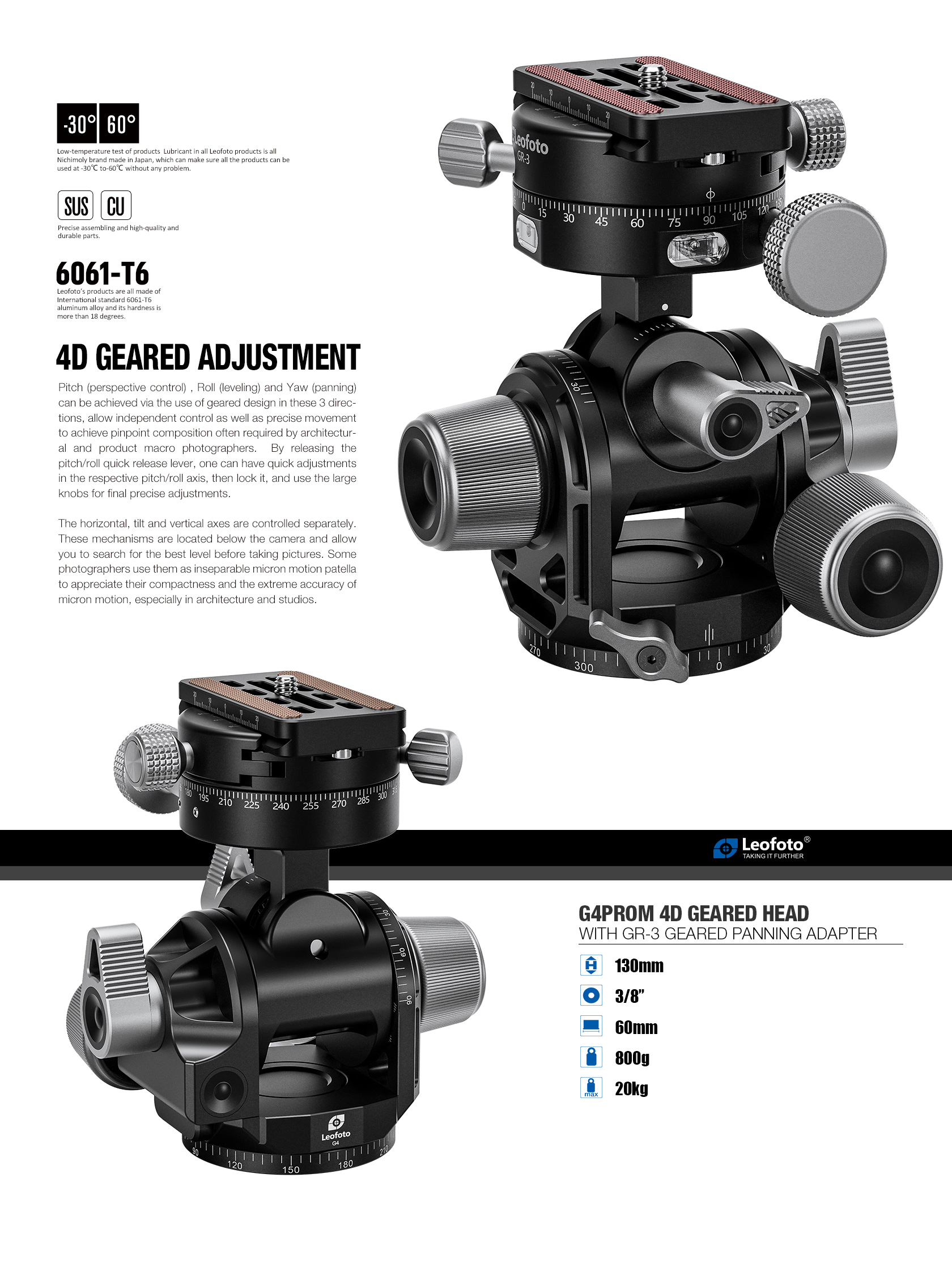 Leofoto G4ProM Four Way Geared Head with Geared Panning Adapter
