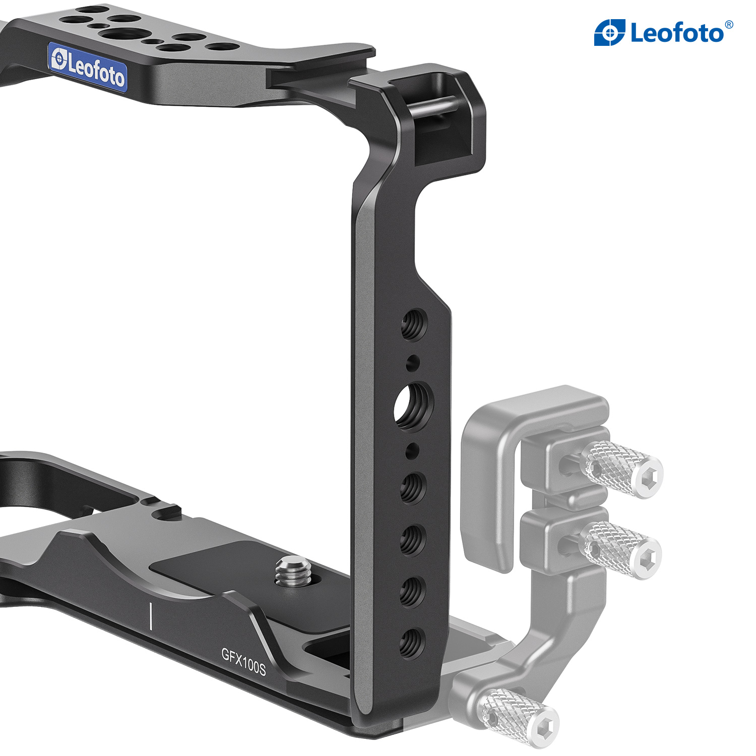 The Leofoto GFX100S Custom Cage for FUJIFILM GFX100S/GFX50S II is precision machined from solid blocks of 6061-T6 aluminum. This cage features a 1/4”-20 mounting screw, compatible with any Arca-style clamp. The cage is precisely designed to fit the camera body without interference in the operation of the camera. There are multiple mounting threads on the cage to attach accessories such as microphones, handles, flashlights etc. There is also a magnetized allenkey on the bottom which is very convenient.