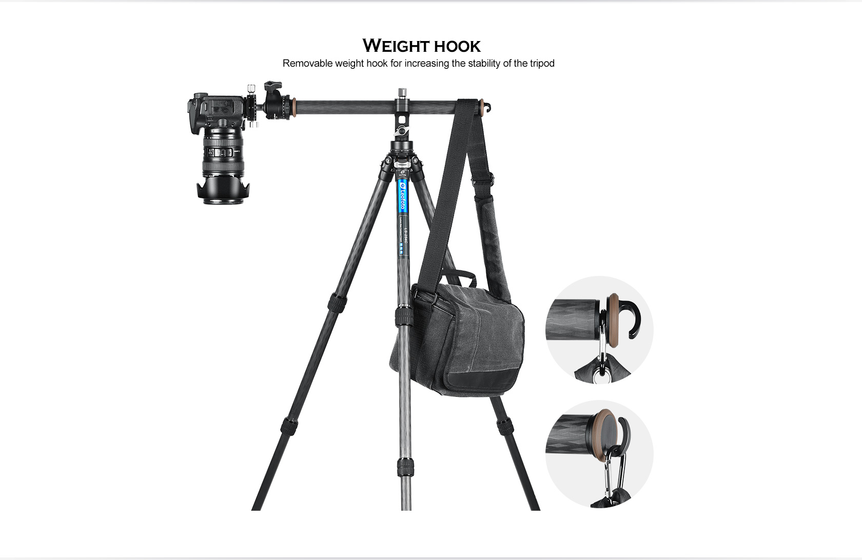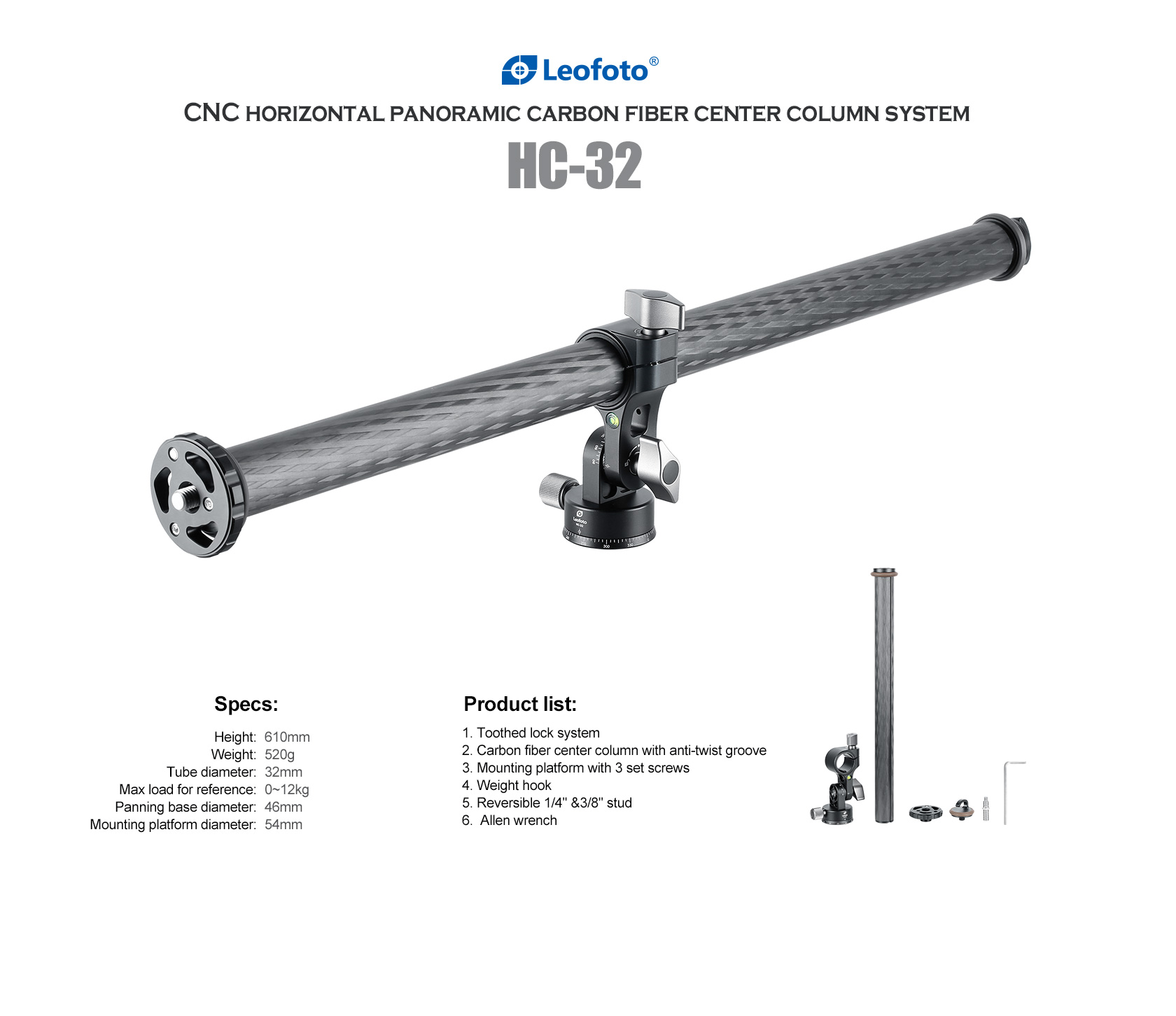 The Leofoto HC Series Horizontal Panoramic Carbon Fiber Center Column System is a carbon fiber extension set that allows an adjustable center column to be added to a tripod without a center column. The rugged but lightweight carbon-fiber column can be rotated a full 360° and tilted 180° from horizontal to fully vertical in either a standard or inverted orientation. One end of the column features a mounting platform with a reversible 1/4″-20 to 3/8″-16 mounting stud and three set screws to securely mount virtually any tripod head and prevent it from rotating. The other end of the column is a weight hook that can be fully rotated so that it can always be facing up to receive a sandbag, equipment bag strap, or other type of ballast. It comes in two sizes, the HC-28 and the HC-32 with the latter having a kit option.
