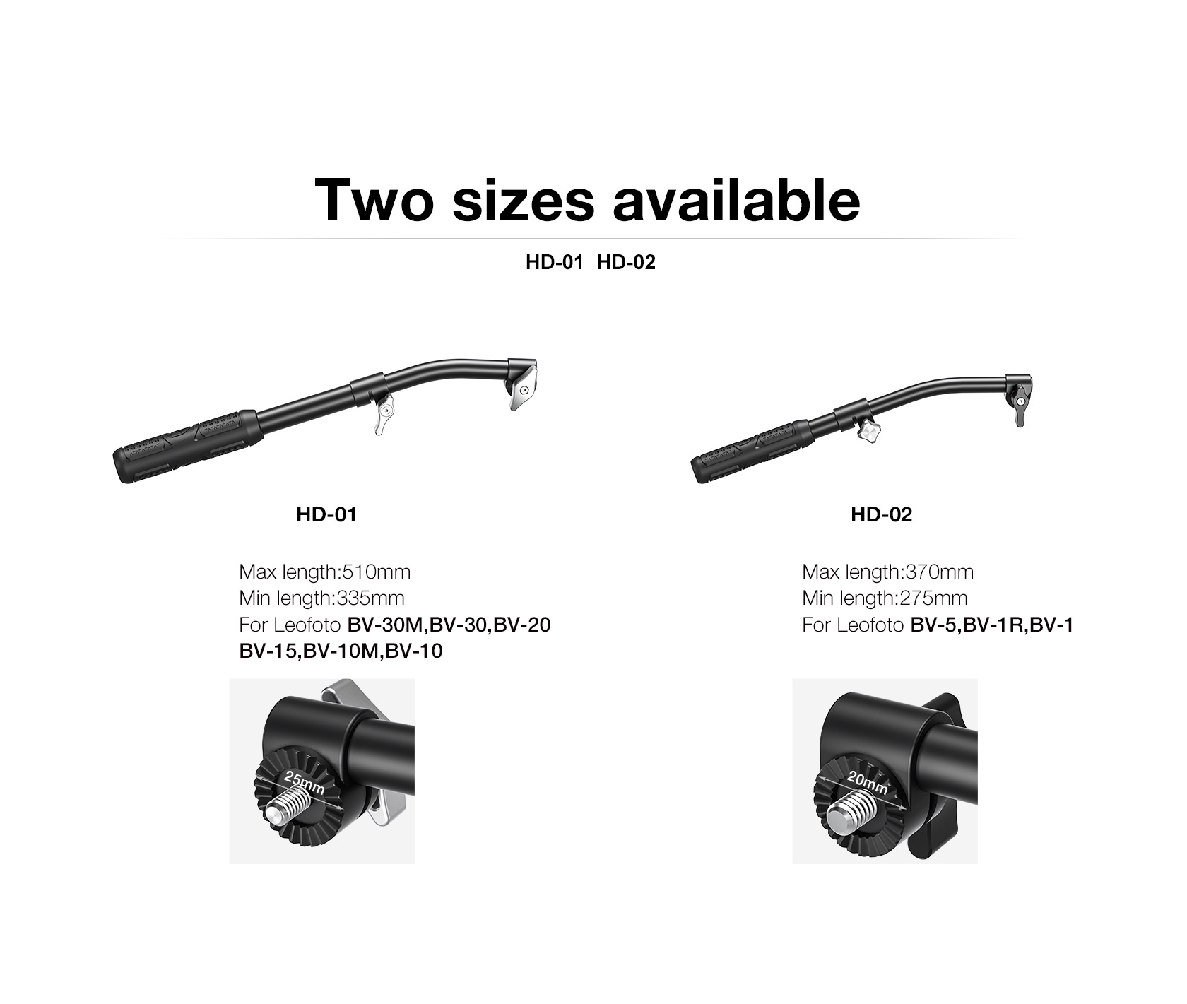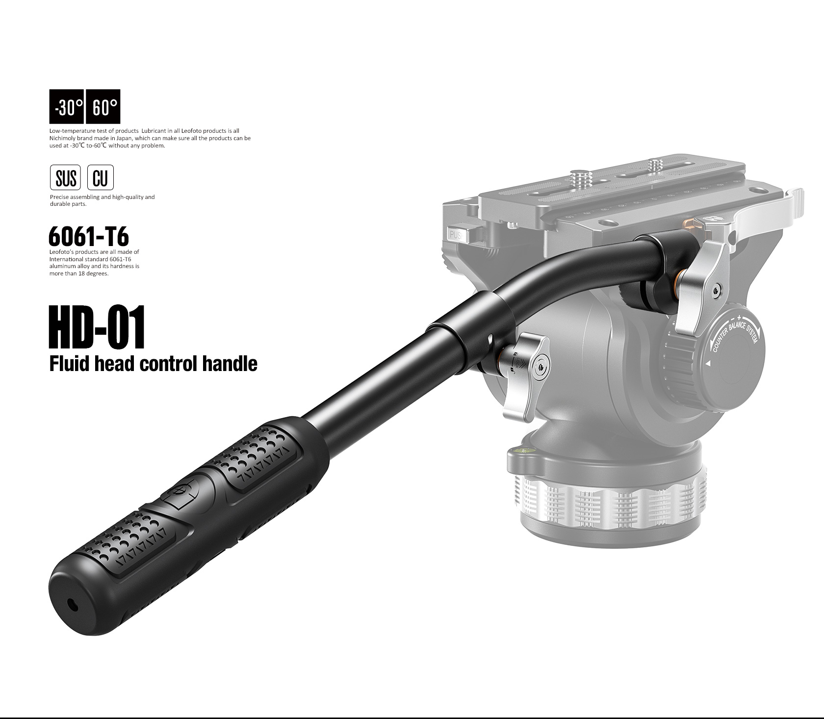 The Leofoto HD-01 is a 2-section handle for Leofoto BV-30M, BV-30,BV-20,BV-15 Fluid Heads. This handle features a silicone handle for added comfort. It can be extended from 335mm to 510mm.