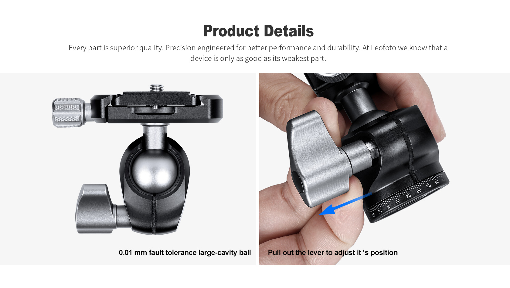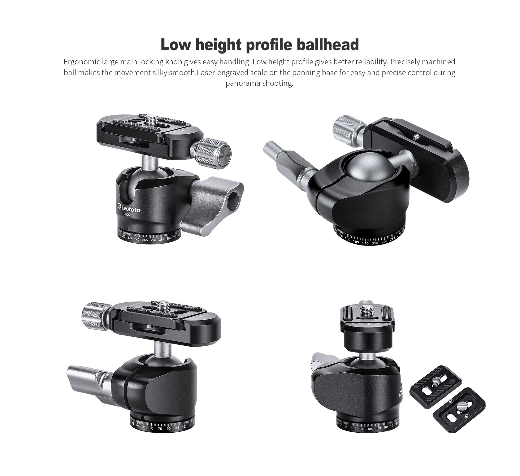The Leofoto LH Series Ball Head is a great support solution in a small form factor for all general photography, and will give you fast and accurate control and solid support of your camera or lens. Aiming and horizon leveling can be accomplished as one instinctive motion, and rigid lockup takes just a quick twist of one control. Since the ball head profile is smaller and lacks the protruding handles, they are also much easier to carry and pack. These are no-nonsense heads with robust capacity, offering minimal weight and elegant simplicity. They excel as ground-level macro tools, but also as super light heads for backpacking, travel, and table top use. The head features a single ball locking knob while the panning base has a separate lock and is laser-engraved in 2.5-degree increments from 0-360 degrees for accurate repeatability.