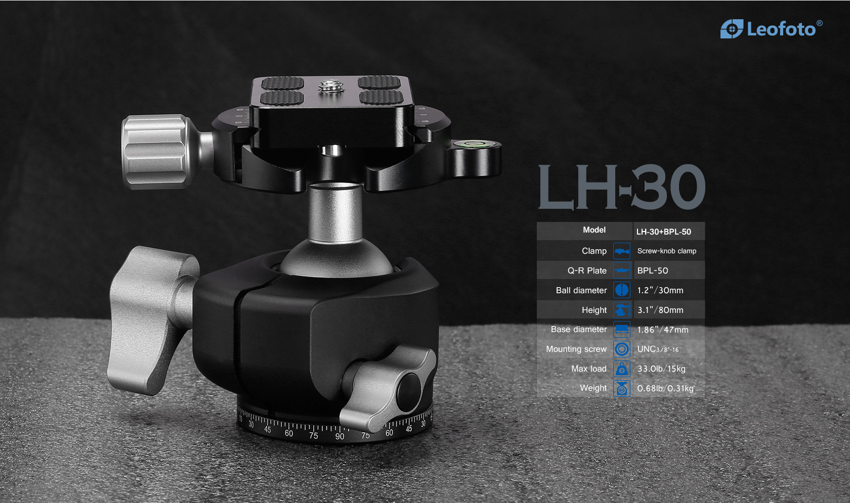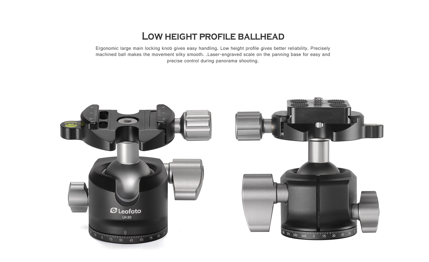 The Leofoto LH Series Ball Head is a great support solution in a small form factor for all general photography, and will give you fast and accurate control and solid support of your camera or lens. Aiming and horizon leveling can be accomplished as one instinctive motion, and rigid lockup takes just a quick twist of one control. Since the ball head profile is smaller and lacks the protruding handles, they are also much easier to carry and pack. These are no-nonsense heads with robust capacity, offering minimal weight and elegant simplicity. They excel as ground-level macro tools, but also as super light heads for backpacking, travel, and table top use. The head features a single ball locking knob while the panning base has a separate lock and is laser-engraved in 2.5-degree increments from 0-360 degrees for accurate repeatability.