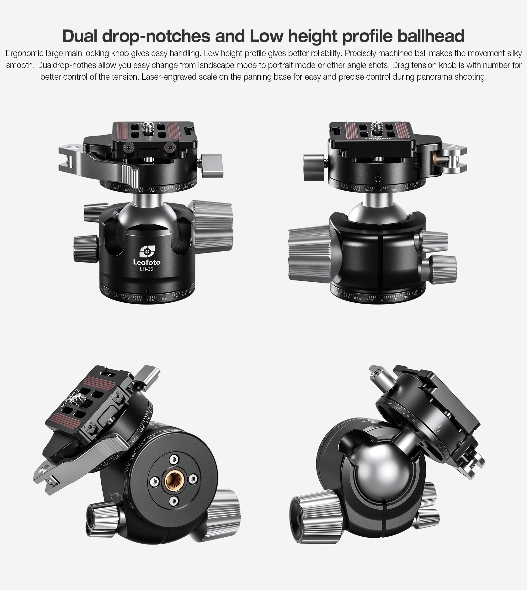 The Leofoto LH Series Ball Head is a great support solution in a small form factor for all general photography, and will give you fast and accurate control and solid support of your camera or lens. Aiming and horizon leveling can be accomplished as one instinctive motion, and rigid lockup takes just a quick twist of one control. Since the ball head profile is smaller and lacks the protruding handles, they are also much easier to carry and pack. These are no-nonsense heads with robust capacity, offering minimal weight and elegant simplicity. They excel as ground-level macro tools, but also as super light heads for backpacking, travel, and table top use. The head features a single ball locking knob while the panning base has a separate lock and is laser-engraved in 2.5-degree increments from 0-360 degrees for accurate repeatability.