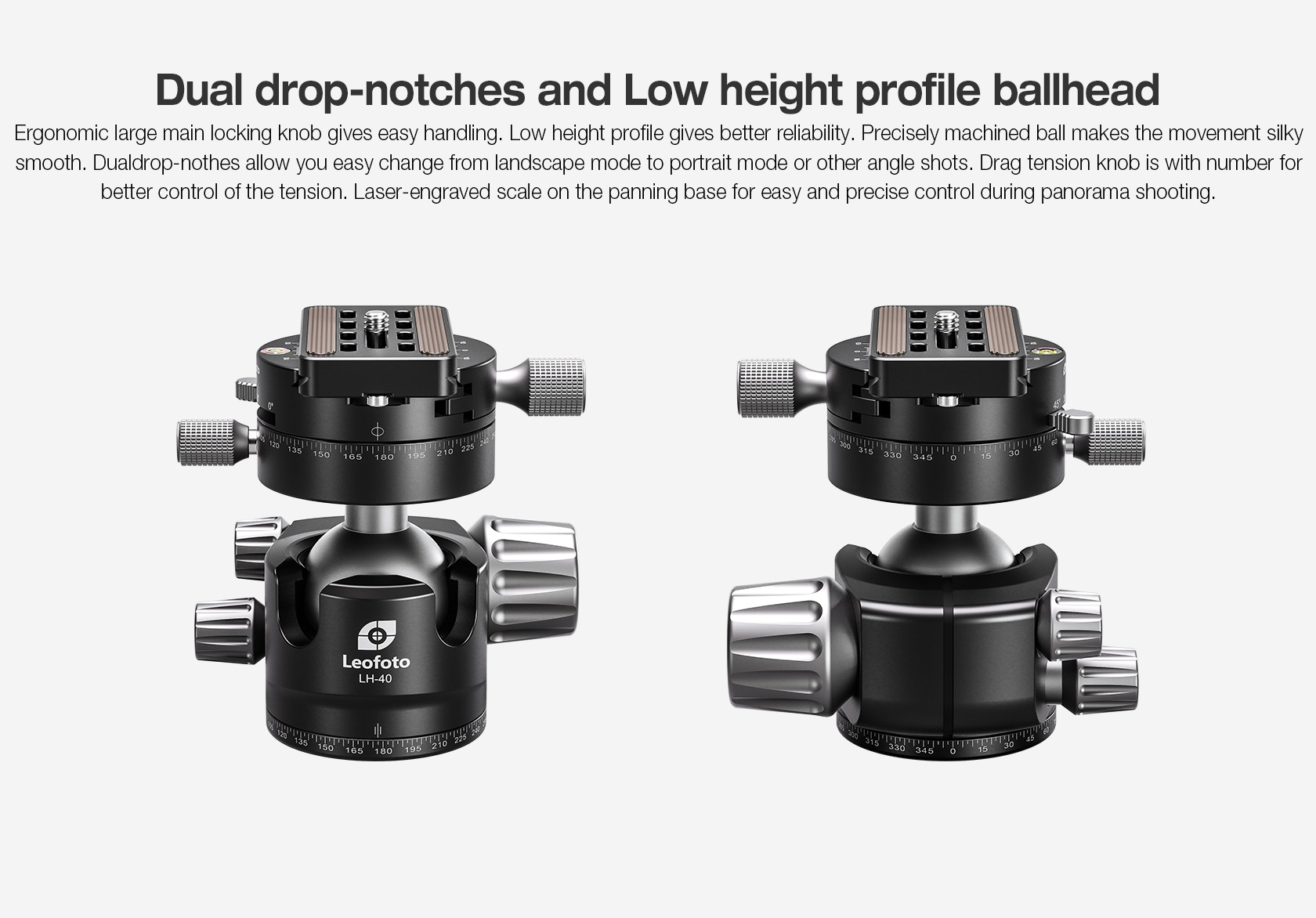 The Leofoto LH Series Ball Head is a great support solution in a small form factor for all general photography, and will give you fast and accurate control and solid support of your camera or lens. Aiming and horizon leveling can be accomplished as one instinctive motion, and rigid lockup takes just a quick twist of one control. Since the ball head profile is smaller and lacks the protruding handles, they are also much easier to carry and pack. These are no-nonsense heads with robust capacity, offering minimal weight and elegant simplicity. They excel as ground-level macro tools, but also as super light heads for backpacking, travel, and table top use. The head features a single ball locking knob while the panning base has a separate lock and is laser-engraved in 2.5-degree increments from 0-360 degrees for accurate repeatability.