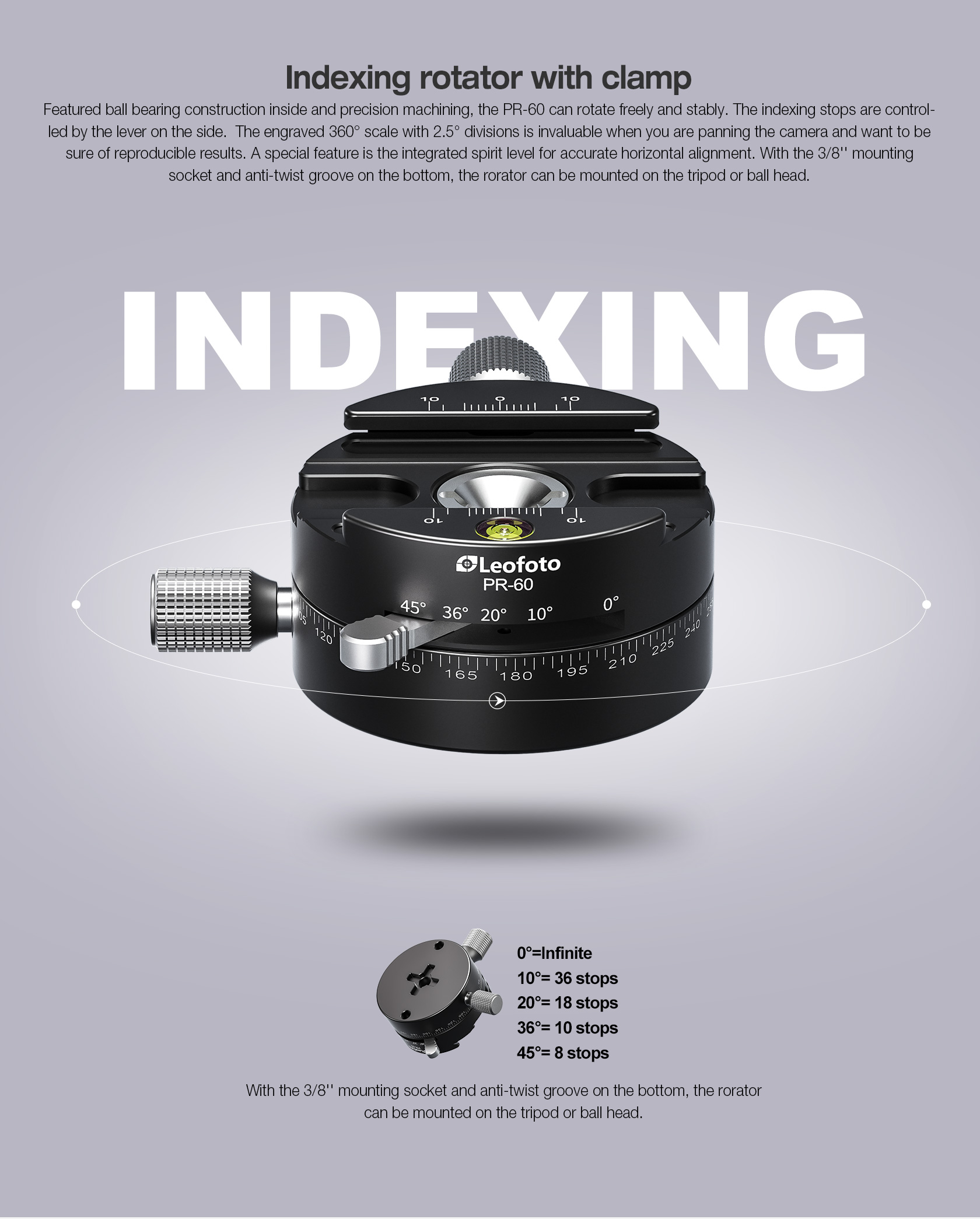 * Panning base is laser-engraved at 2.5-degree intervals, zero to 360-degrees