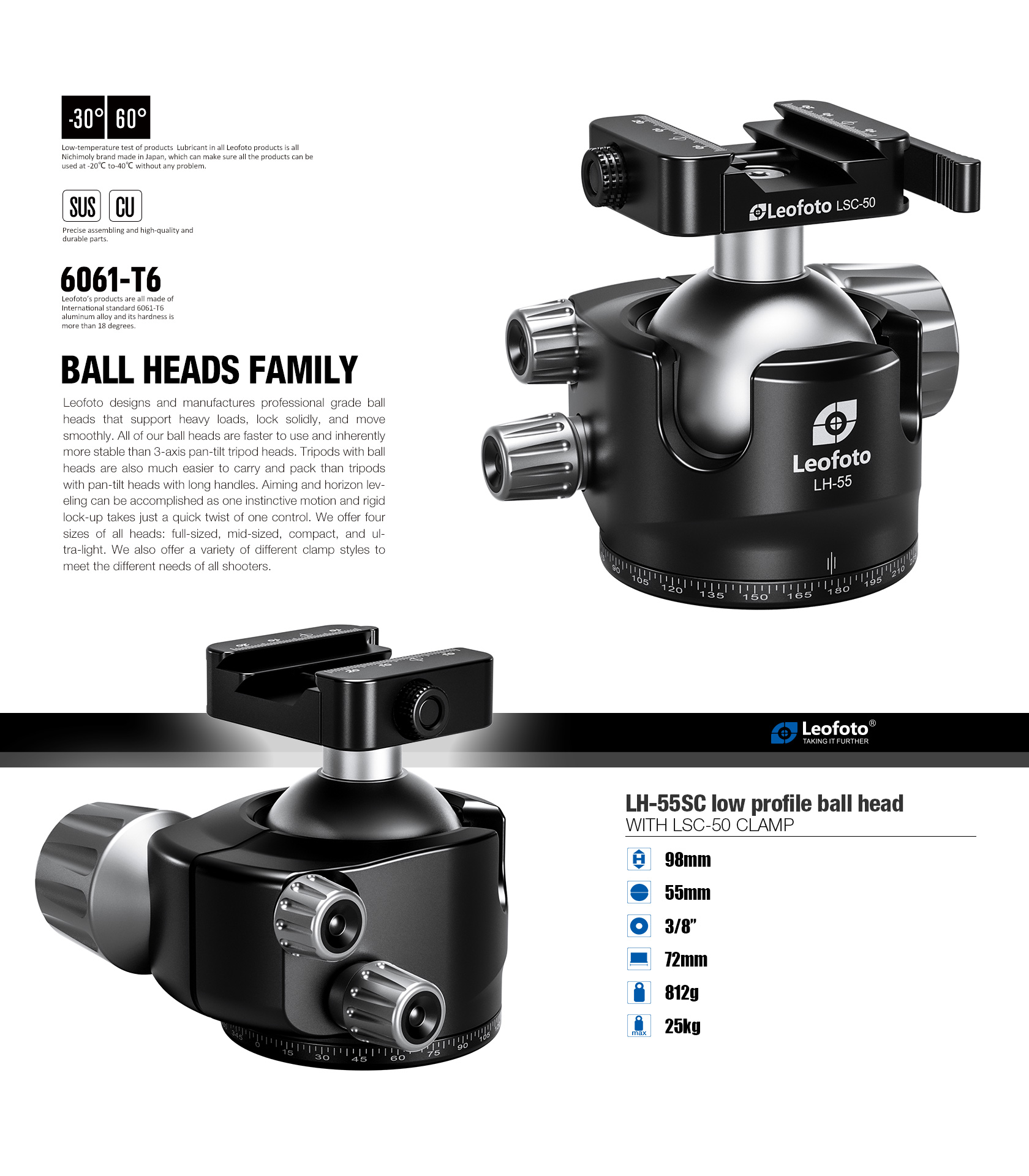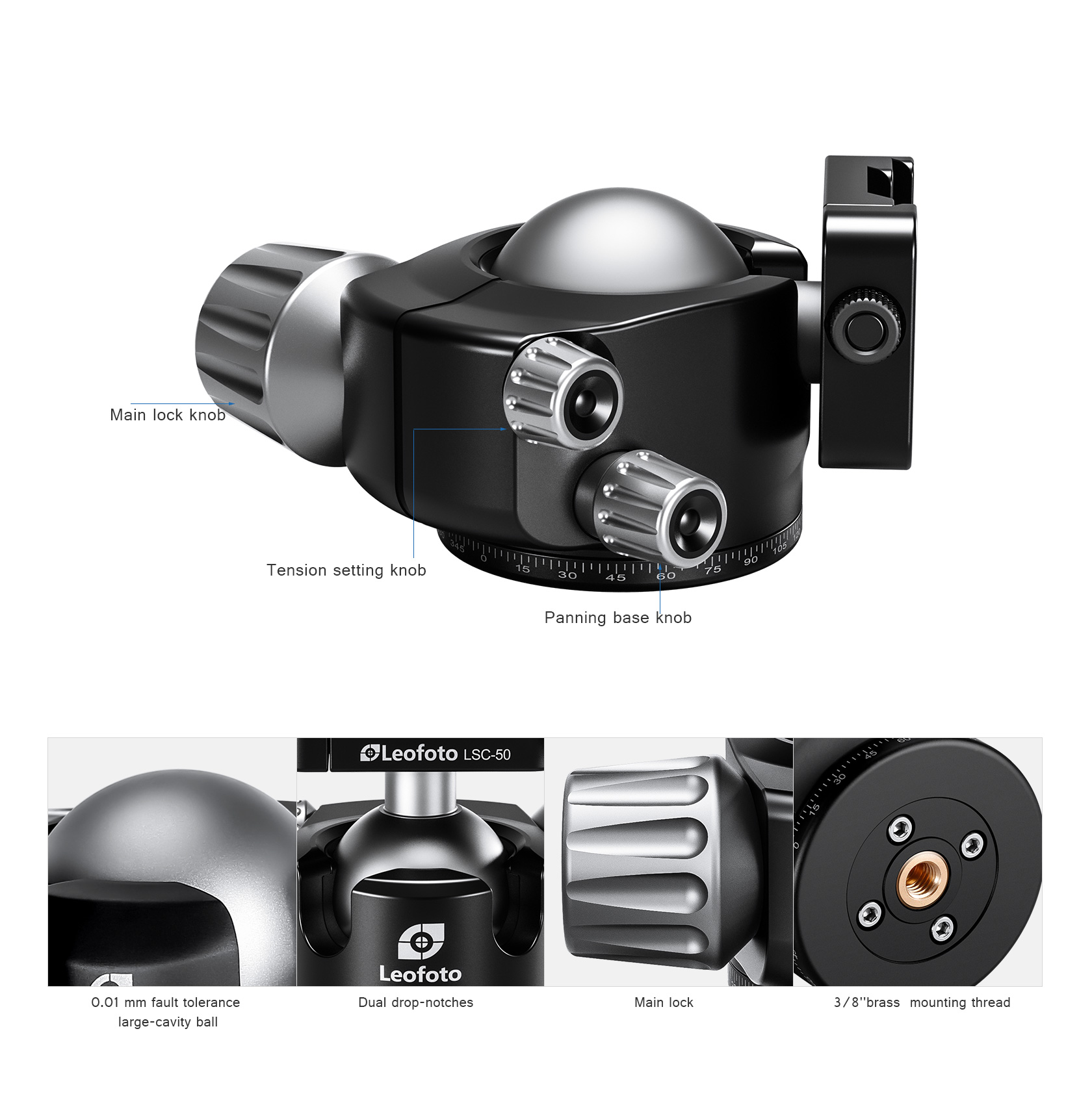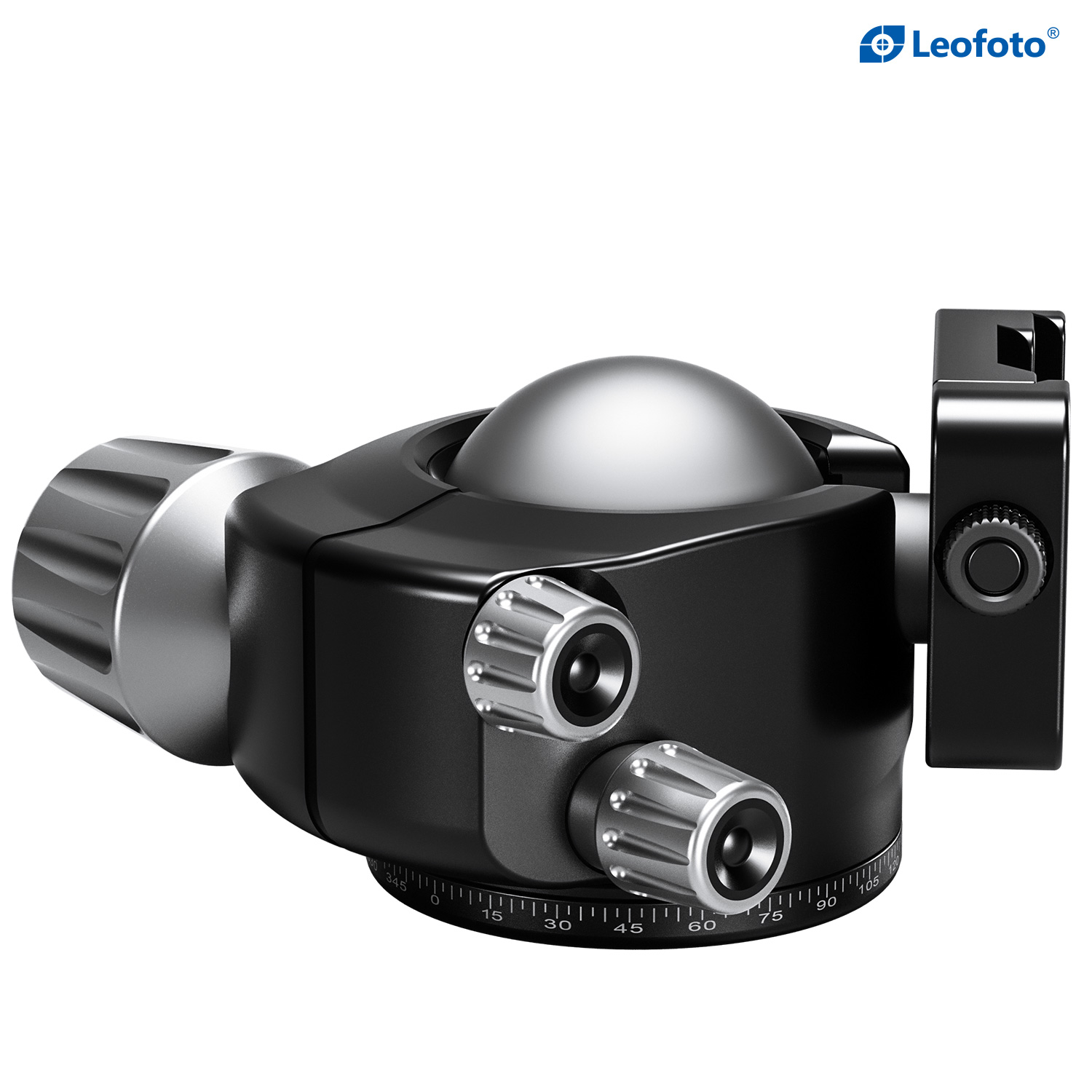 Crafted from high-grade aircraft aluminum and featuring a durable hard-anodized finish, the Leofoto LH-SC Ball Head Series for Shooting/Hunting is designed to meet the stringent demands of professional shooting and hunting. An over-sized, ergonomic locking knob allows 45-degree tilting in all directions and a 90-degree drop-notch facilitates quick and accurate switching from the horizontal to vertical orientation. A separate tension knob is provided to apply the appropriate pressure that safely corresponds to the weight of your firearm. A third knob loosens and locks the panning base which is laser-engraved with markers every 2.5 degrees from 0 to 360 degrees.