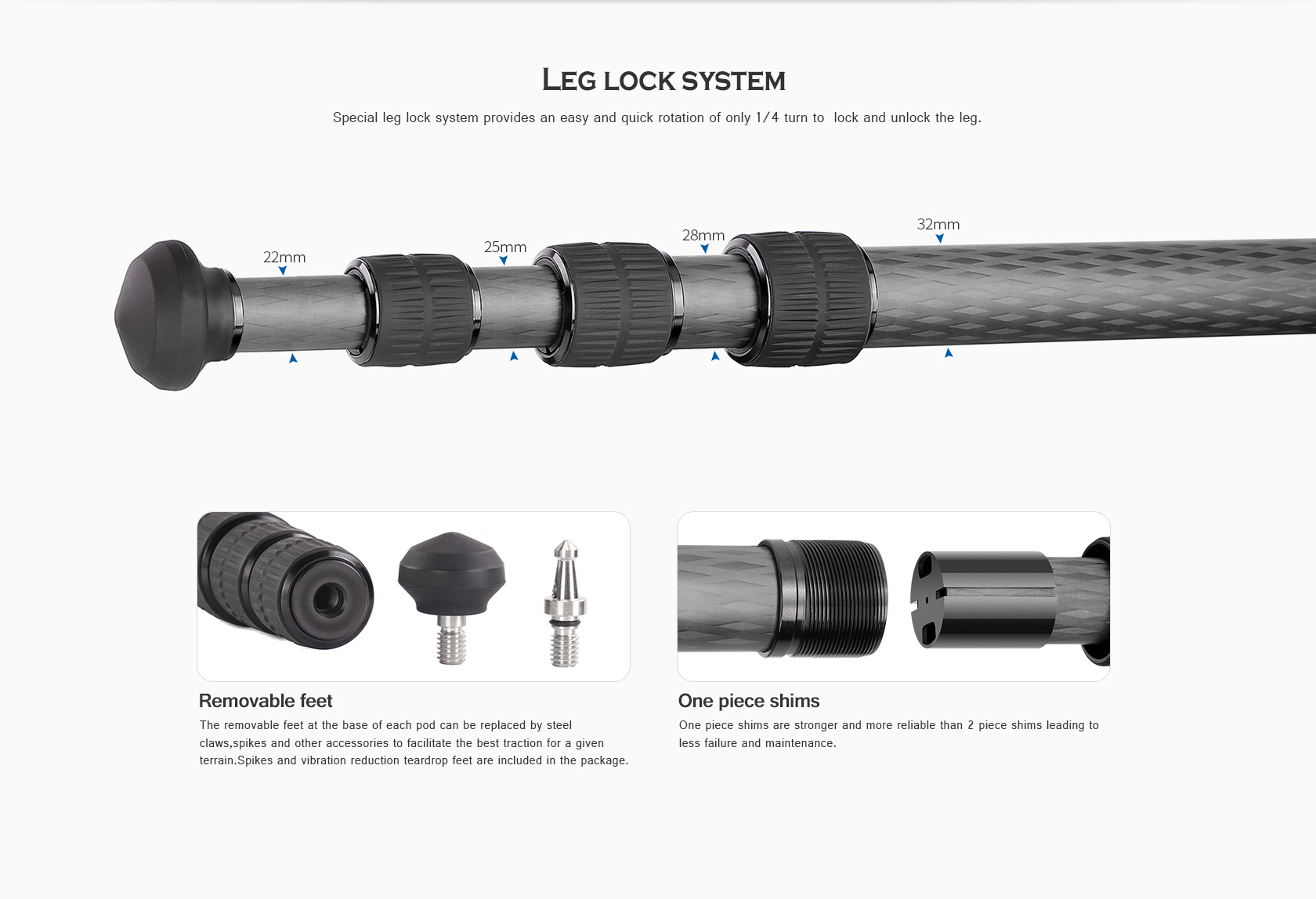 Reach for the top with the Leofoto LM Summit Series Carbon Fiber Tripod. The 4-section support has 10x carbon fiber tubes that make the tripod a lightweight support while maintaining a heavy max load capacity. The 6061 aluminum parts are CNC machined and hard anodized, creating a durable and scratch resistant surface. The twist leg lock system is quick, only requiring a quarter turn, which enables you to completely extend and collapse the tripod rapidly.