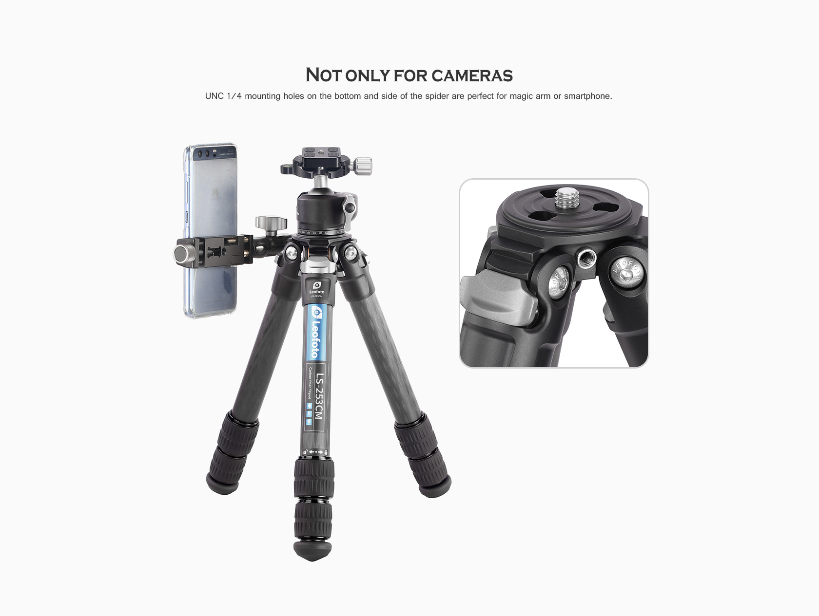 UNC 1/4 mounting holes on the bottom and side of the spider are perfect for magic arm or smartphone.