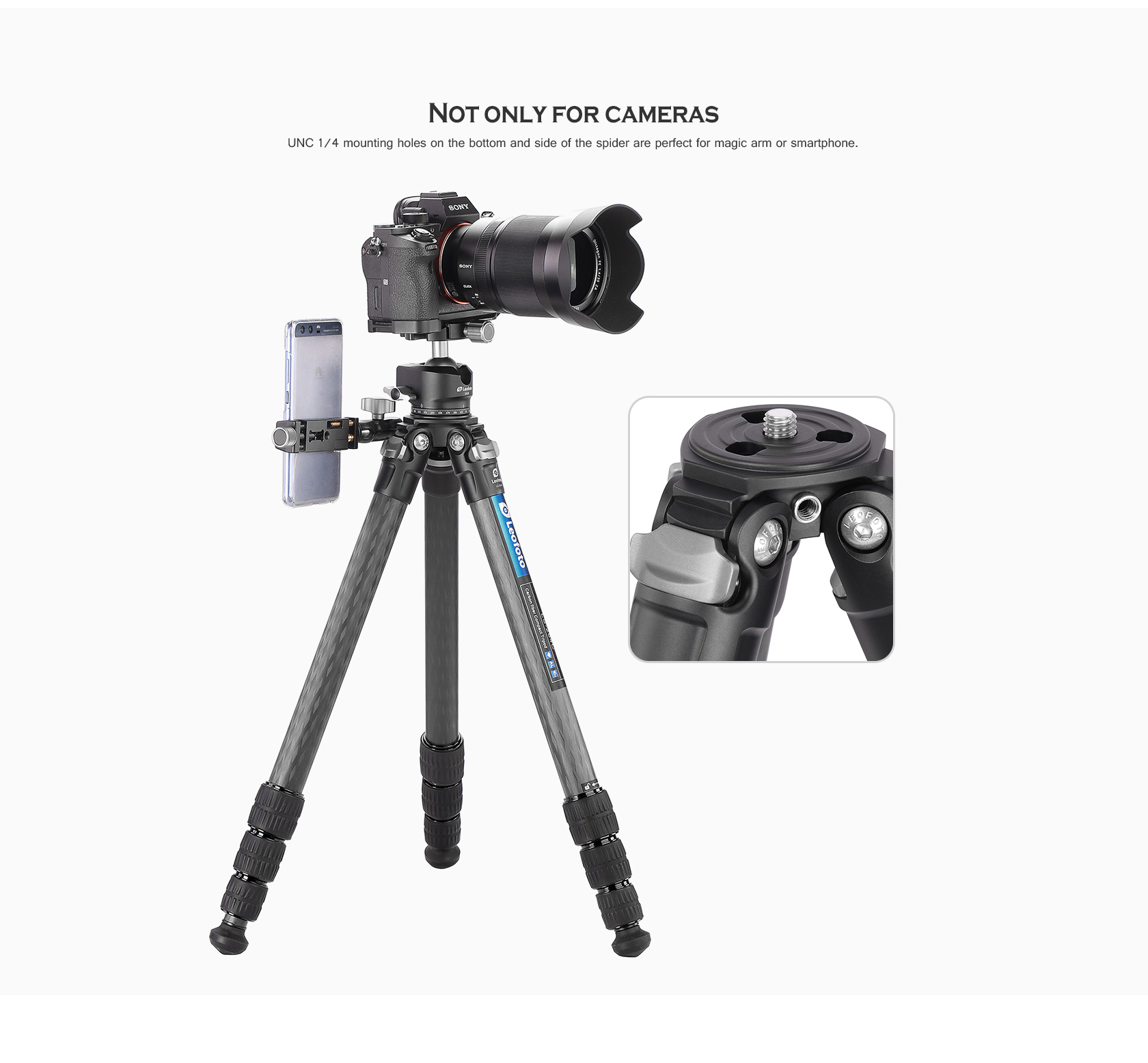 UNC 1/4 mounting holes on the bottom and side of the spider are perfect for magic arm or smartphone.