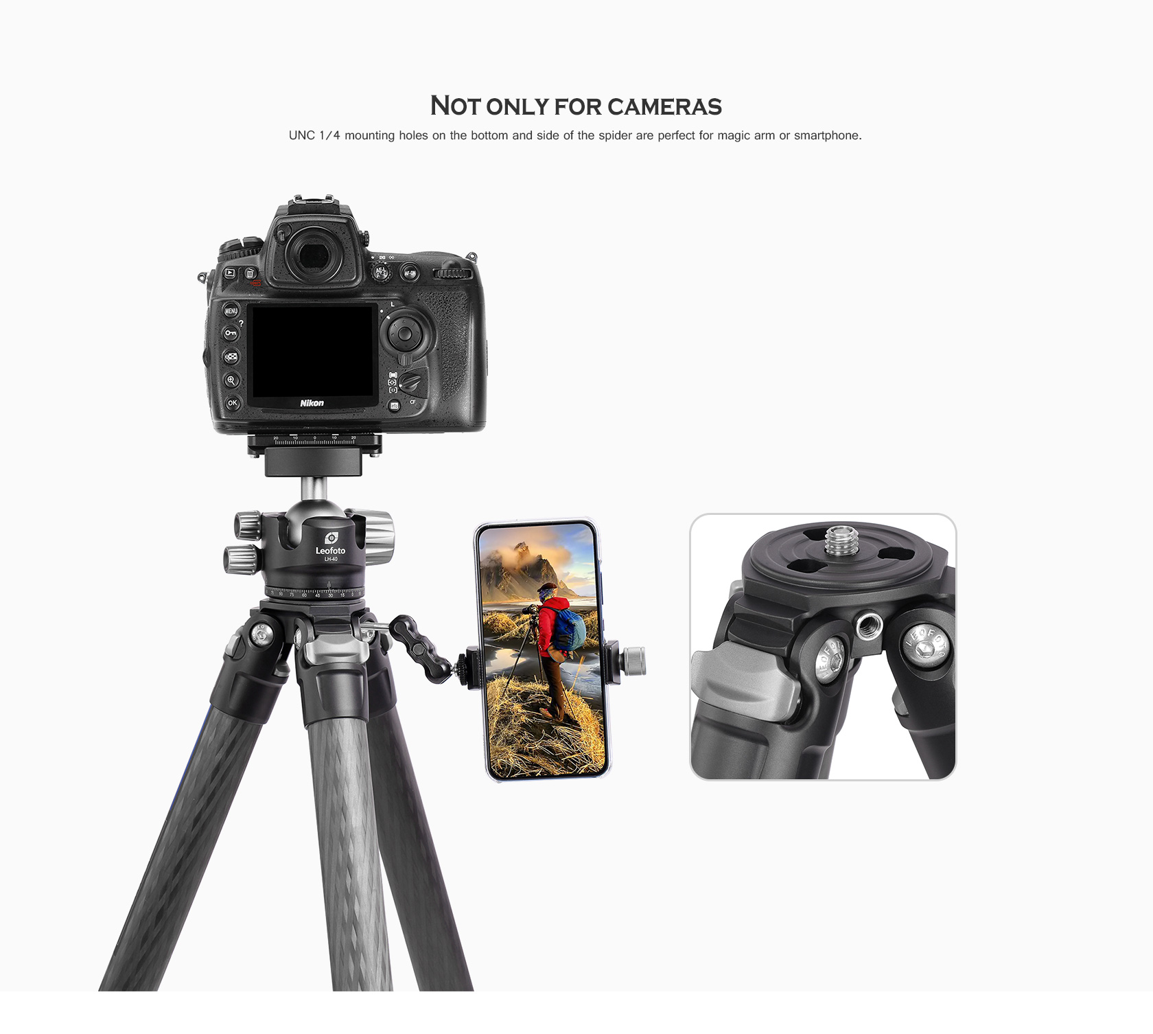 UNC 1/4 mounting holes on the bottom and side of the spider are perfect for magic arm or smartphone.