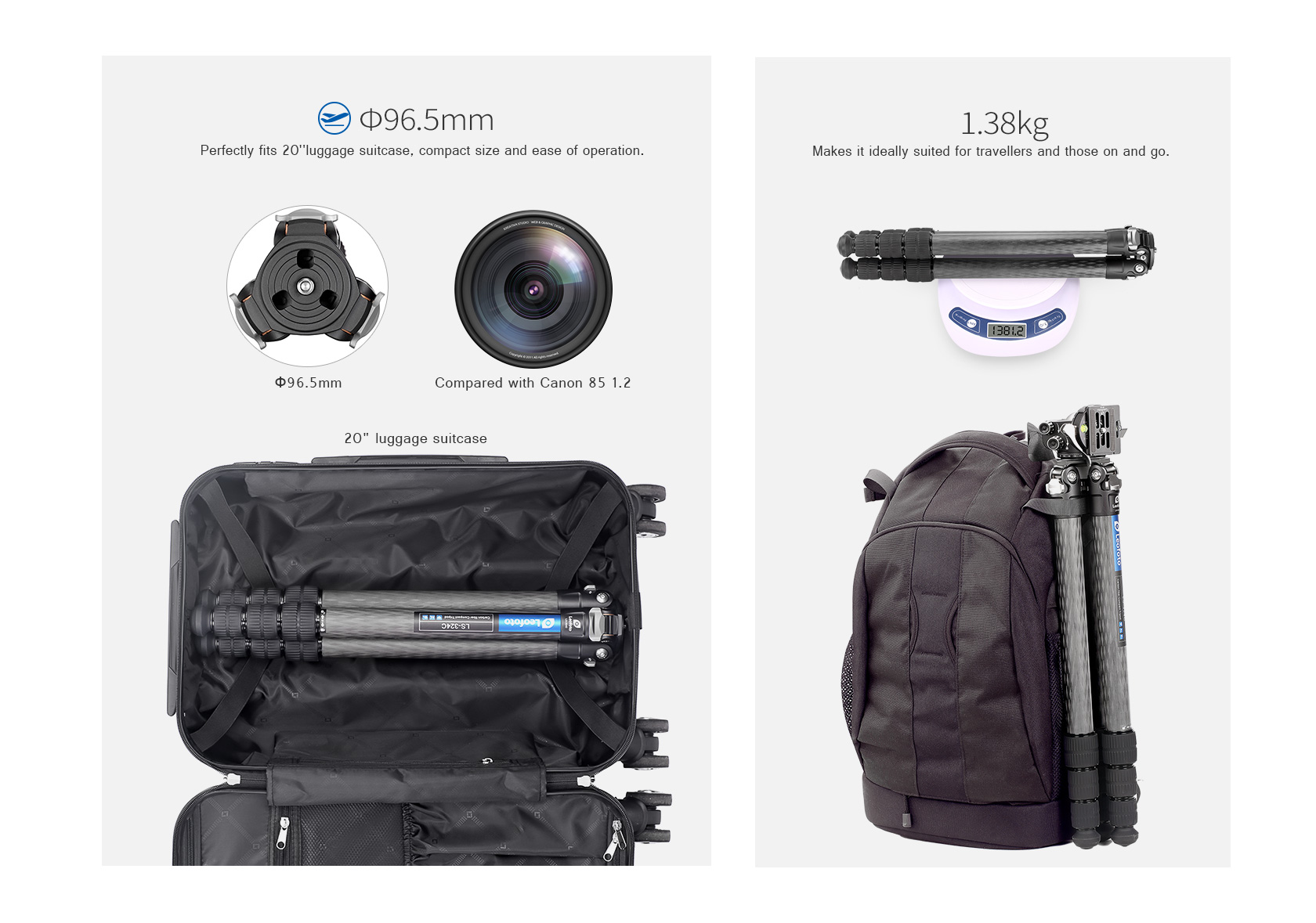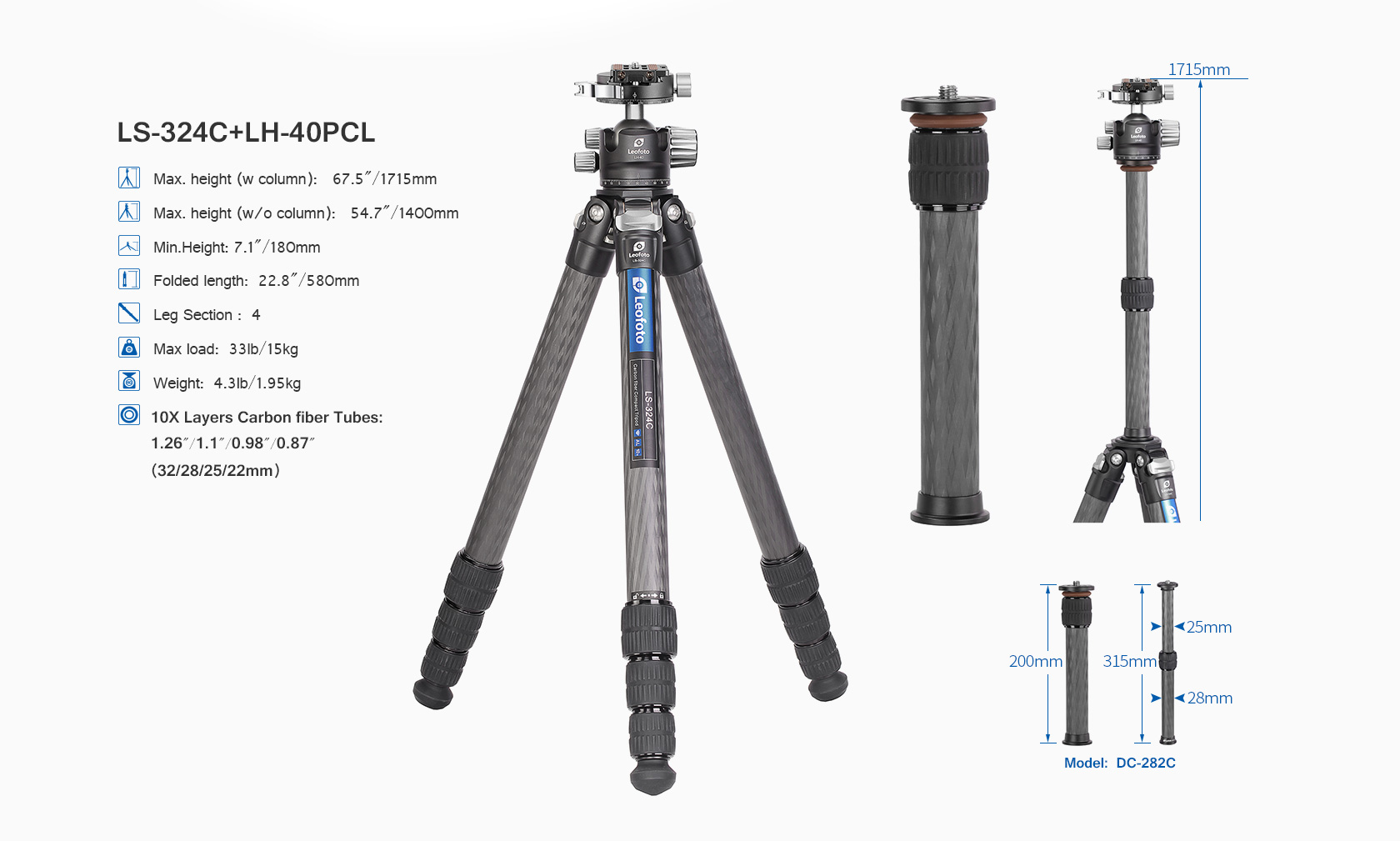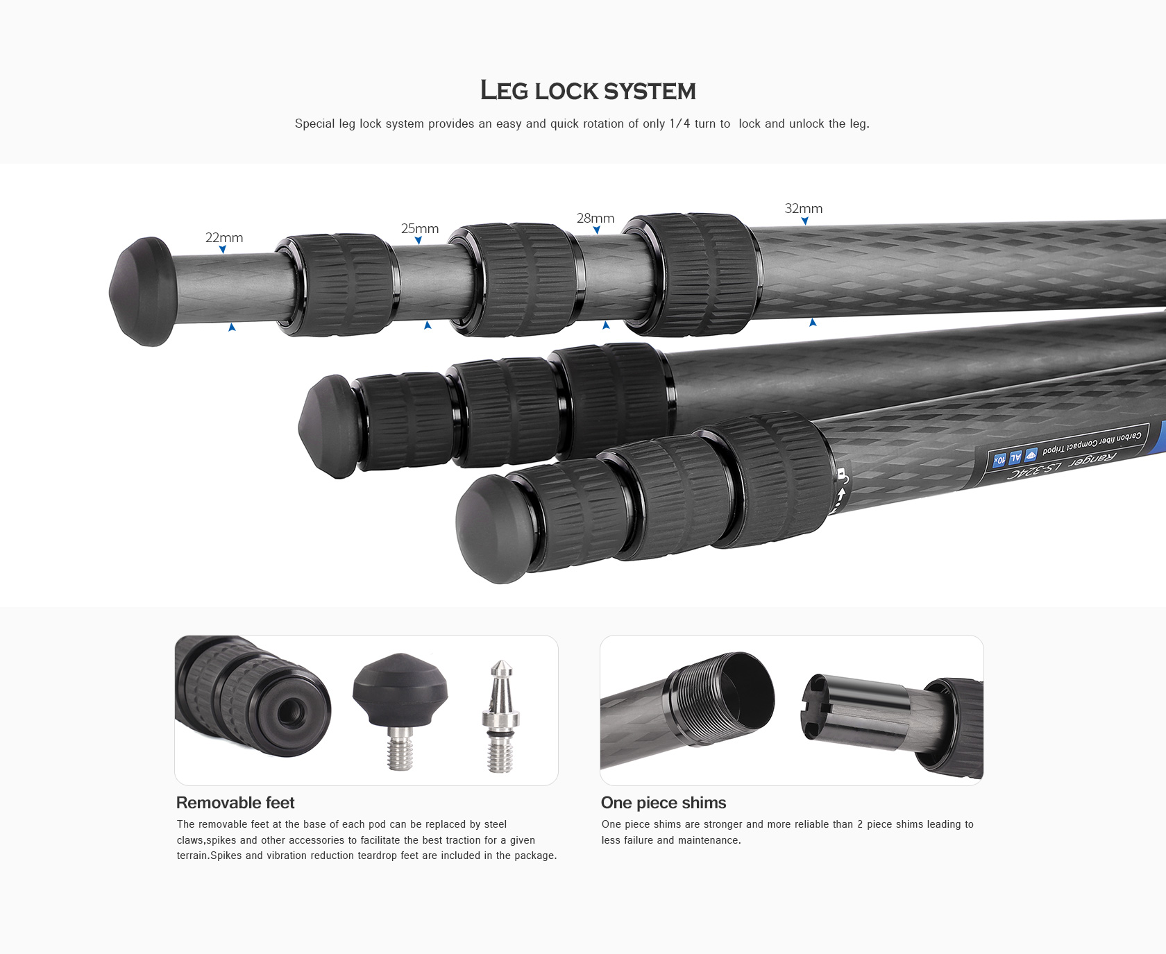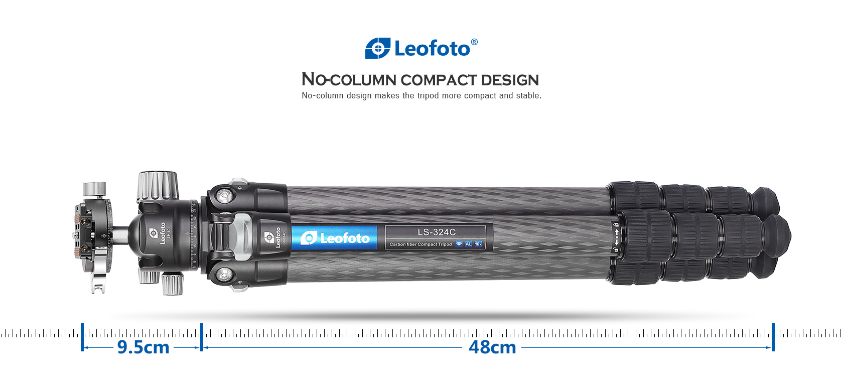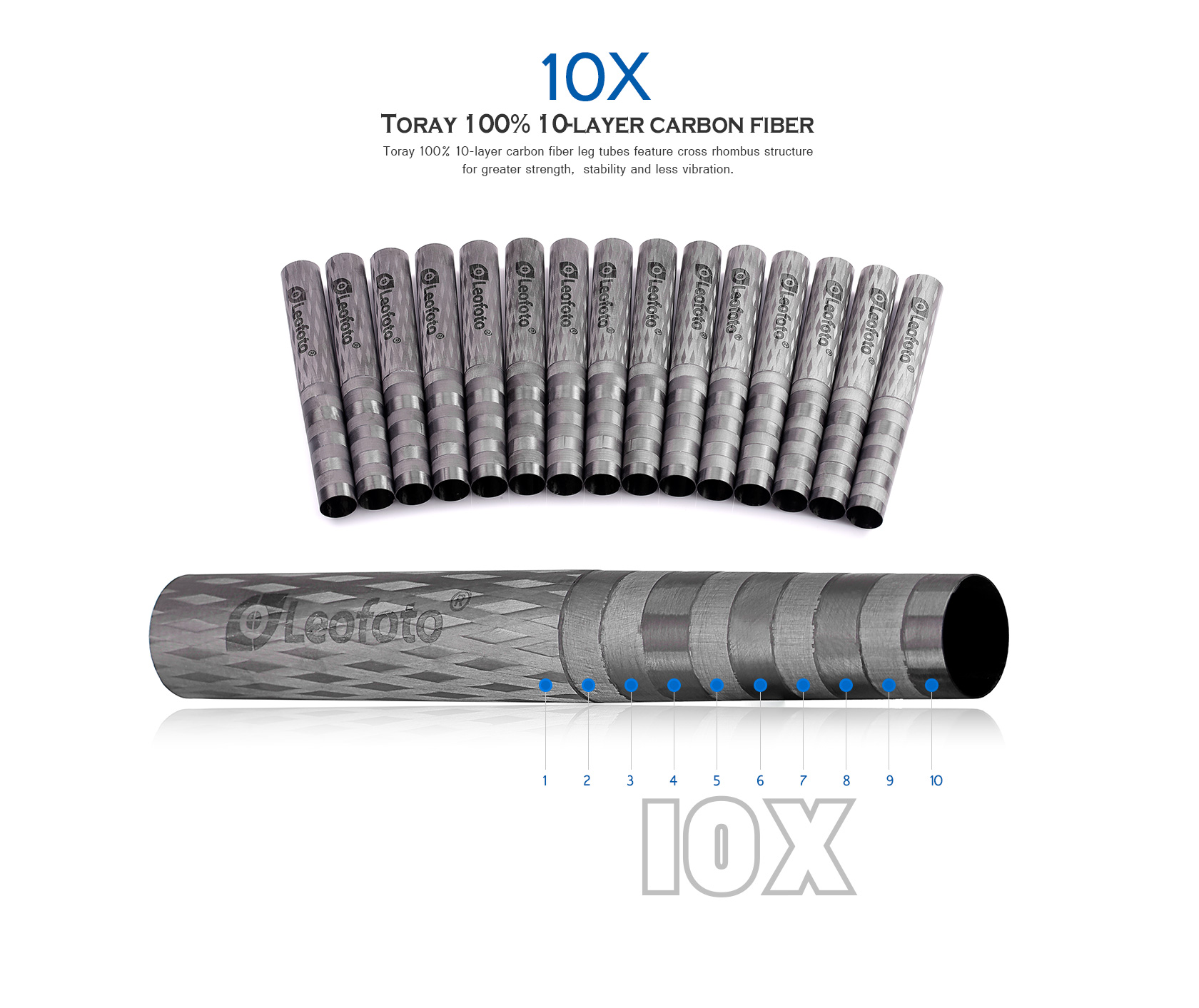 Toray 100% 10-layer carbon fiber leg tubes feature cross rhombus structure for greater strength, stability and less vibration.