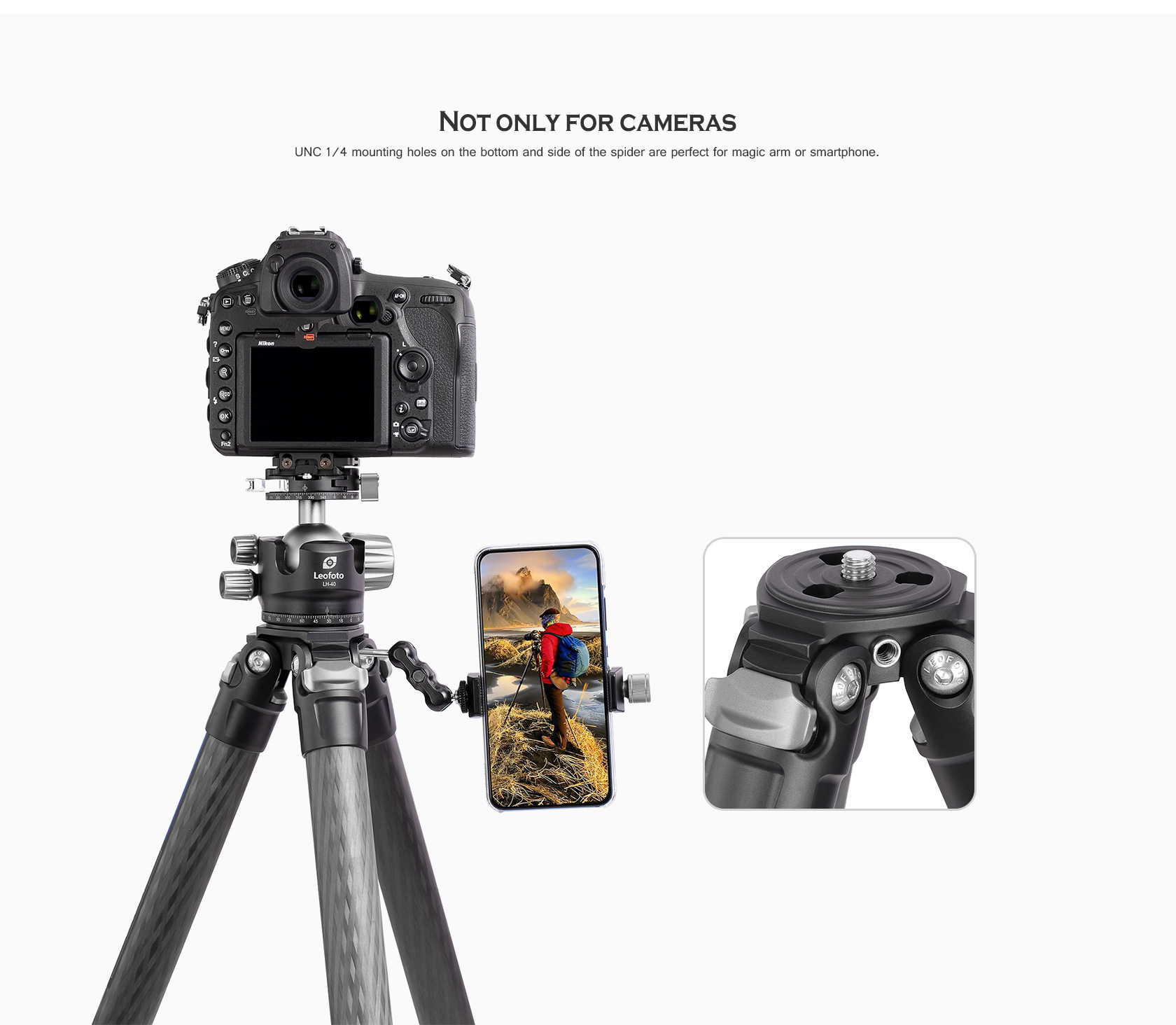 UNC 1/4 mounting holes on the bottom and side of the spider are perfect for magic arm or smartphone.