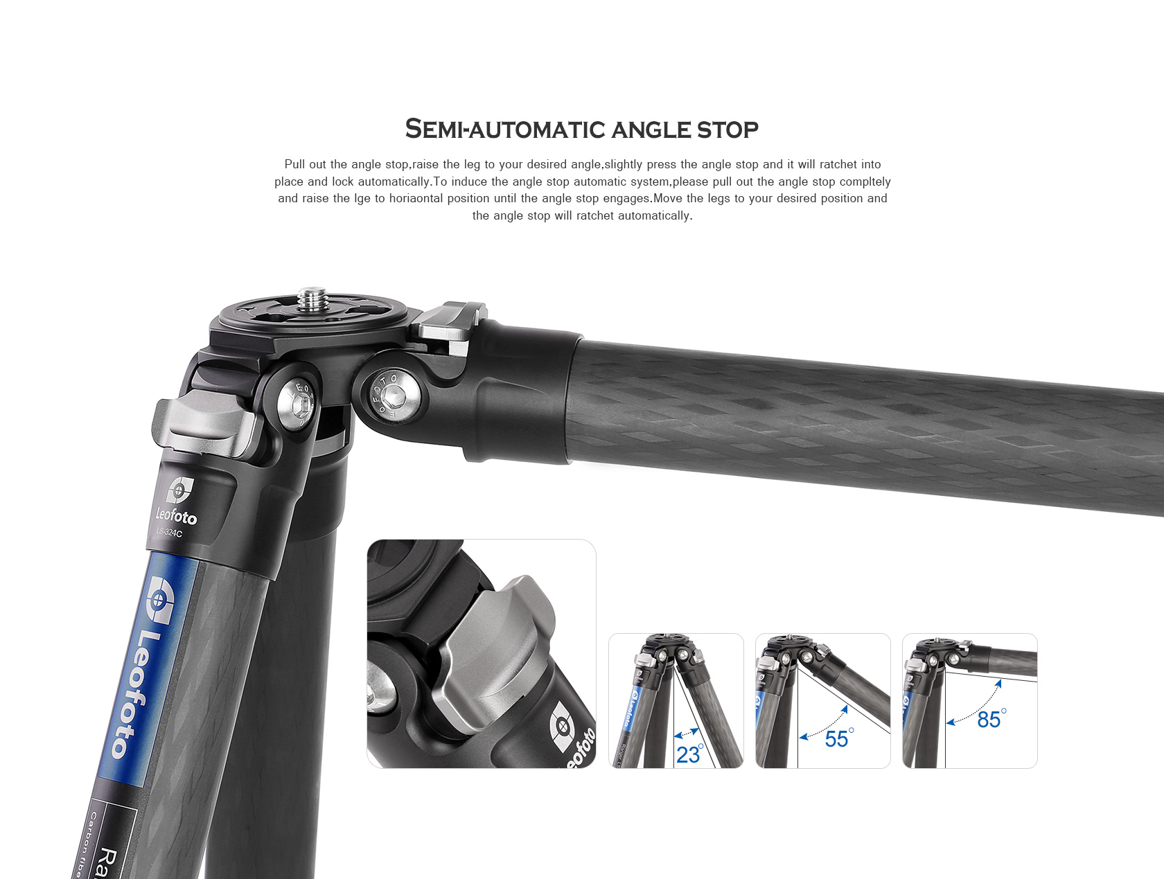 Pull out the angle stop,raise the leg to your desired angle,slightly press the angle stop and it will ratchet into place and lock automatically.To induce the angle stop automatic system,please pull out the angle stop compltely and raise the lge to horiaontal position until the angle stop engages.Move the legs to your desired position and the angle stop will ratchet automatically.
