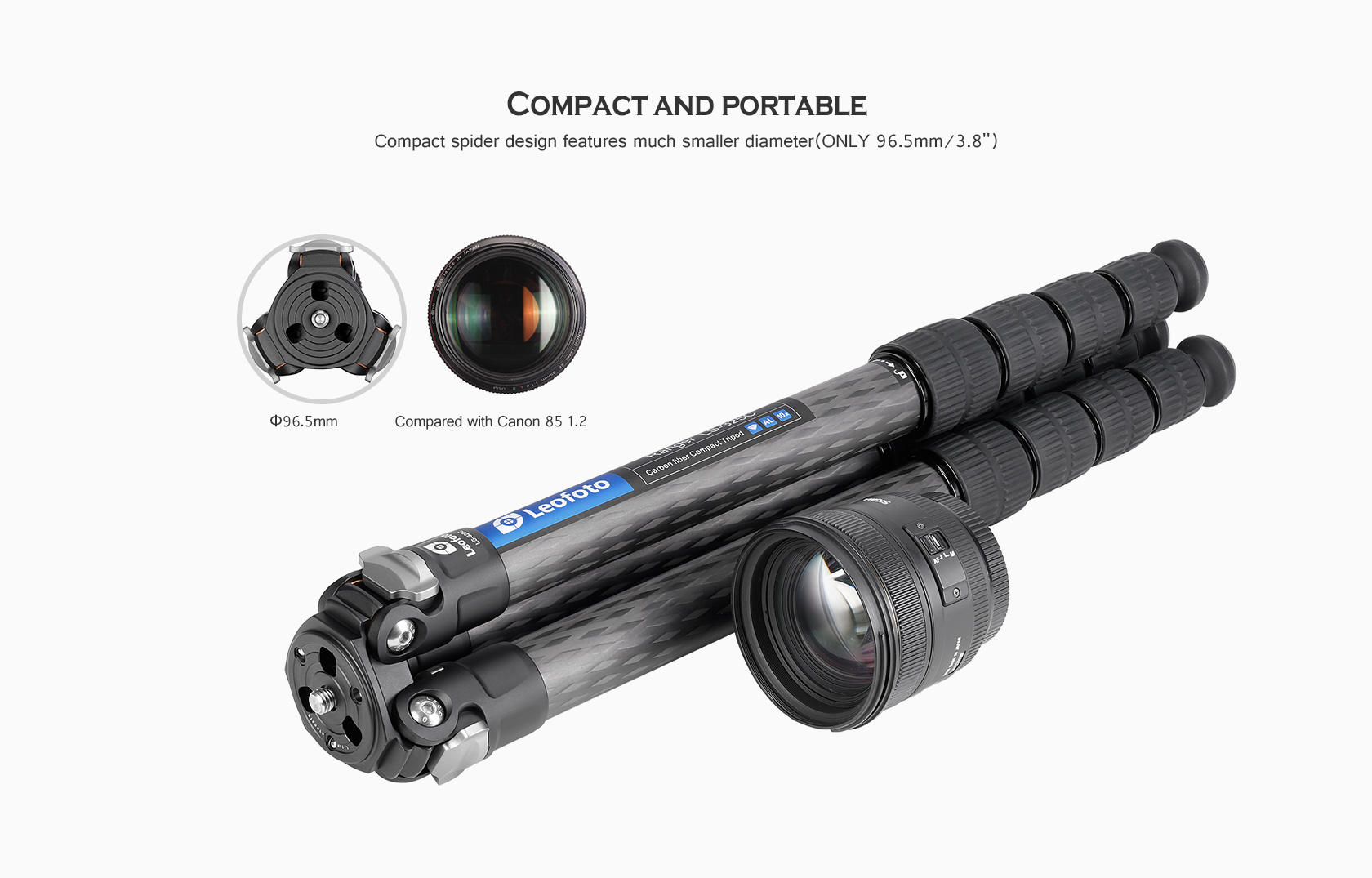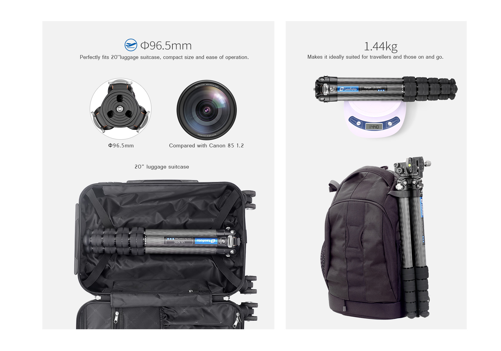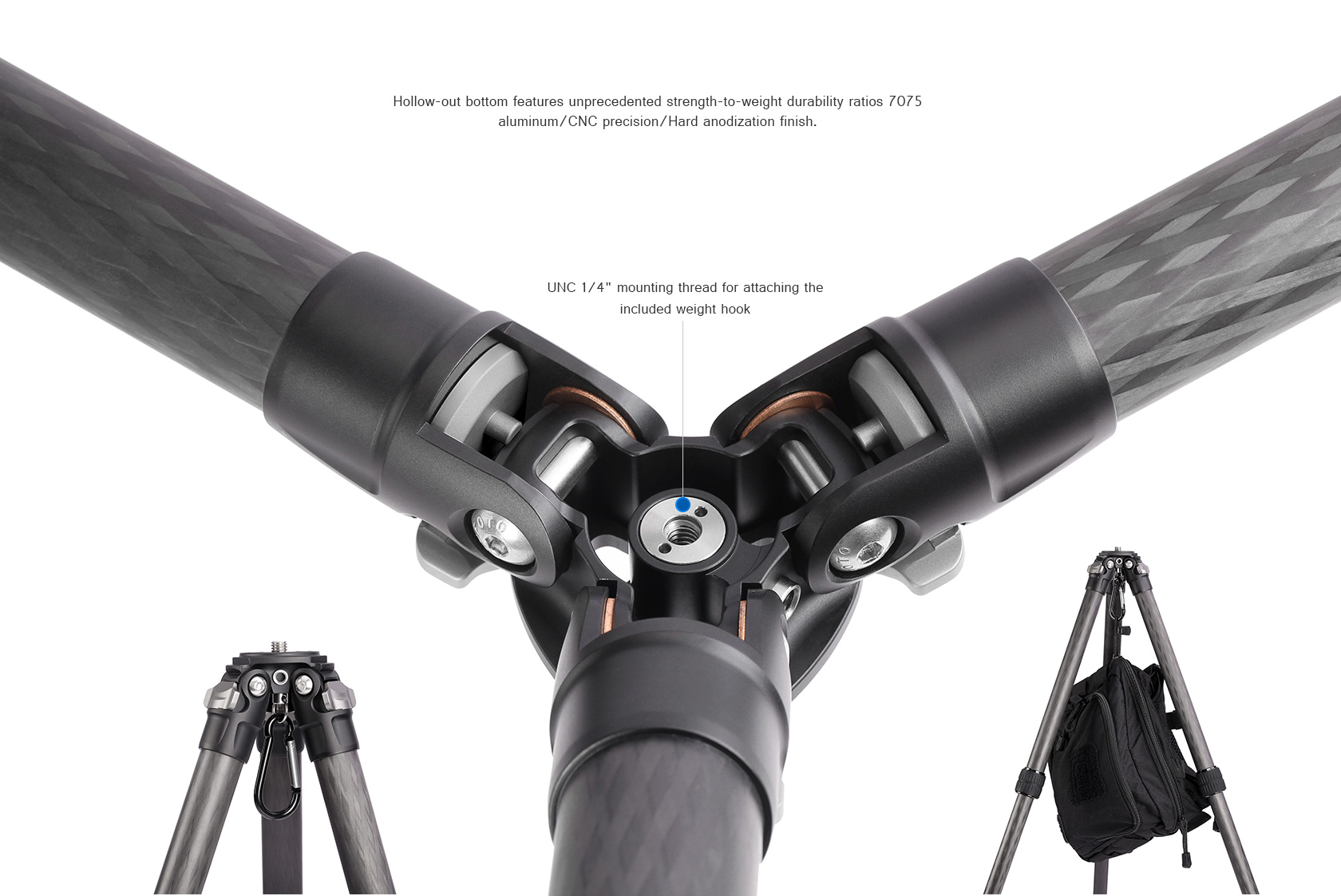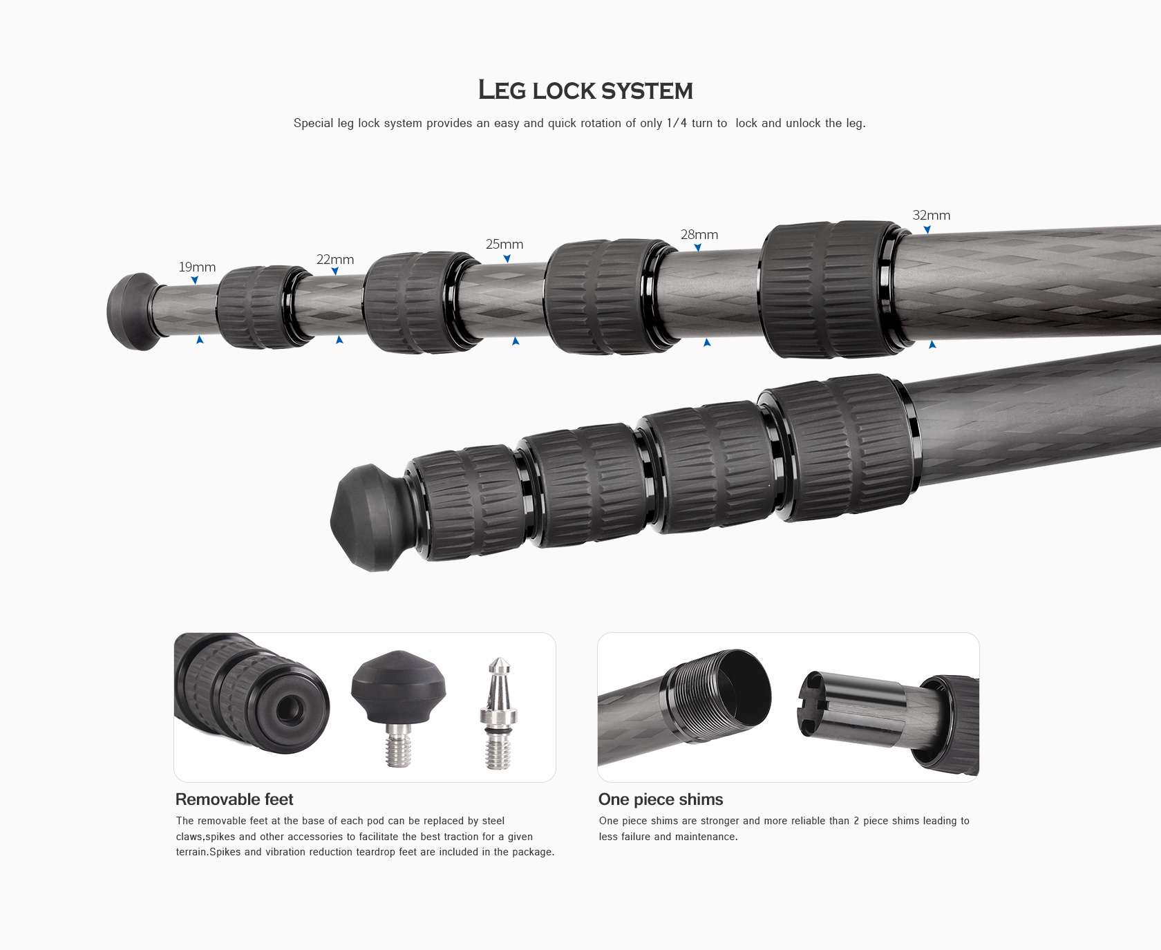 Toray 100% 10-layer carbon fiber leg tubes feature cross rhombus structure for greater strength, stability and less vibration.