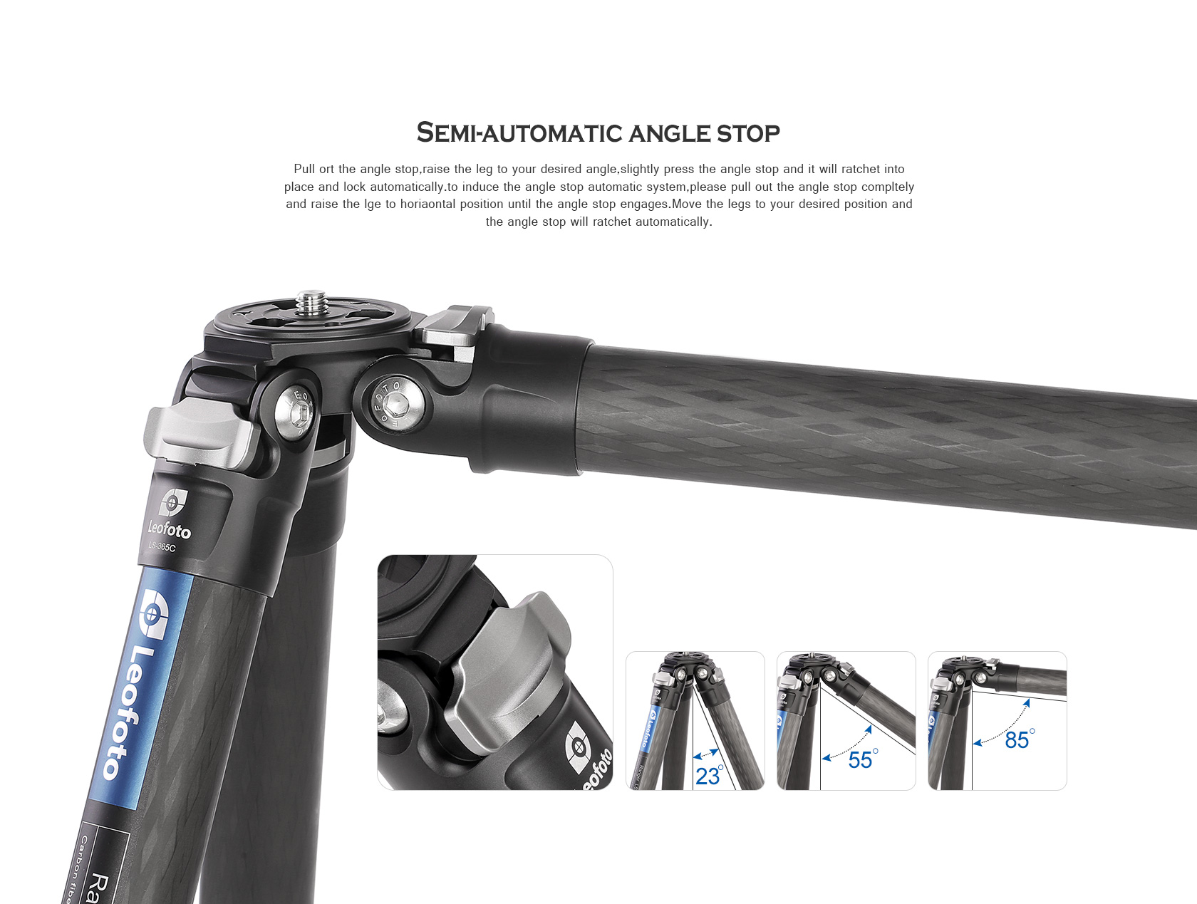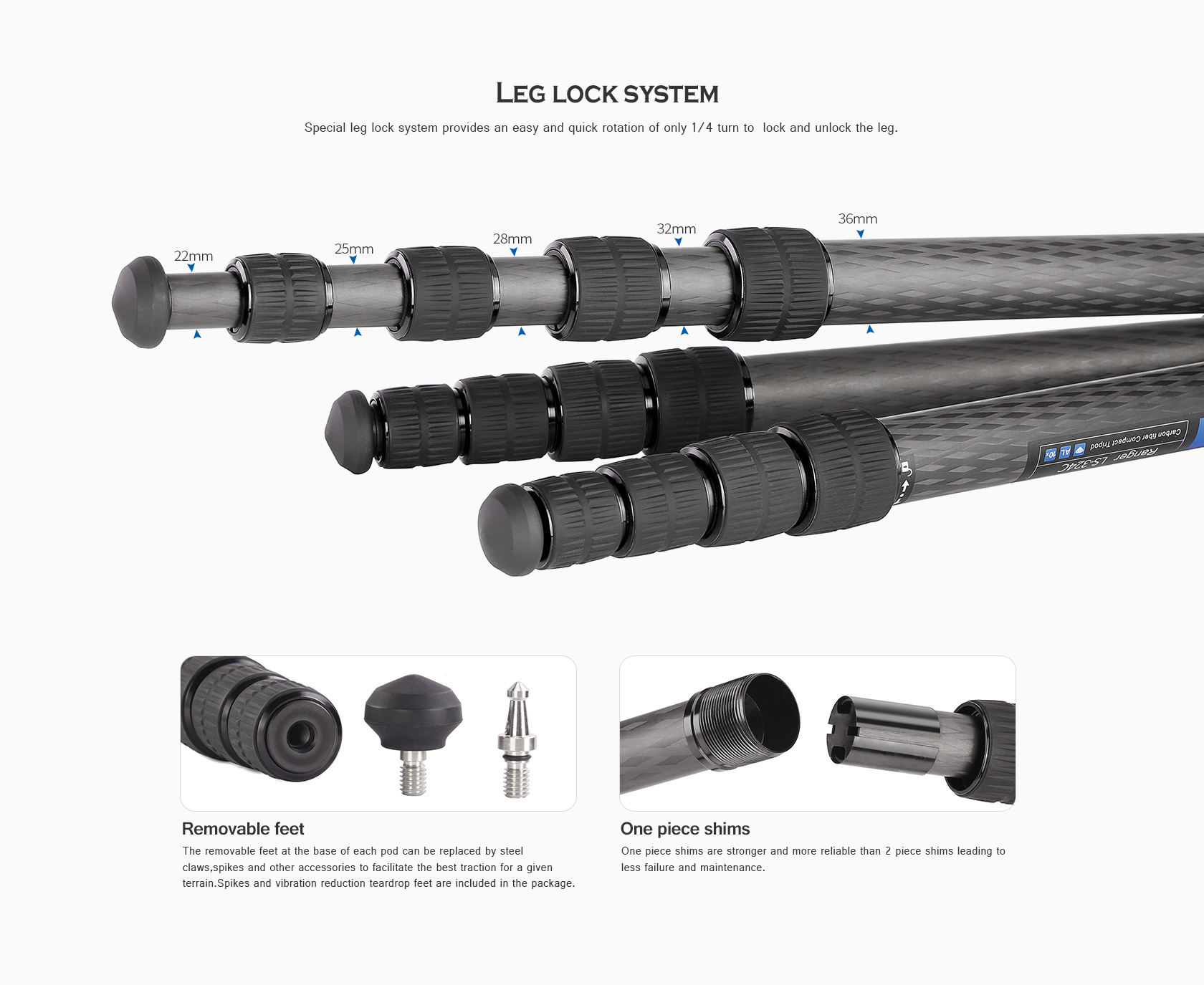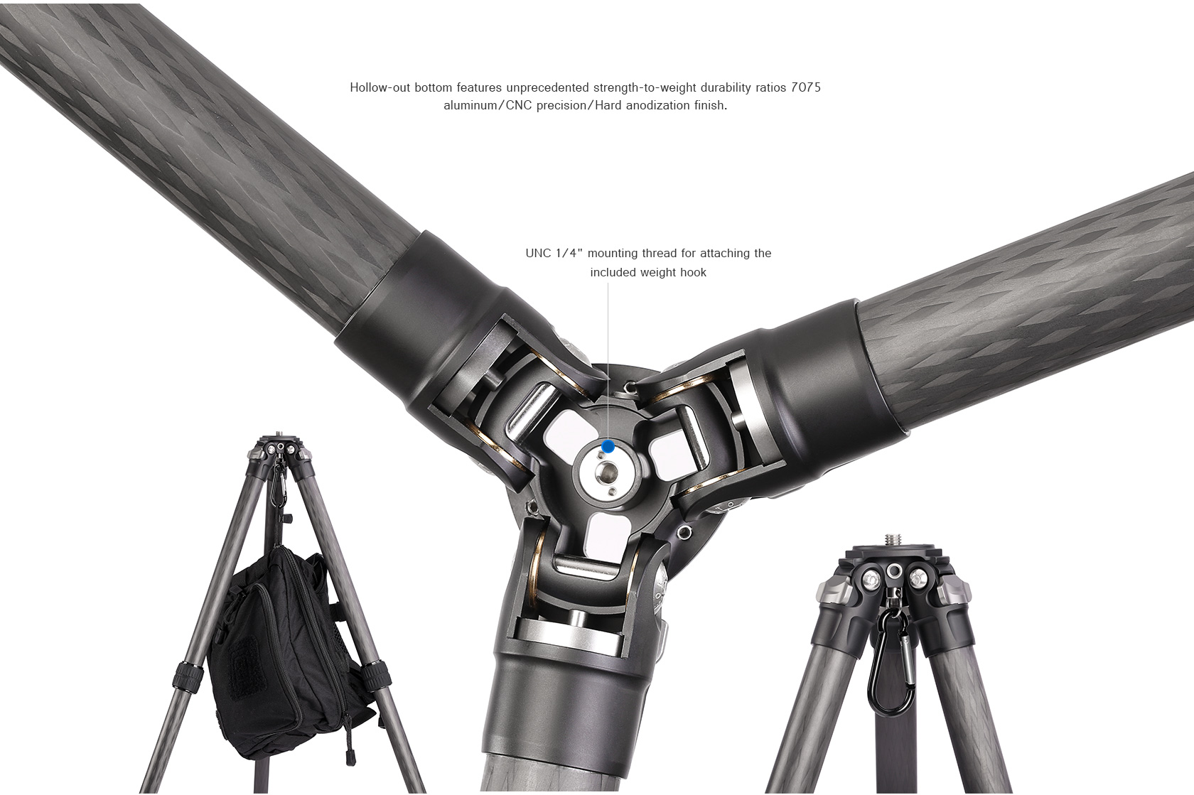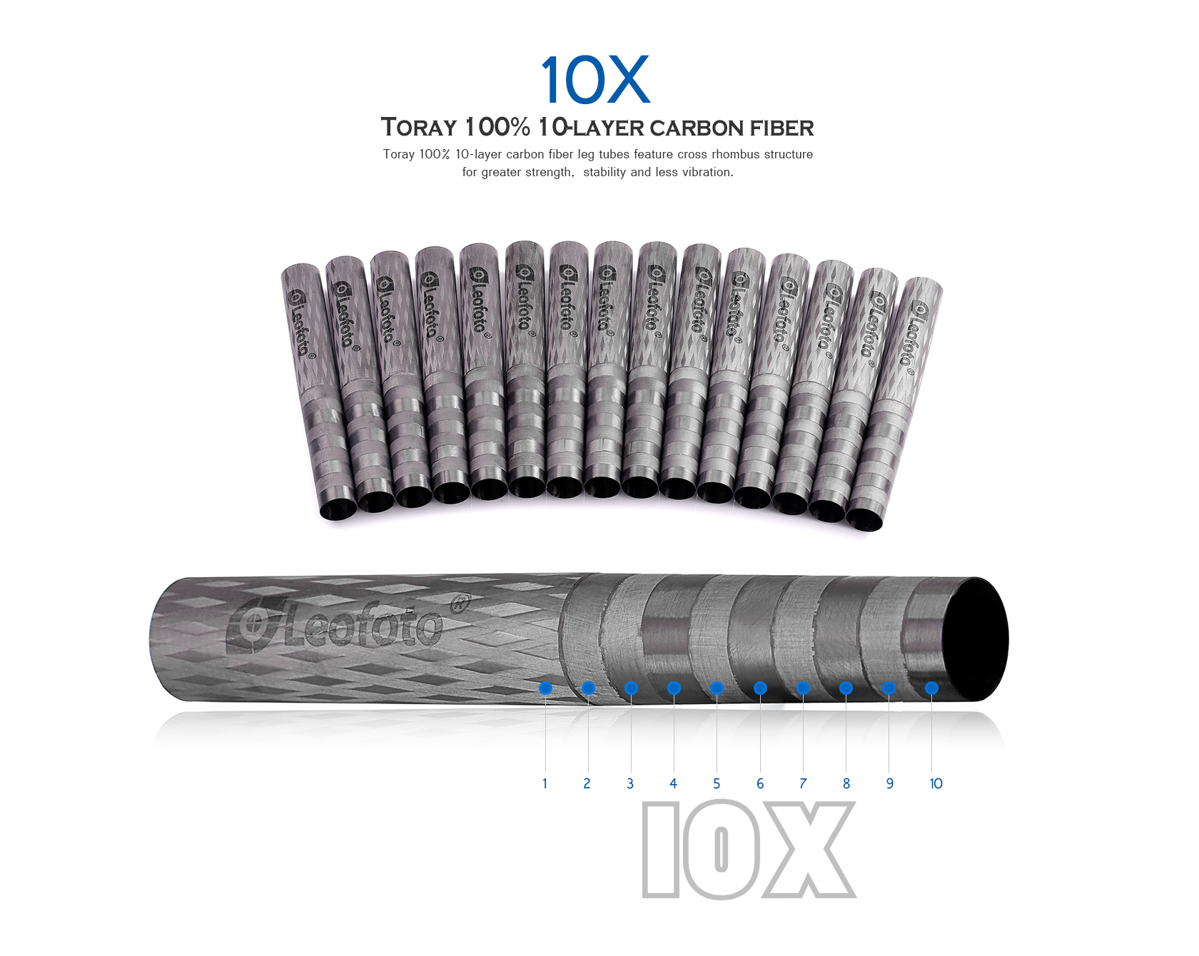 Toray 100% 10-layer carbon fiber leg tubes feature cross rhombus structure for greater strength, stability and less vibration.