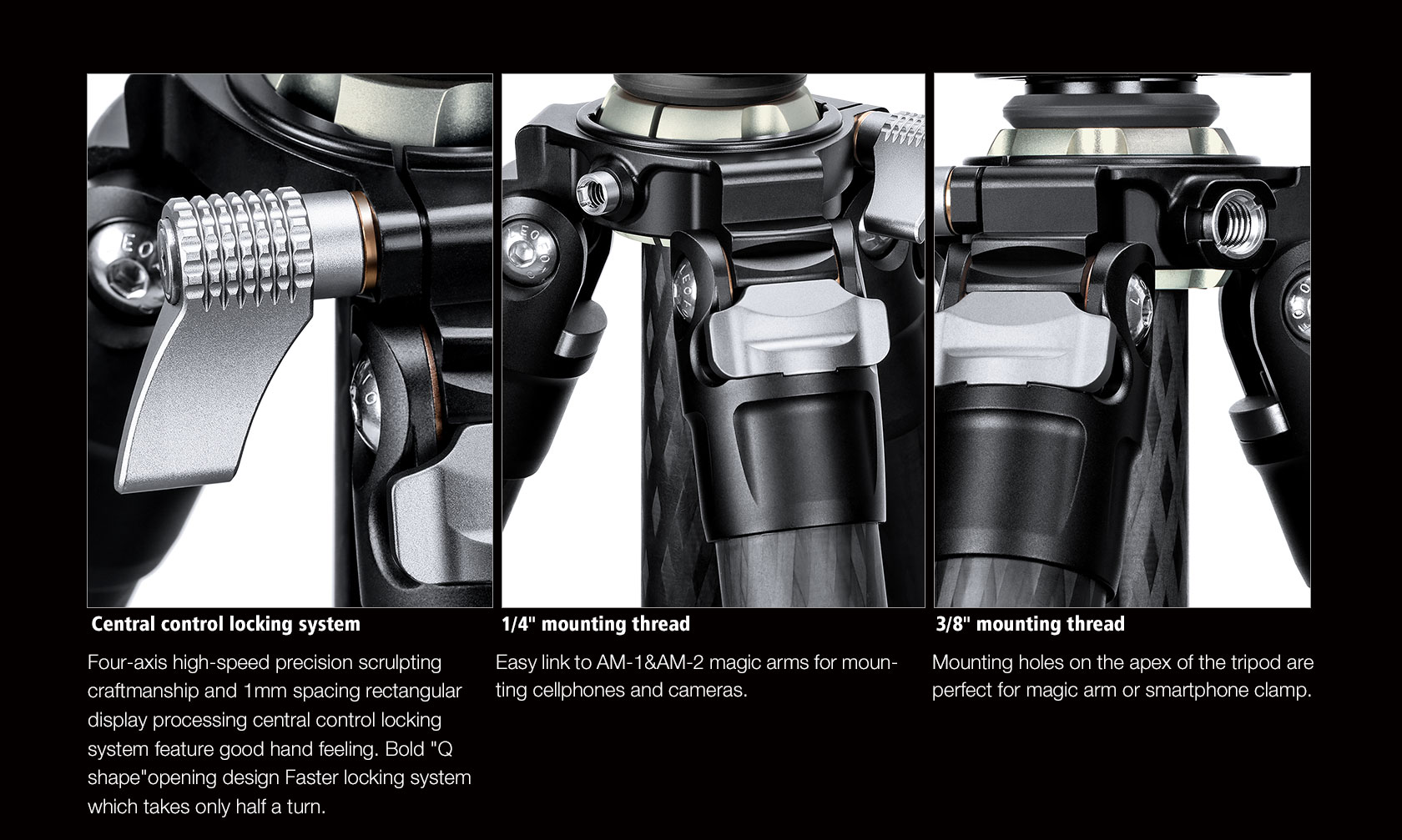 The Leofoto LV Series Carbon Fiber Video Tripod features a unique hollow ball design, which allows the center column to be free of linear vertical movement limitations, making it adjustable like a ball head. This feature, combined with the independent leg spread, allows for quick leveling on uneven terrain. This is particularly useful when shooting outdoors, where the ground is often uneven and unstable.