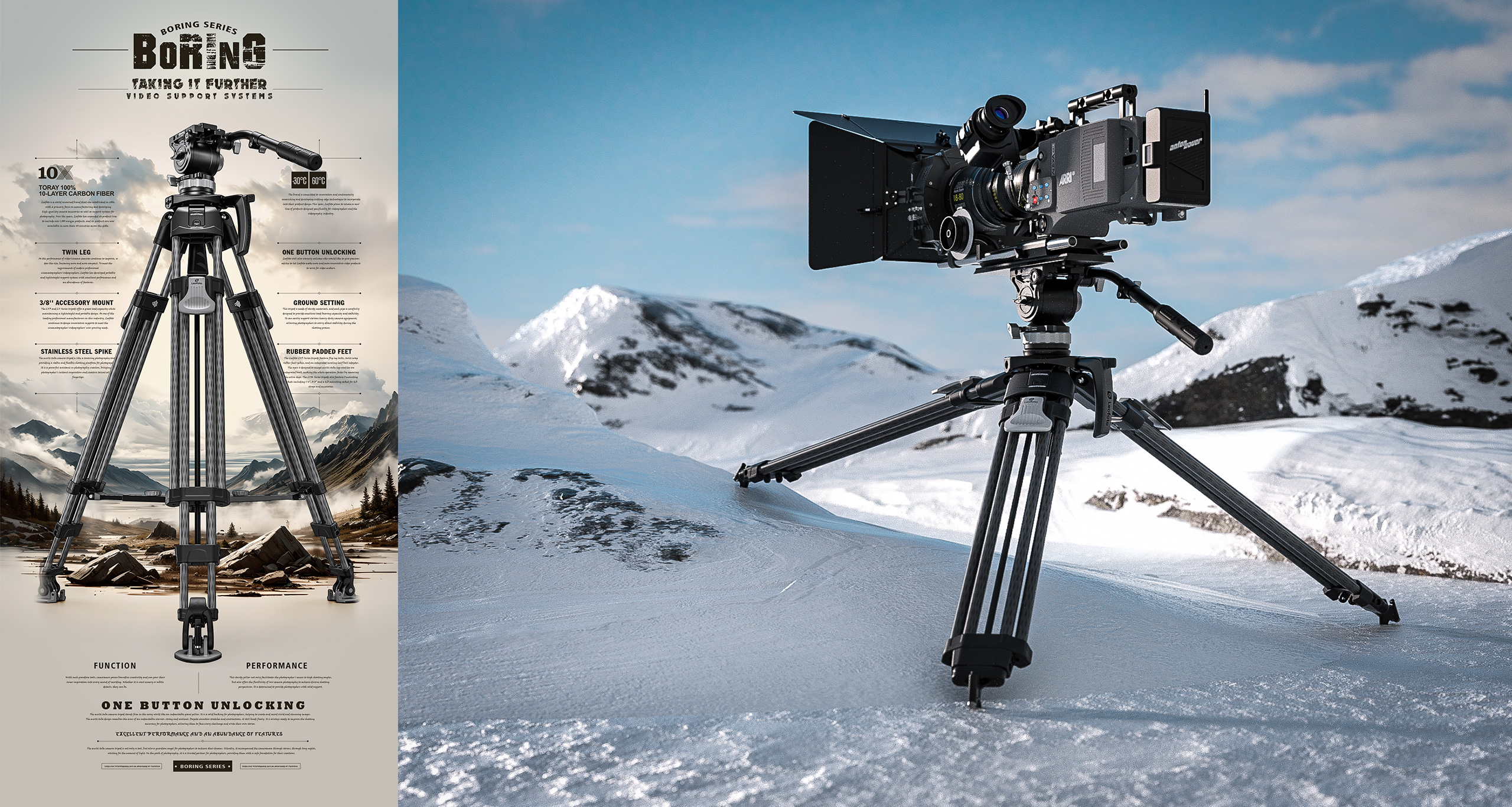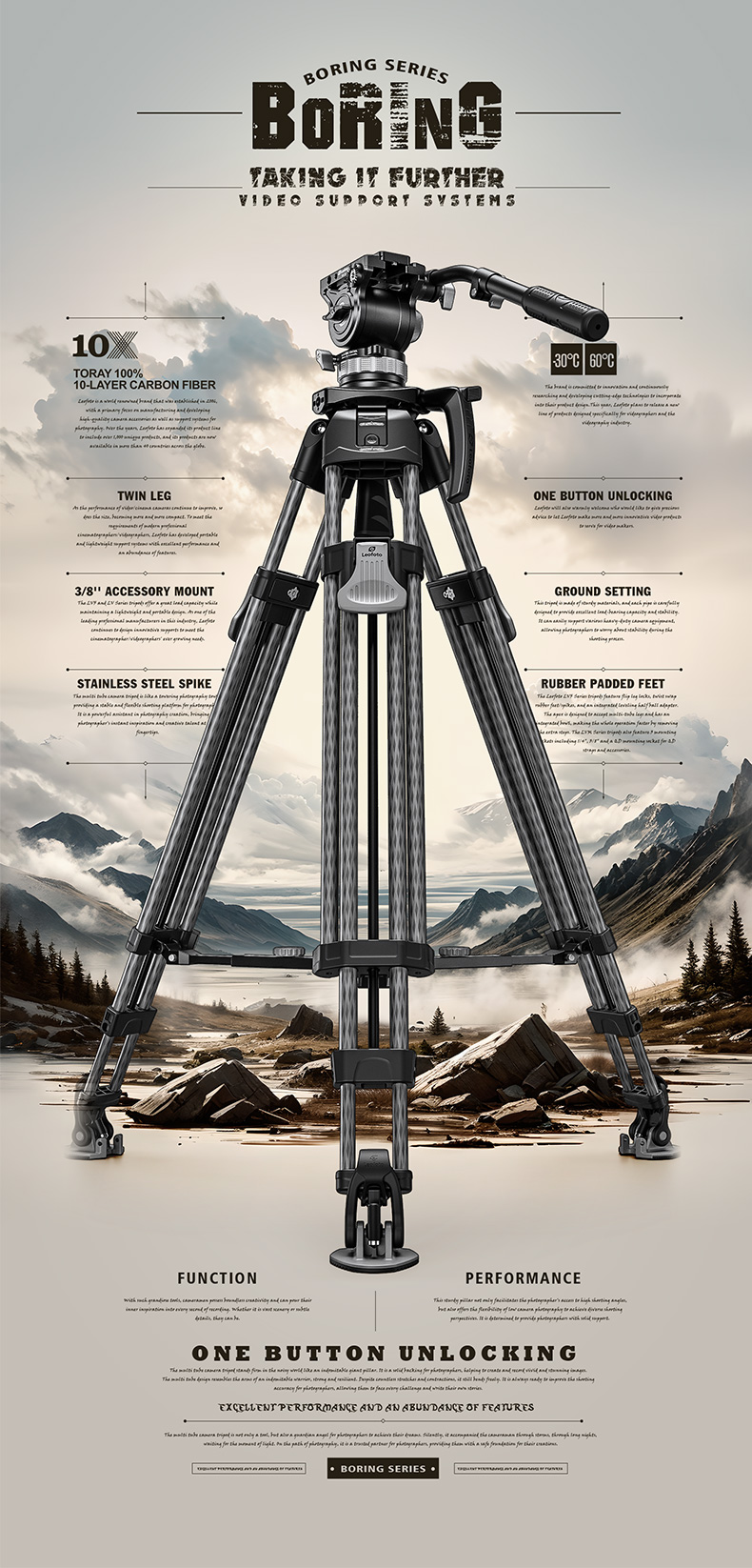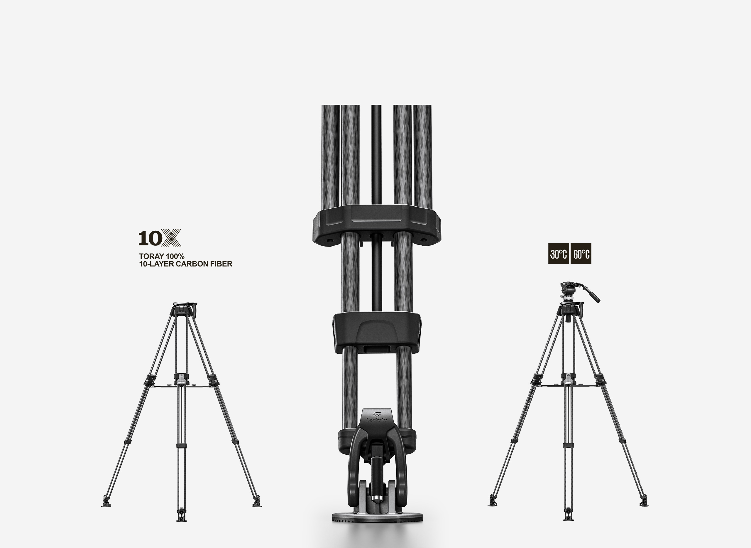 The Leofoto LVF Series tripods feature dual leg tubes which offer greater rigidity and stability with two points of connection to the apex, the perfect choice for high-end cinematography and video. Traditional video tripods only come with a middle spreader system, but the LVF Series comes with an adjustable spreader system which enables the user to switch between a ground and mid-level spreader adding flexibility. These tripods are made of carbon flber for light weight and have the ability to collapse into a compact size for portability.