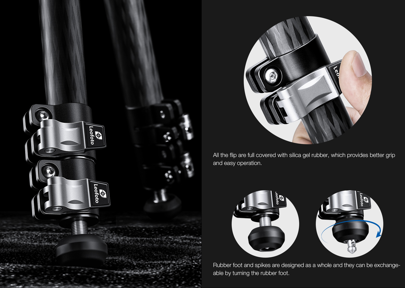 The Leofoto LVM series Video Tripod features flip leg locks, twist swap rubber feet/spikes, and an integrated 75mm video bowl with leveling half ball adapter, making it faster and easier to use. It also features 3 accessory mounting sockets including 1/4″, 3/8″ and a QD mounting socket for QD straps and accessories.