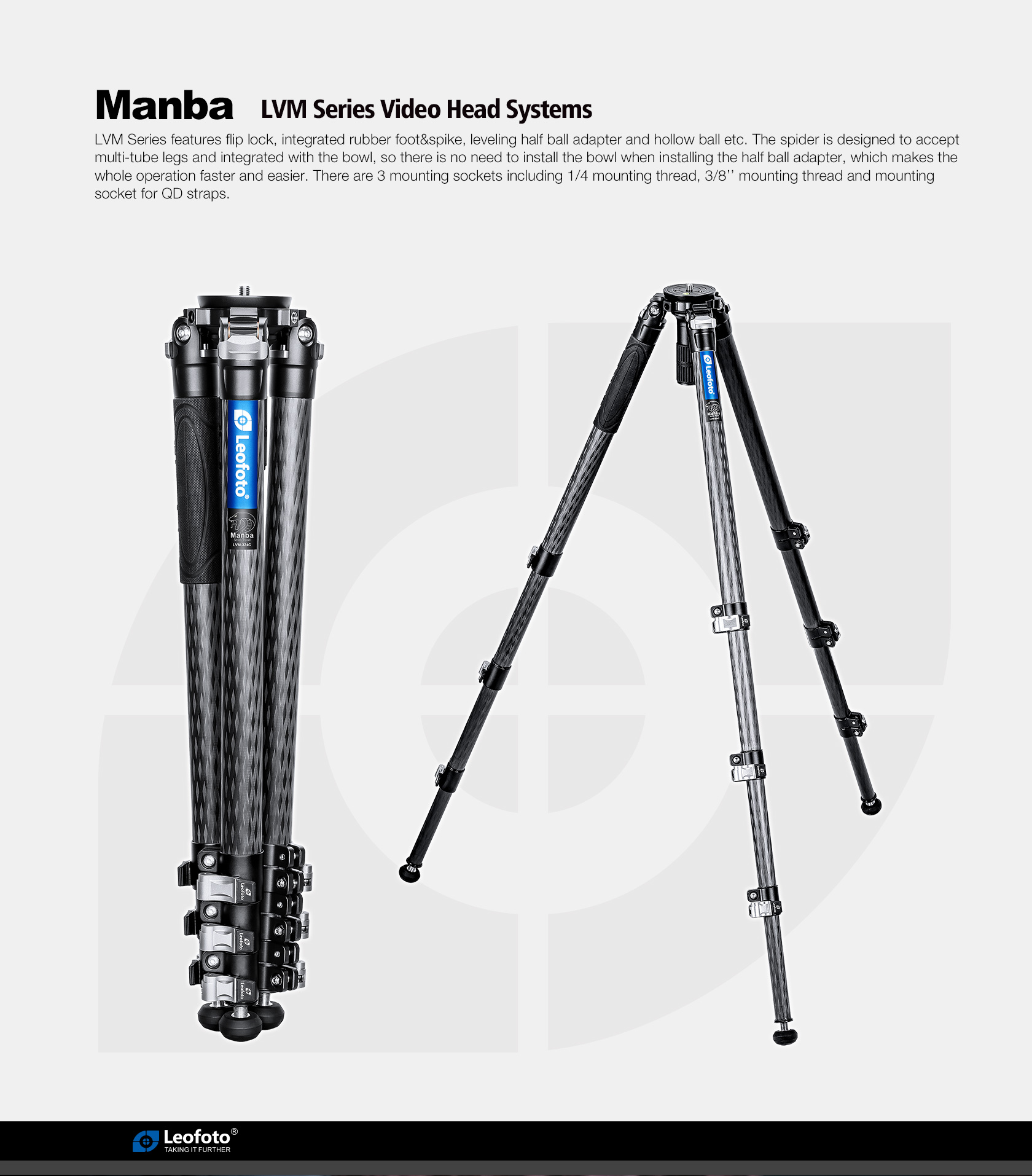 The Leofoto LVM series Video Tripod features flip leg locks, twist swap rubber feet/spikes, and an integrated 75mm video bowl with leveling half ball adapter, making it faster and easier to use. It also features 3 accessory mounting sockets including 1/4″, 3/8″ and a QD mounting socket for QD straps and accessories.