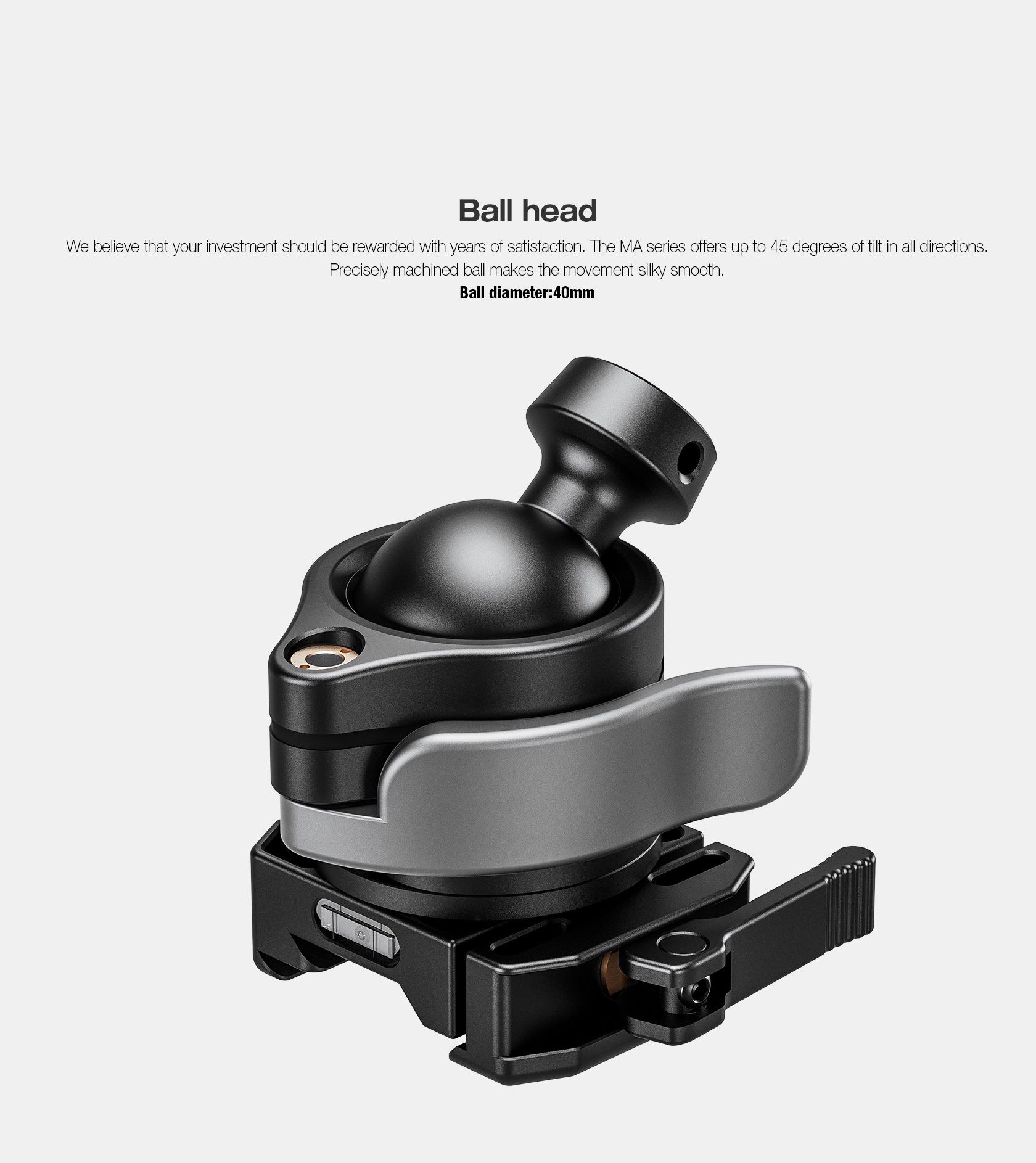 The head has a lever release to lock/unlock the ball and a redesigned lever-release clamp system with an adjustable clamping width.