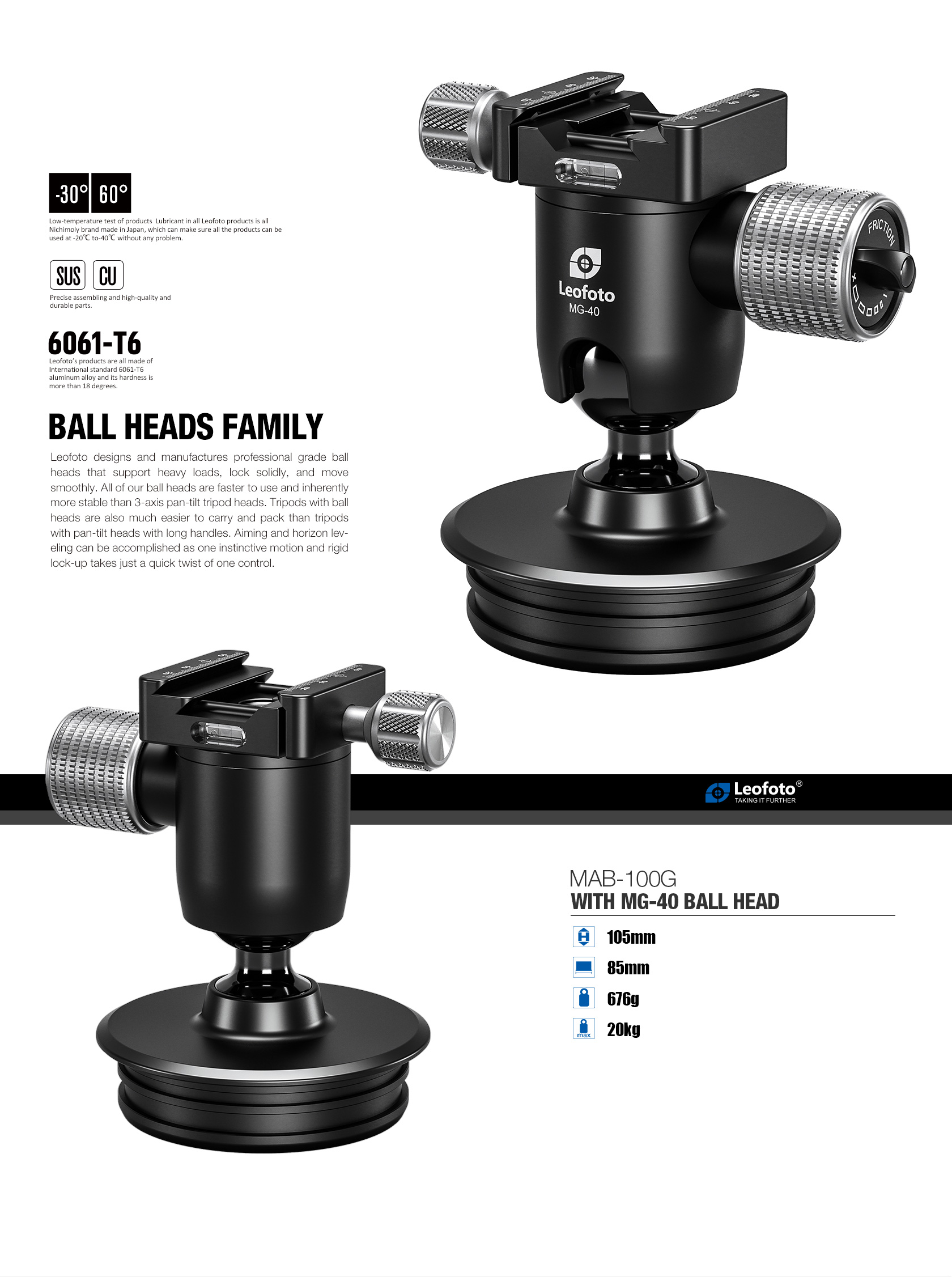The Leofoto MAB-100G Precision Rifle Ball Head with 100mm Systematic Adapter is machined from solid aircraft grade aluminum and hard anodized for the optimal strength and durability. The MAB-100G is designed to be used with 100mm compatible systematic tripod apexes. It features a redesigned lever-release arca clamp as well as a lever controlled ball. The redesigned clamp comes with an adjustable clamping width. The MAB-100G is essentially an MG-40 ball head attached to a 100mm adapter.. The systematic adapter can only be placed into a 100mm systematic tripod apex.