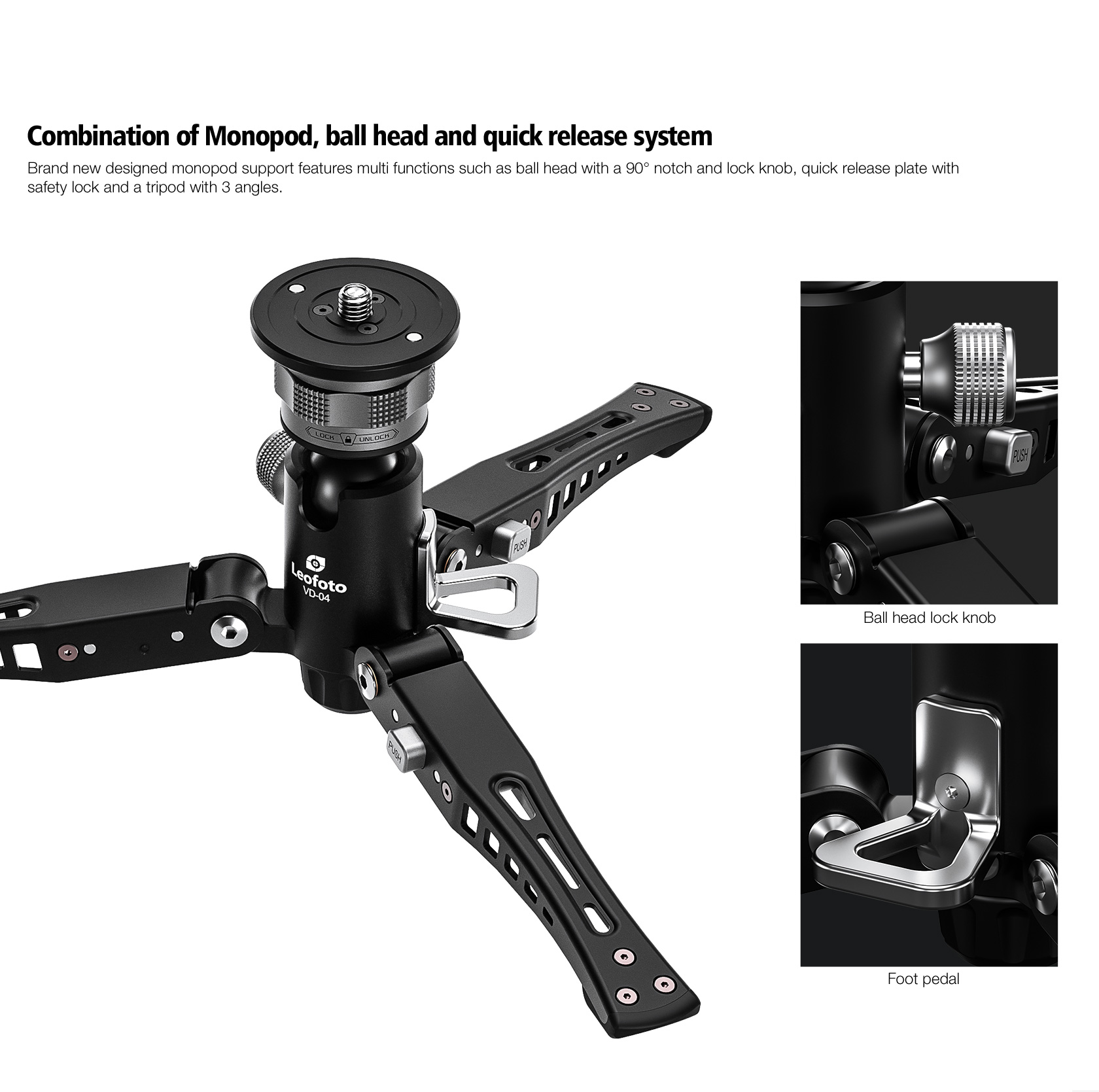 The VD-04 base enhances functionality with a foot pedal, allowing quick adjustments without using hands. Its 3 legs can be set at three different angles to customize height and stability, while the lockable ballhead provides smooth articulation. Additionally, the base includes a removable rubber foot that can be installed on the monopod for use as a standard monopod without the base.