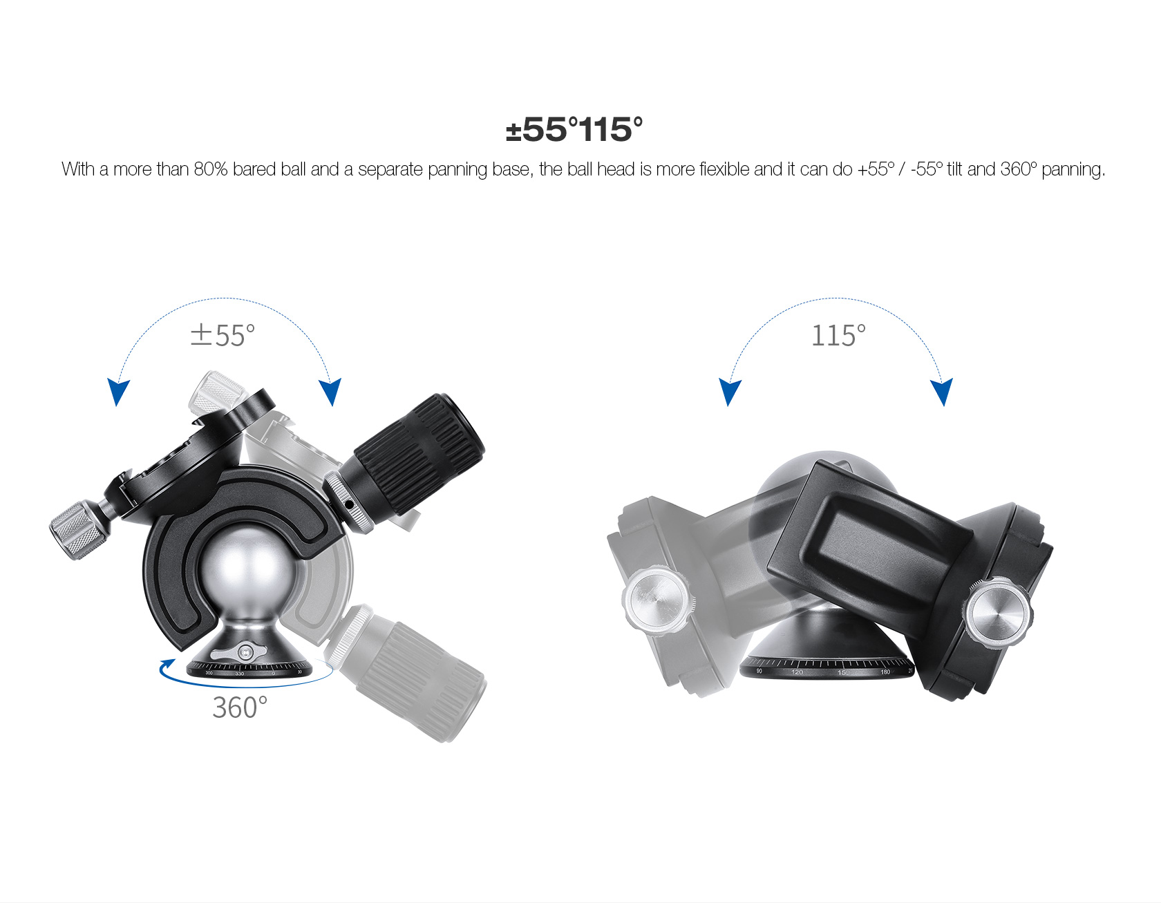 Leofoto MH-35 Full Dynamic Ball Head with Handlebar Control is designed for photographers, shooters, hunters, and military applications. It features a motorcycle throttle-style main knob for rapid adjustment. With a more than 80% bared ball, it can provide a +/-55° tilt range, and the separate panning base features an independent locking knob and full 360° rotation. The friction tension can be adjusted and locked in place on the main control knob, which can extend in length from 70 to 92mm for finer control and improved ease of use when wearing gloves in cold conditions. The precision-machined 1.4″-diameter ball makes movement silky smooth, while providing a robust load capacity of 39.7 pounds.