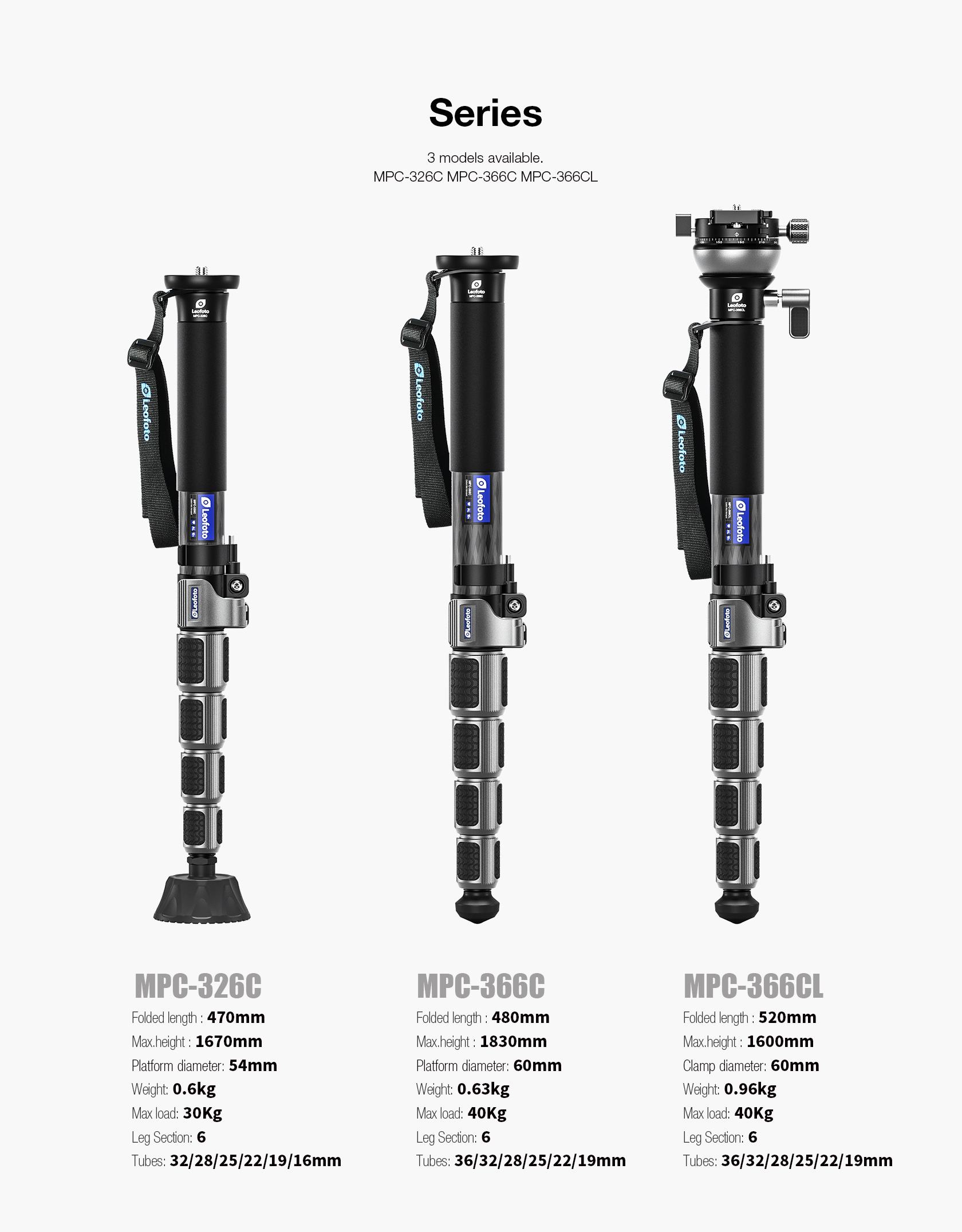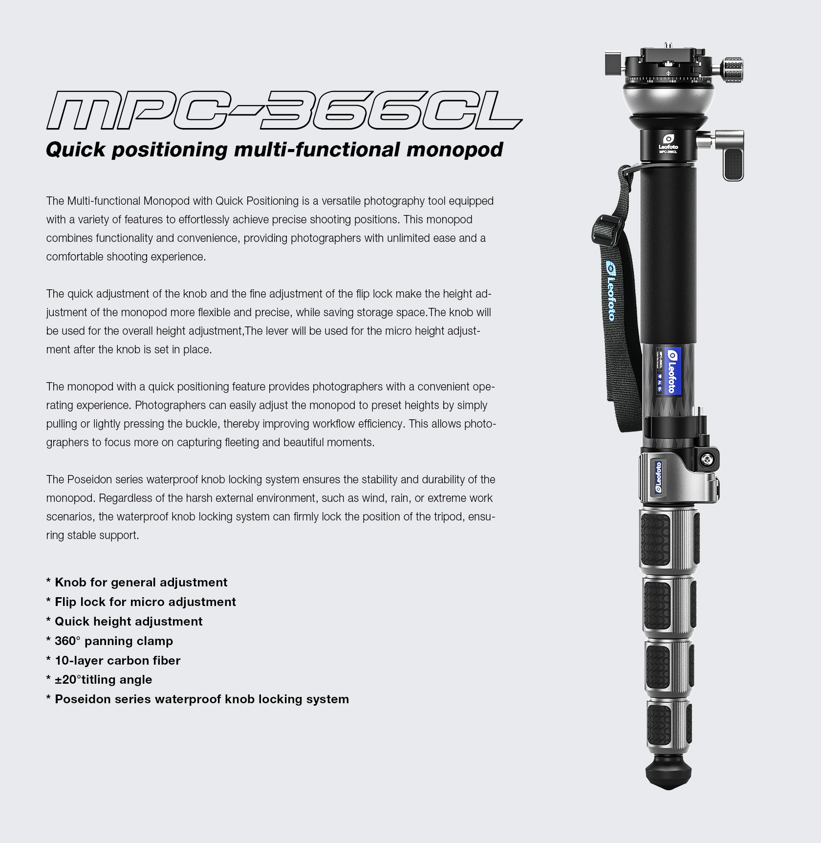 The newly designed Leofoto MPC Series Carbon Fiber Quick Positioning Multi-functional 6-section Monopod combines functionality and convenience, providing photographers with unlimited ease and a comfortable shooting experience.