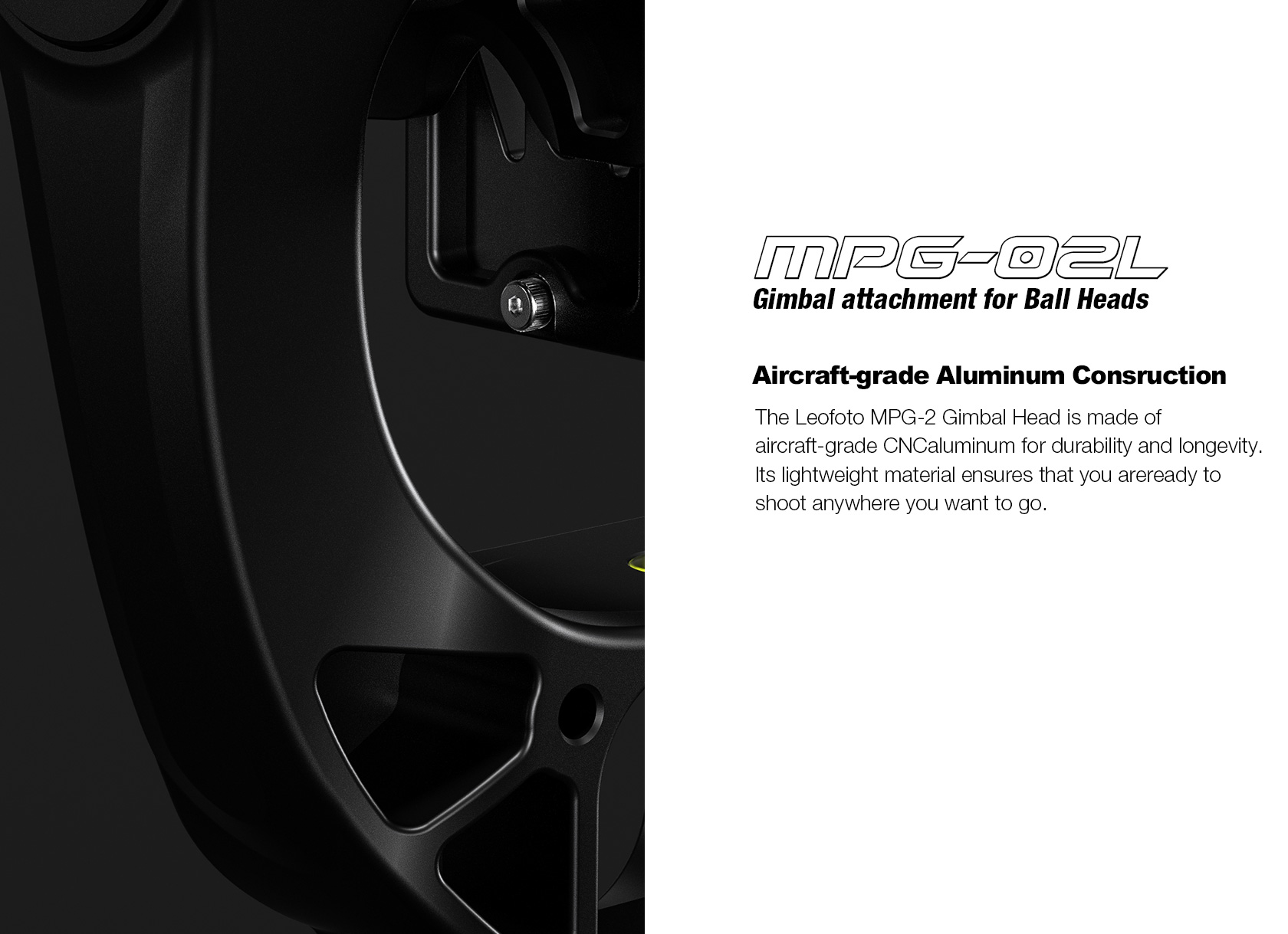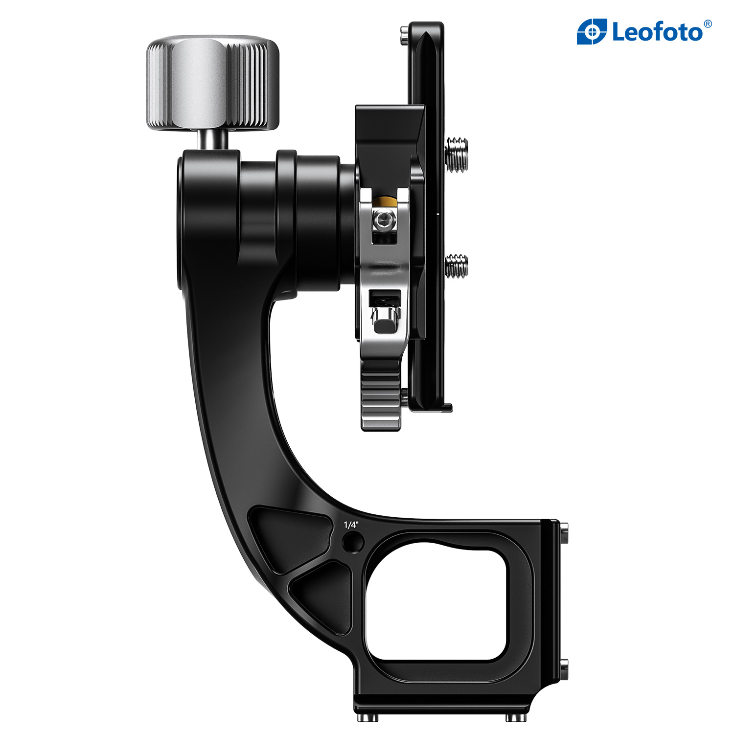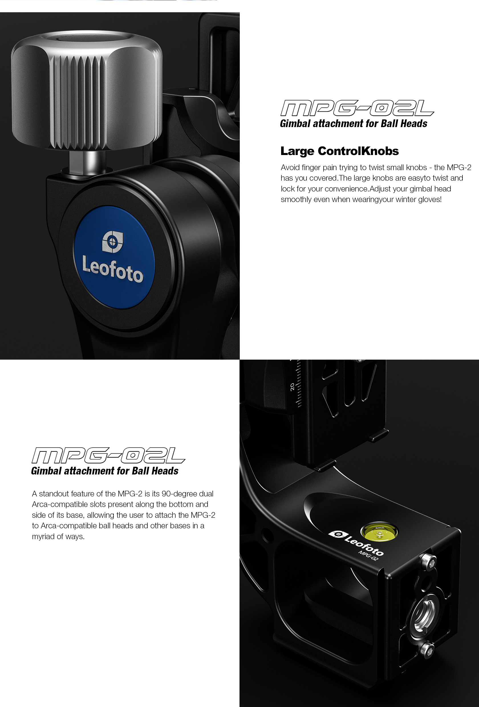 The Leofoto MPG-02/L Gimbal Attachment converts a standard ball head into a gimbal-style setup, crafted from CNC-machined aluminum for durability and precision. It features two Arca-type dovetail bases, a 3/8”-16 threaded mounting socket for broad tripod and monopod compatibility, and a redesigned Arca plate optimized for long lenses, supporting both 1/4” and 3/8” screws.